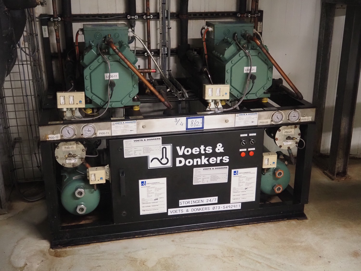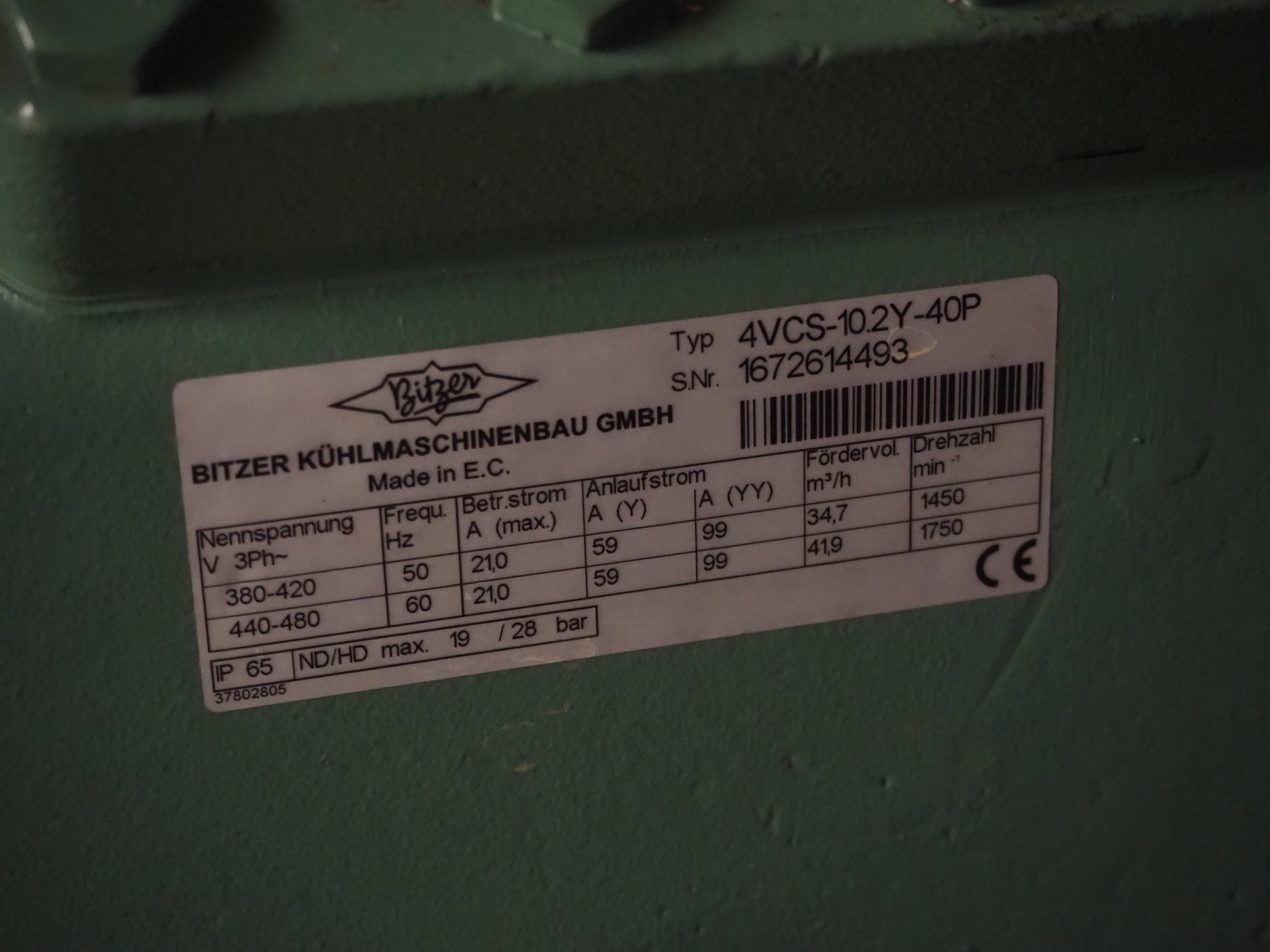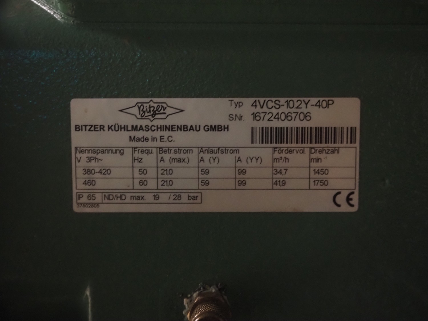 Compressor rack with 2 Bitzer Kühlmaschinenbau GmbH cooling compressors, type: 4VCS-10.2Y-40P, serial number: 1672614493 and 1672406706, dimensions: 1500 mm x 1000 mm x 1100 mm.