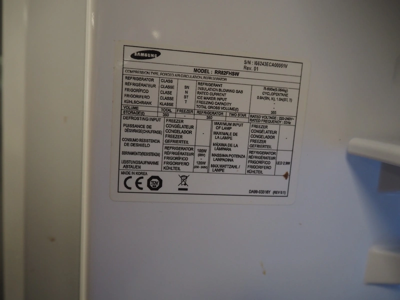 Samsung refrigerator, model: RR82FHSW, serial number: I66243ECA00051V, dimensions: 700 mm x 600 mm x 1800 mm.