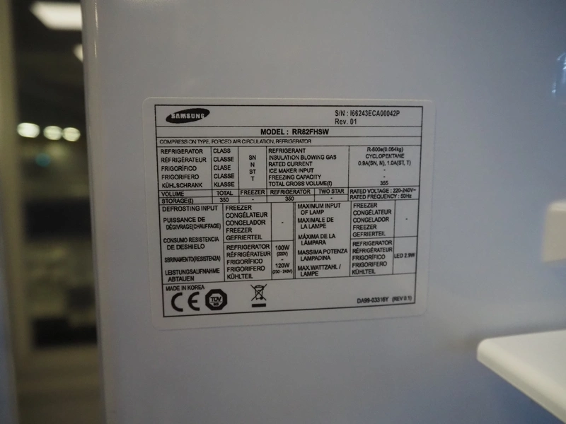 Samsung refrigerator, model: RR82FHSW, serial number: I66243ECA00042P, dimensions: 700 mm x 600 mm x 1800 mm.