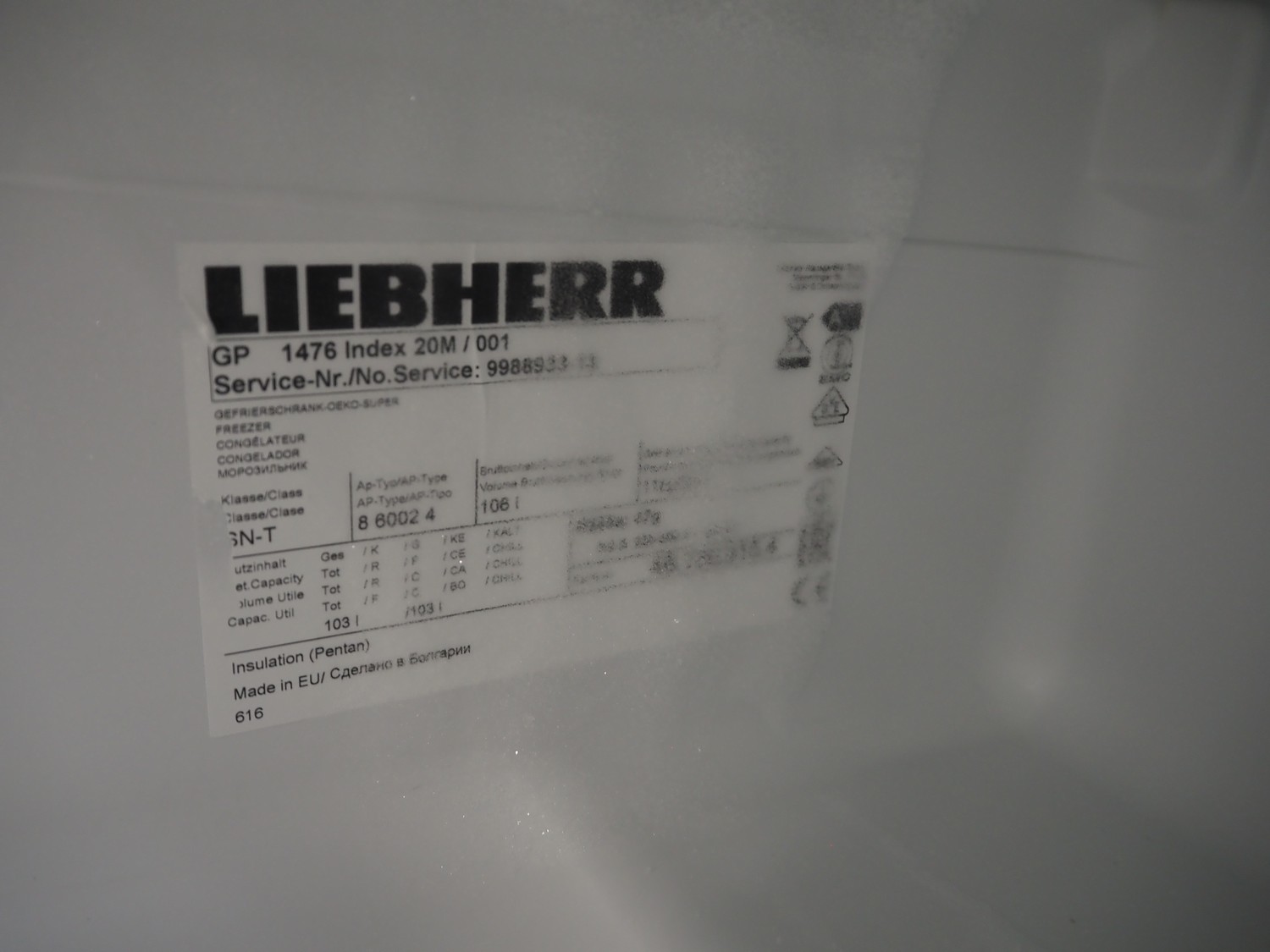 Liebherr freezer, type: GP 1476 Index 20M/001, dimensions: 700 mm x 600 mm x 860 mm.