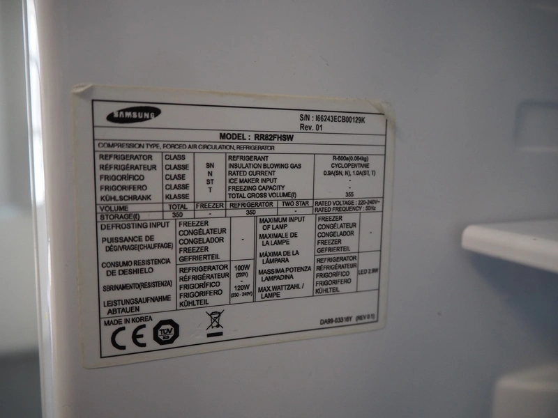 Samsung refrigerator, model: RR82FHSW, serial number: I66243ECB00129K, volume: 355 litre, dimensions: 670 mm x 600 mm x 1700 mm.