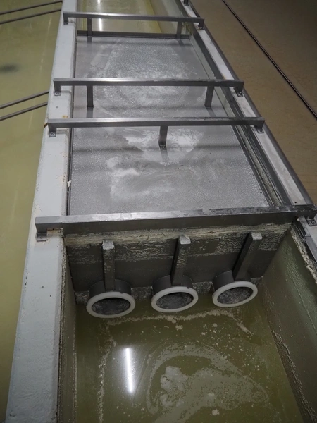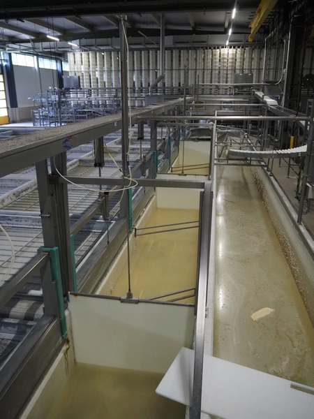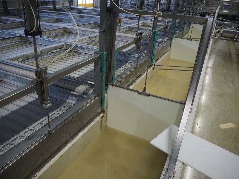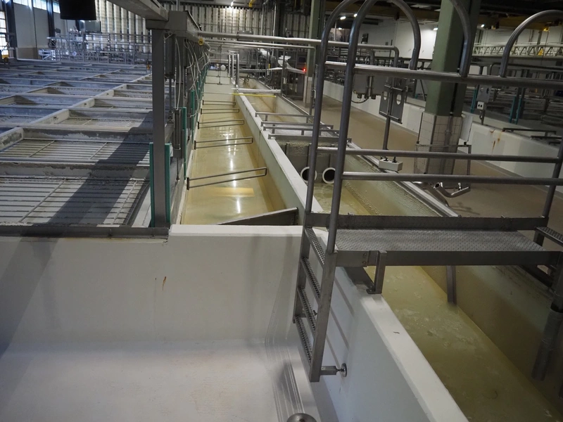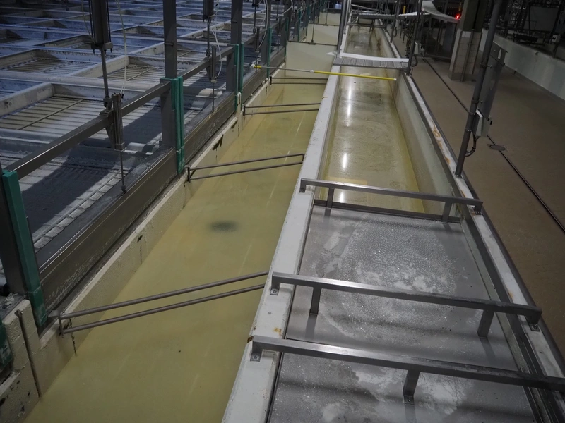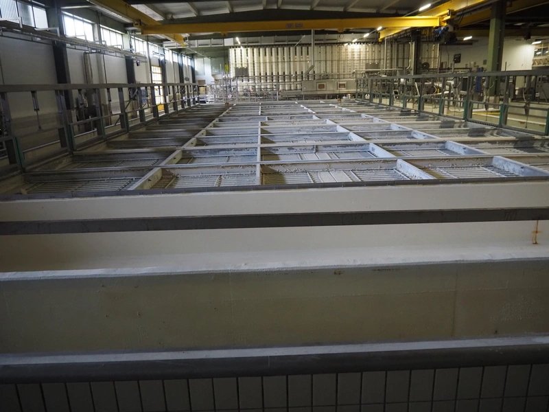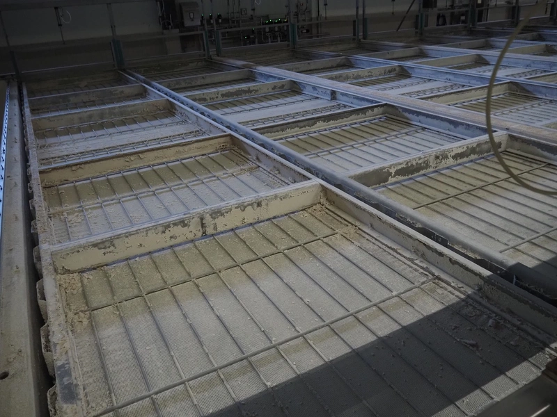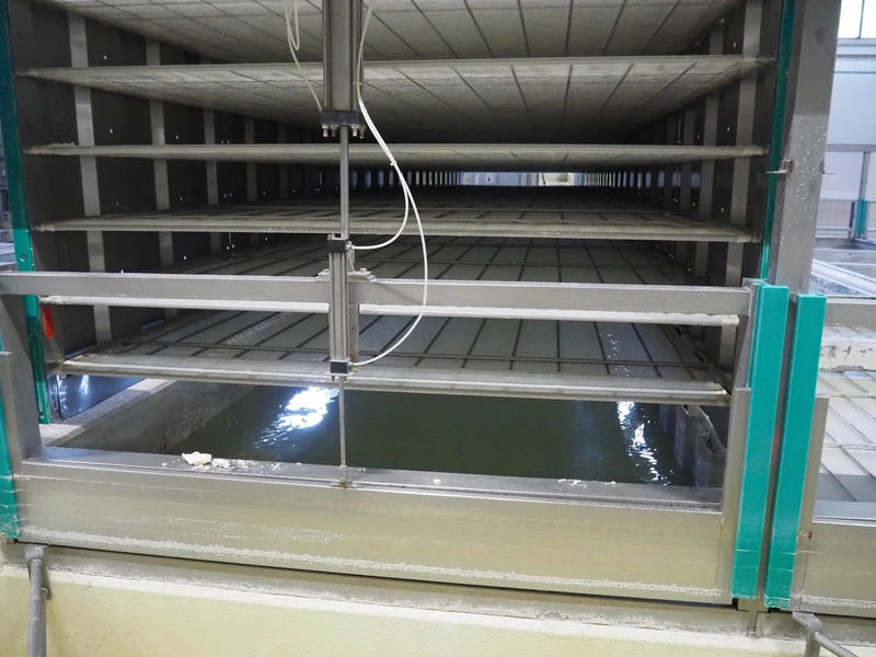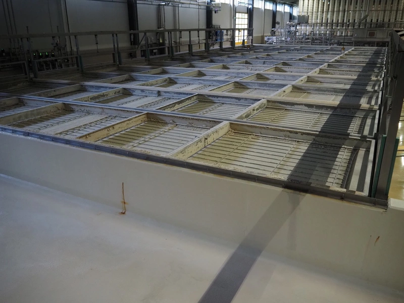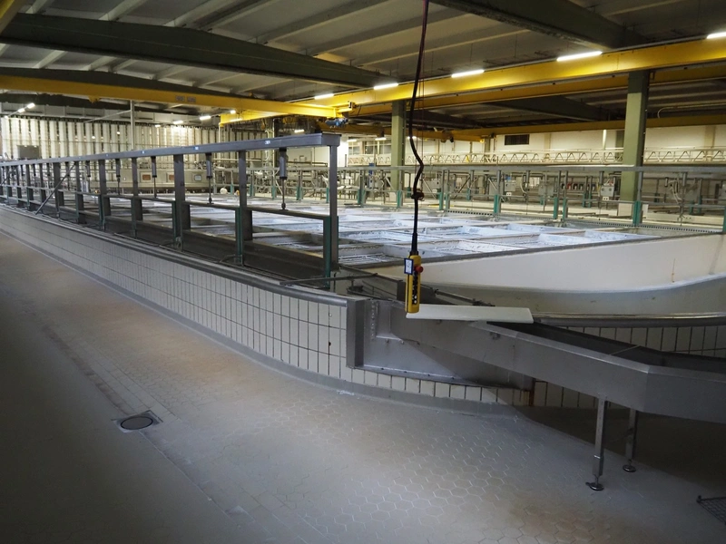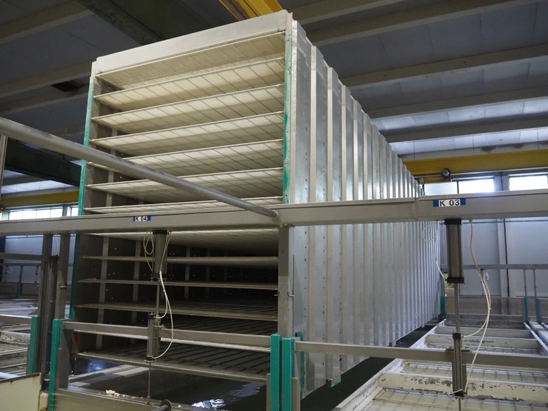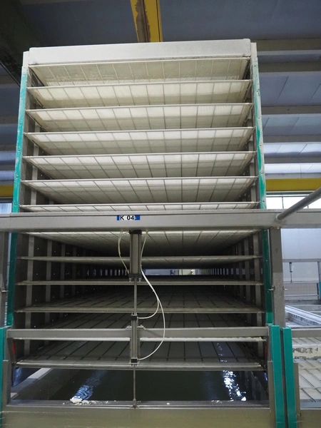 Brine treatment installation consisting of 12 s/s storage cages, 12 floors, distance between floors: (12x) 210 mm, dimensions: (12x) 11000 mm x 2200 mm x 3000 mm and 24 pneumatic gates, total dimensions: 33000 mm x 14500 mm x 3000 mm.
