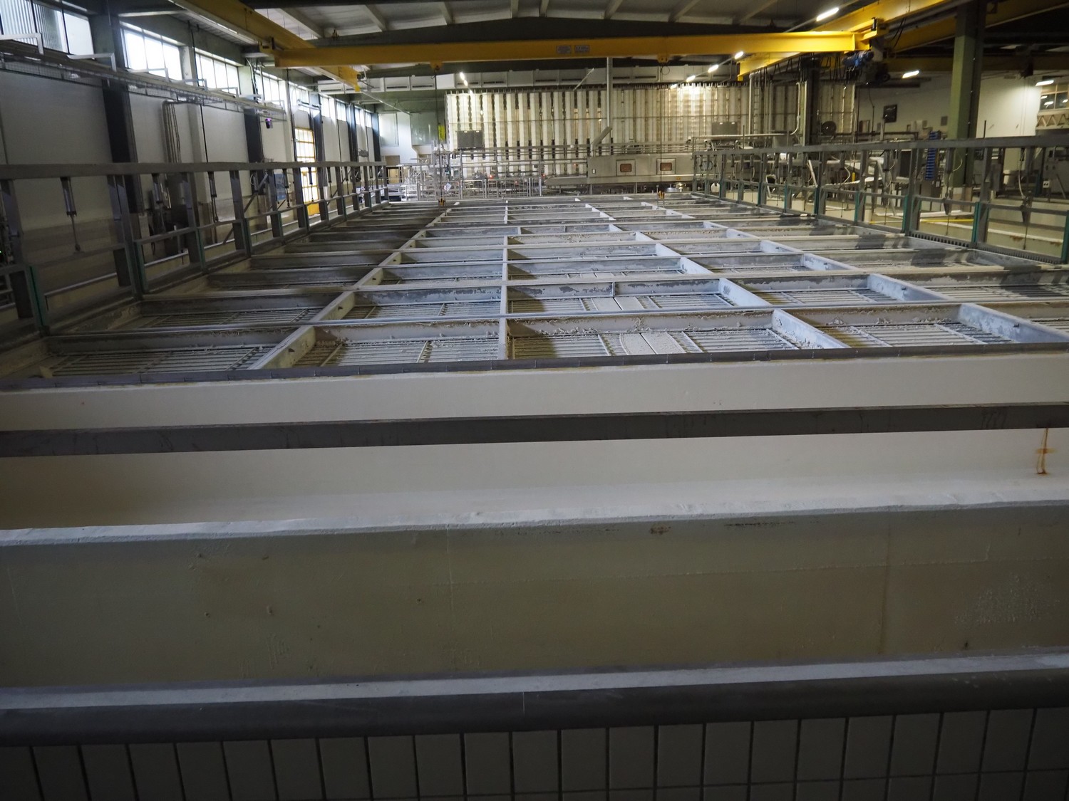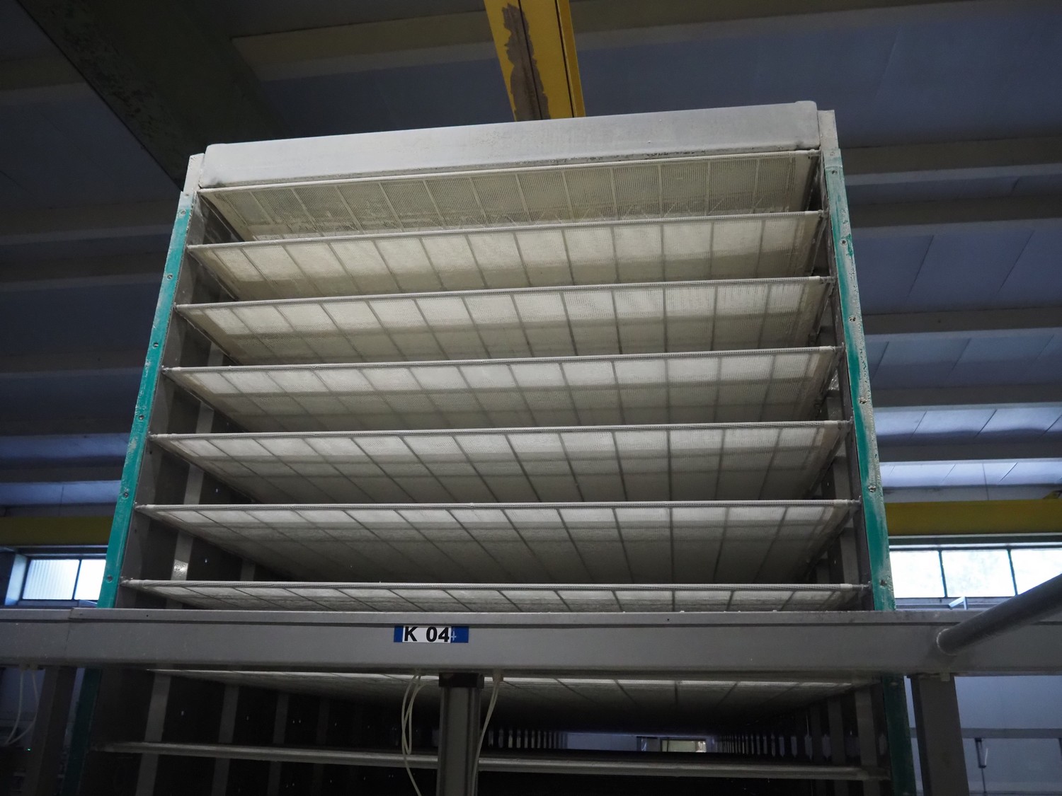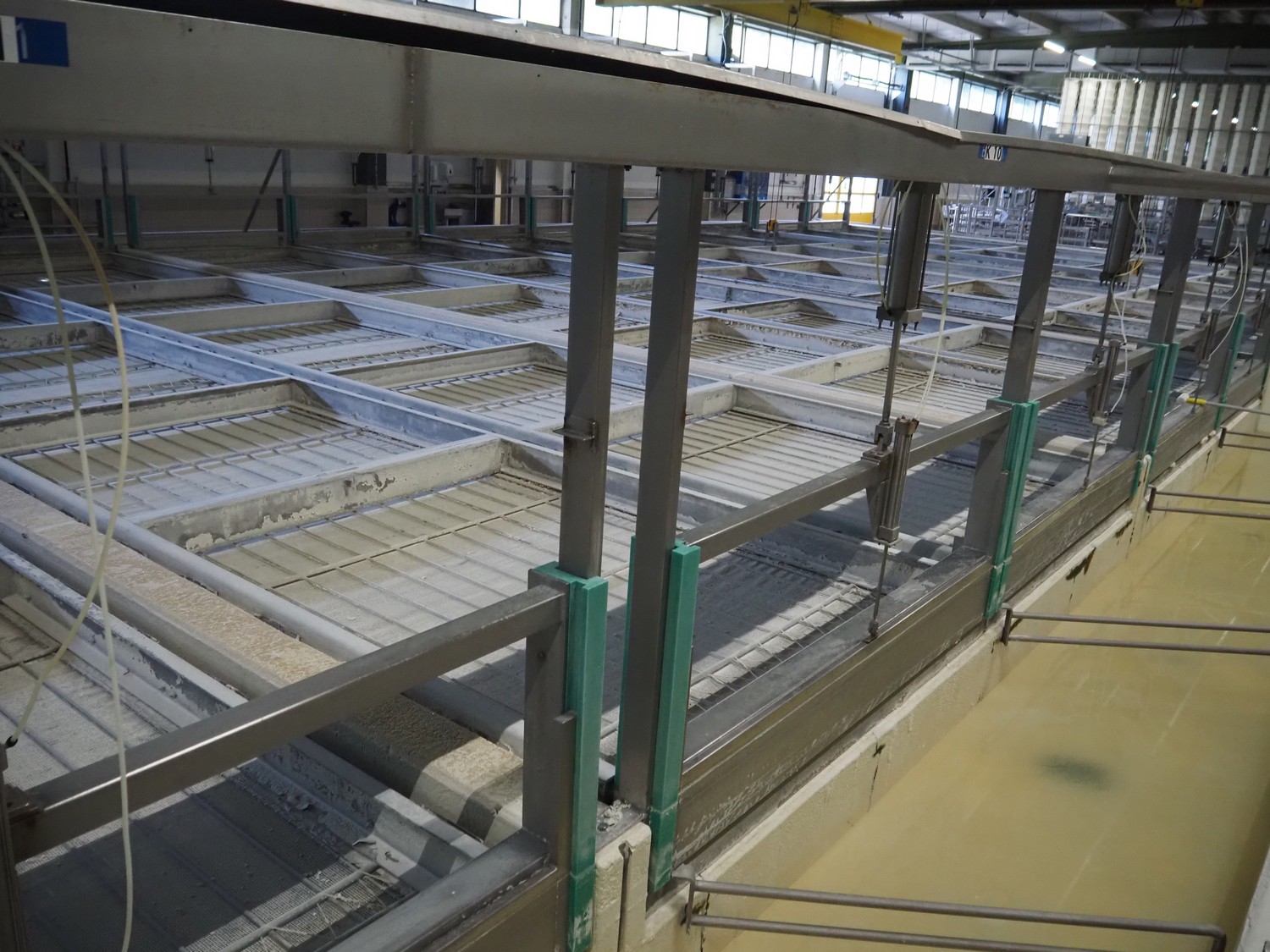 Brine treatment installation consisting of 12 s/s storage cages, 12 floors, distance between floors: (12x) 210 mm, dimensions: (12x) 11000 mm x 2200 mm x 3000 mm and 24 pneumatic gates, total dimensions: 33000 mm x 14500 mm x 3000 mm.