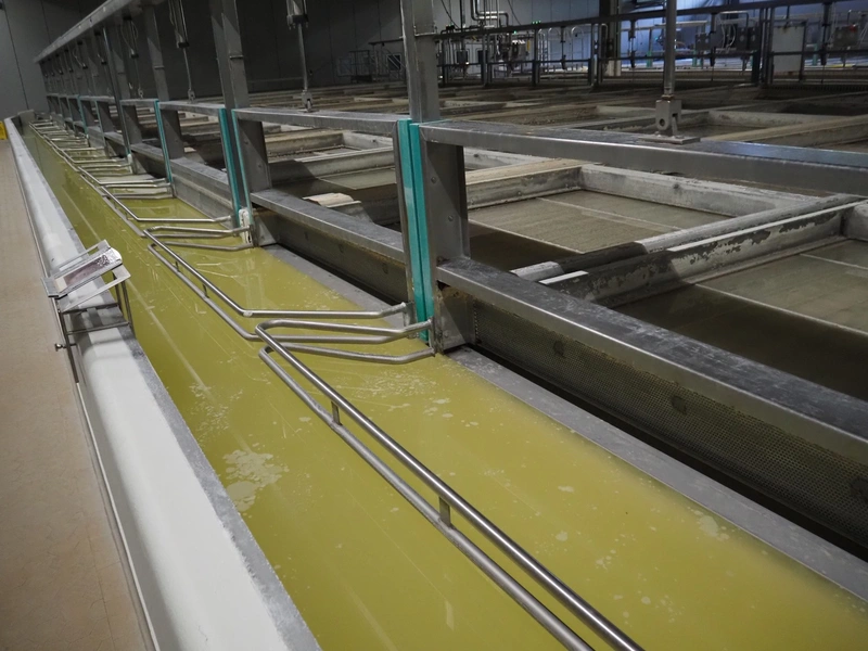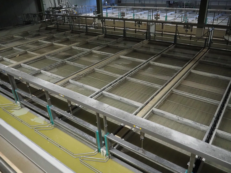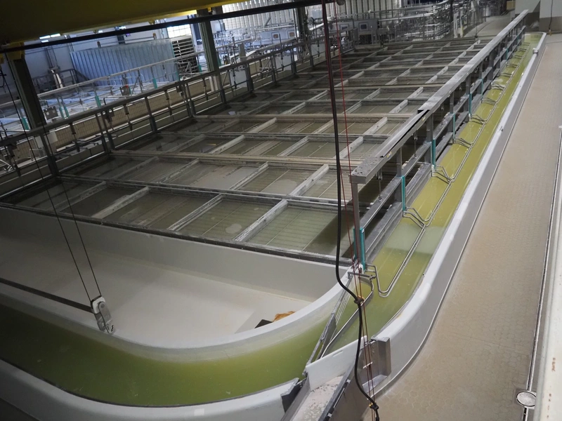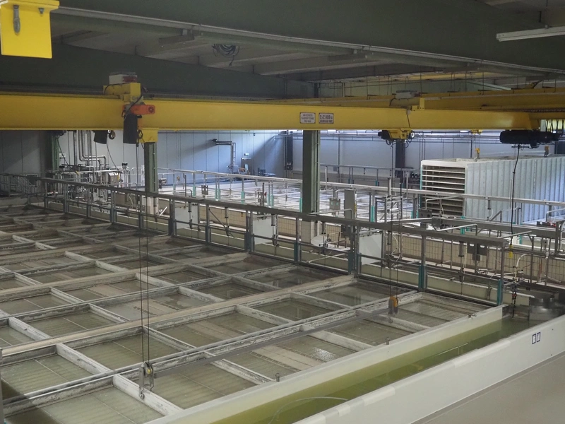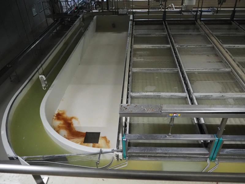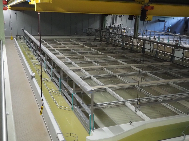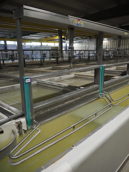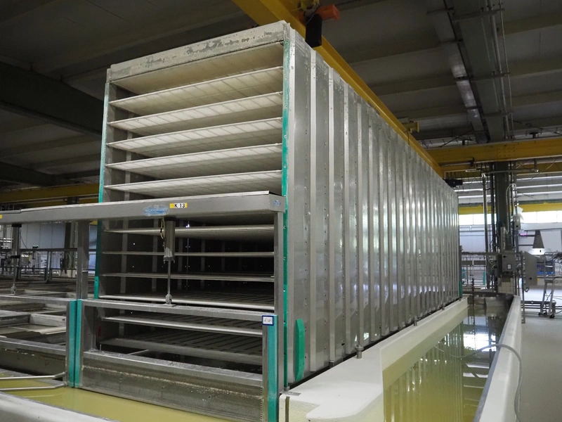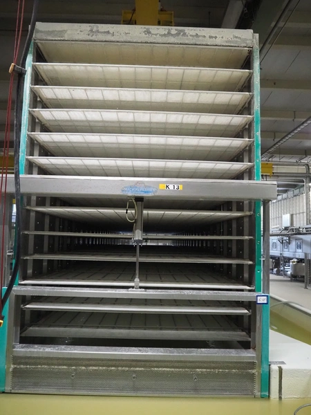 Brine treatment installation consisting of 12 s/s storage cages, 12 floors, distance between floors: (12x) 210 mm, dimensions: (12x) 11000 mm x 2200 mm x 3000 mm and 24 pneumatic gates, total dimensions: 33000 mm x 14500 mm x 3000 mm.