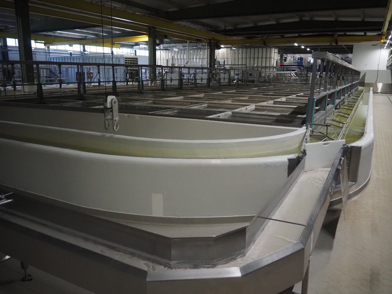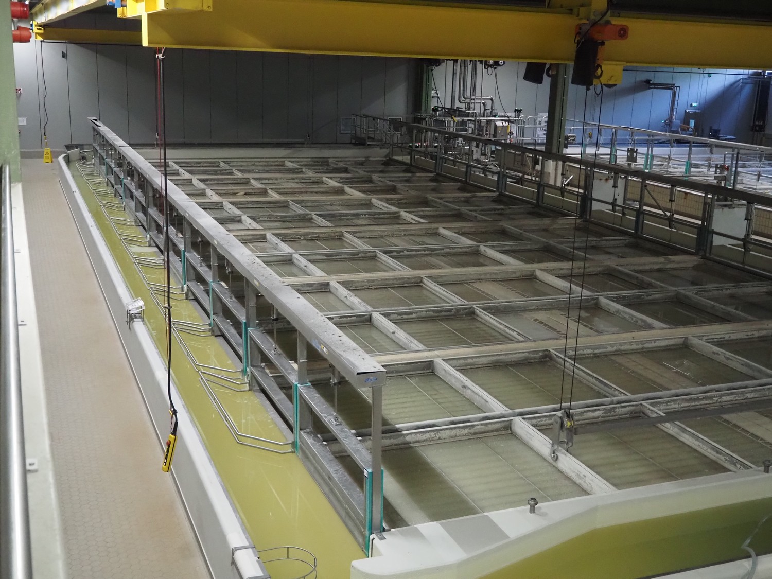 Brine treatment installation consisting of 12 s/s storage cages, 12 floors, distance between floors: (12x) 210 mm, dimensions: (12x) 11000 mm x 2200 mm x 3000 mm and 24 pneumatic gates, total dimensions: 33000 mm x 14500 mm x 3000 mm.