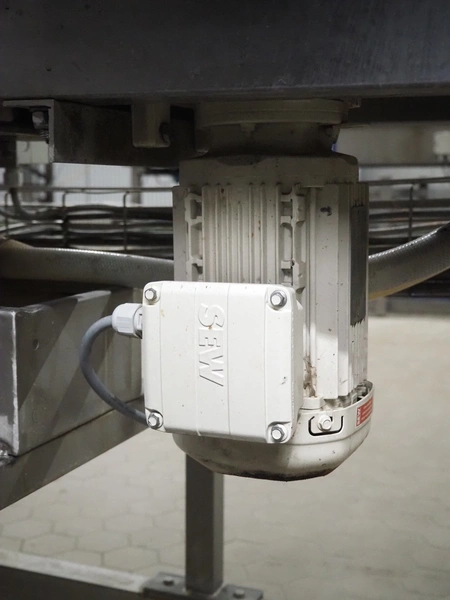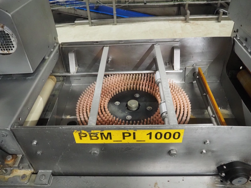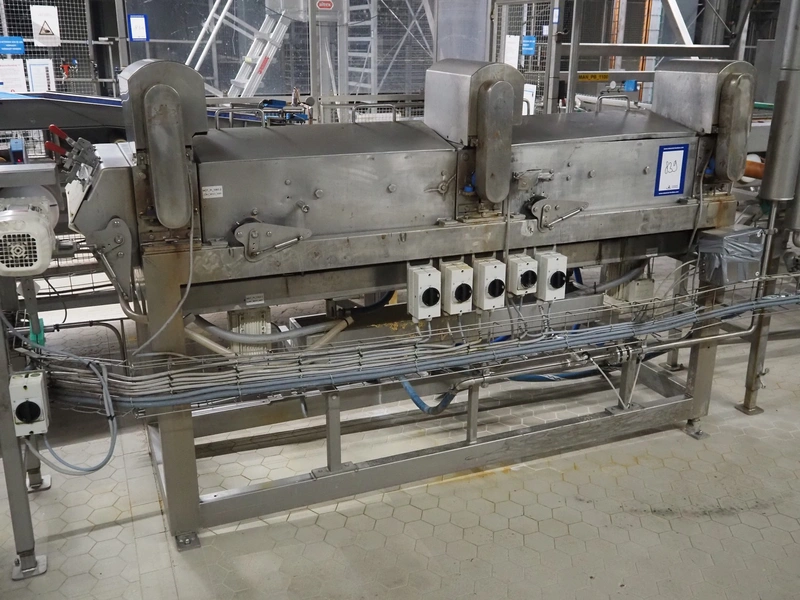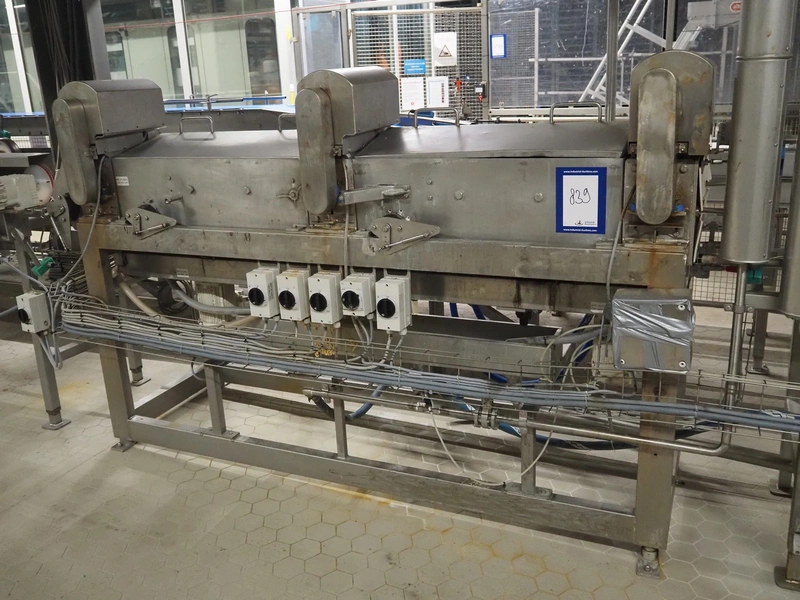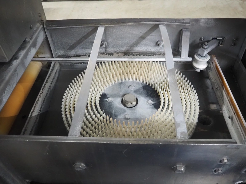 Brushing machine for wooden cheese boards, clearance: 450 mm x 50 mm, total dimensions: 2800 mm x 1000 mm x 1550 mm. With s/s tub with Grundfos pump, dimensions tub: 660 mm x 570 mm x 630 mm.