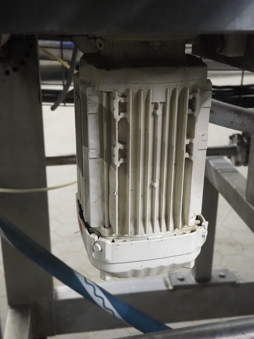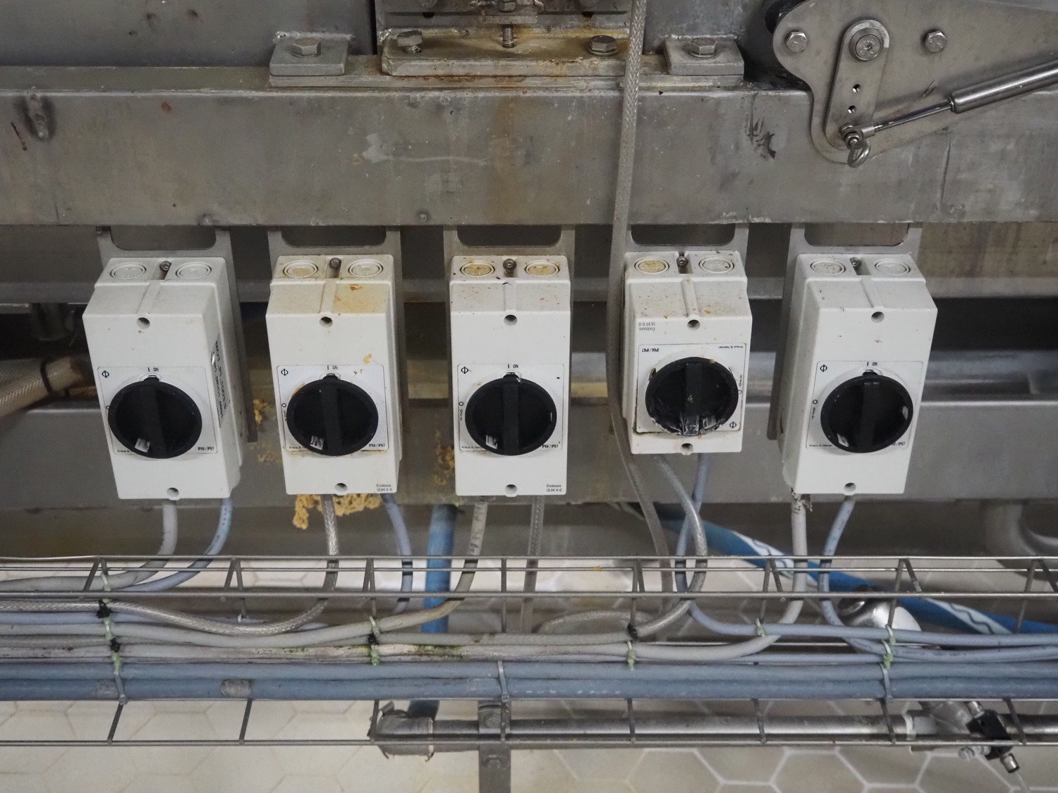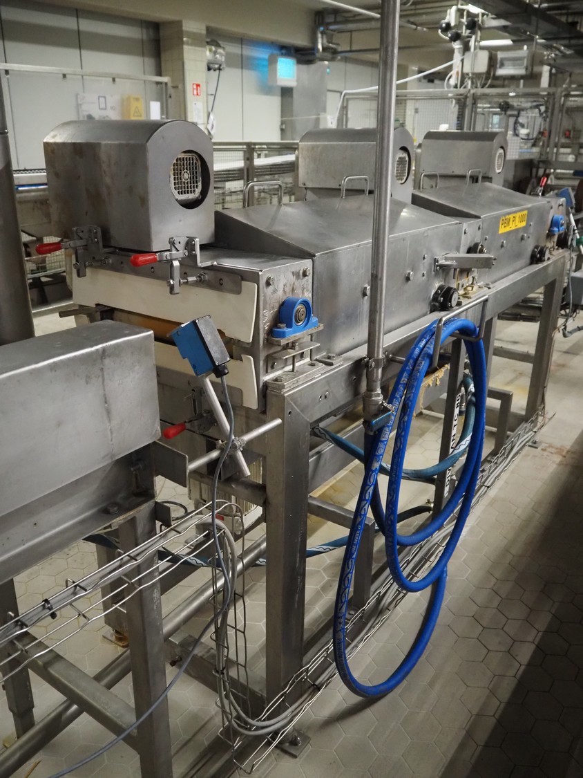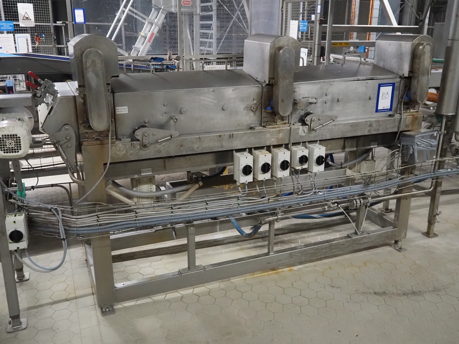 Brushing machine for wooden cheese boards, clearance: 450 mm x 50 mm, total dimensions: 2800 mm x 1000 mm x 1550 mm. With s/s tub with Grundfos pump, dimensions tub: 660 mm x 570 mm x 630 mm.