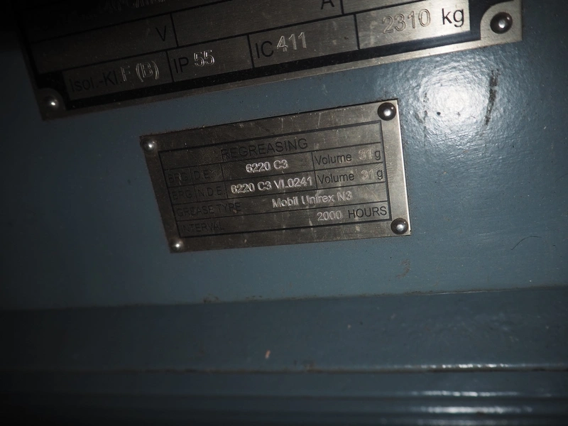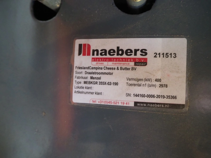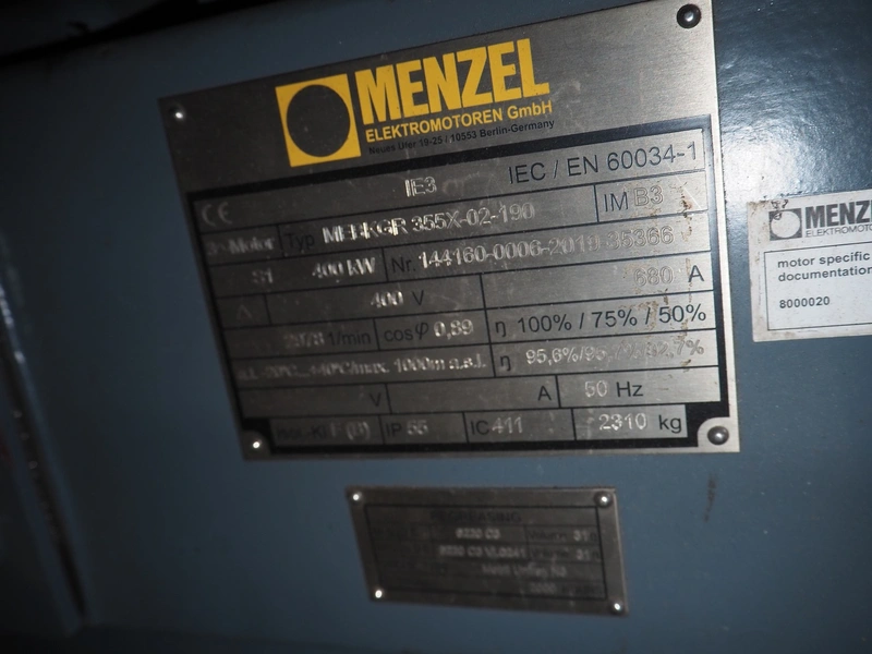 Menzel Elektromotoren GmbH motor for Piller GmbH ventilator, type: MEBKGR 355X-02-190, number: 144160-0006-2019-35366, 400 V, 50 Hz, 680 A, 400 kW, 2310 kg, dimensions: 1800 mm x 800 mm x 1150 mm.