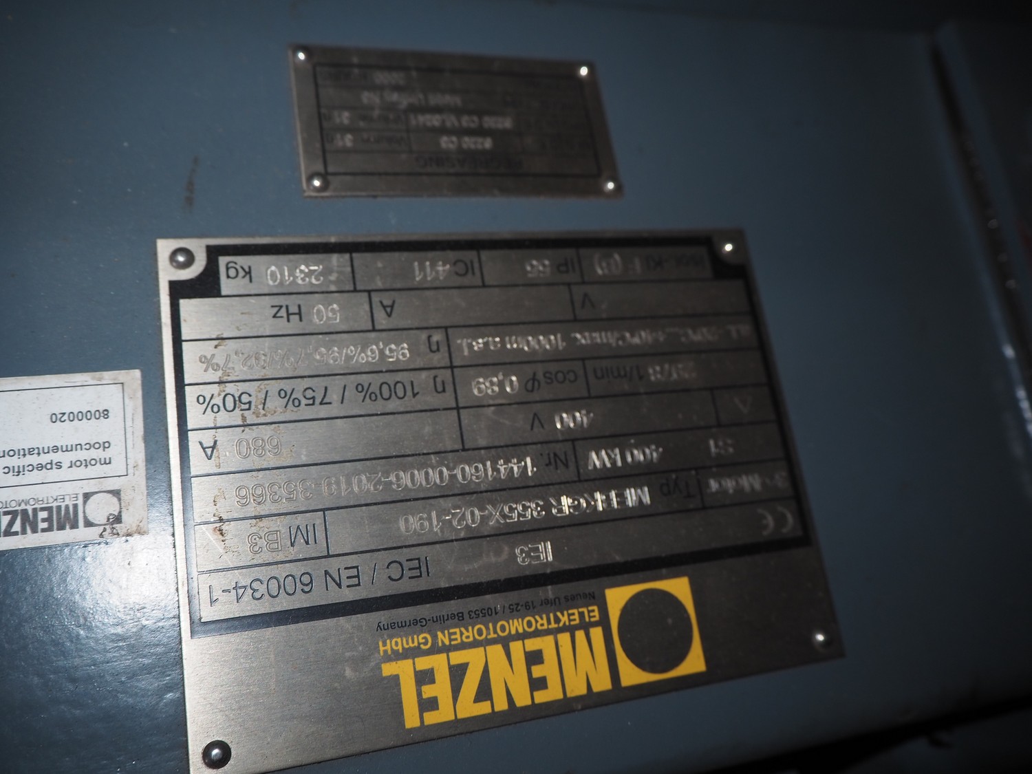 Menzel Elektromotoren GmbH motor for Piller GmbH ventilator, type: MEBKGR 355X-02-190, number: 144160-0006-2019-35366, 400 V, 50 Hz, 680 A, 400 kW, 2310 kg, dimensions: 1800 mm x 800 mm x 1150 mm.