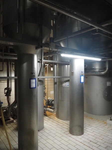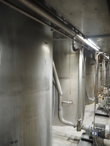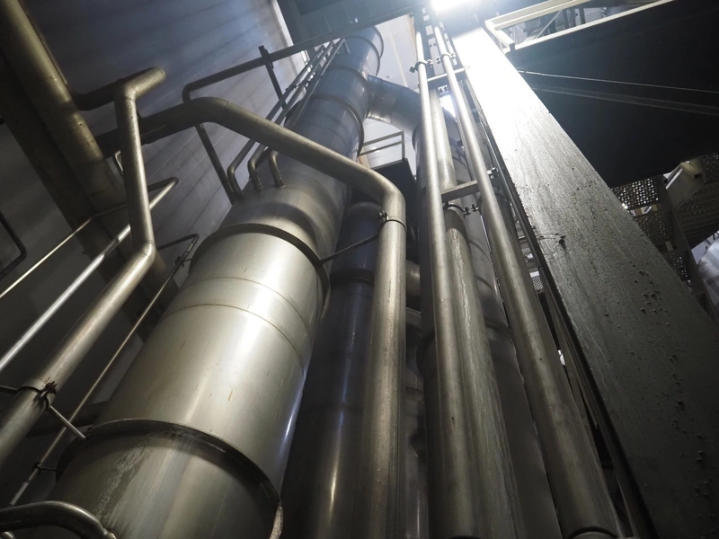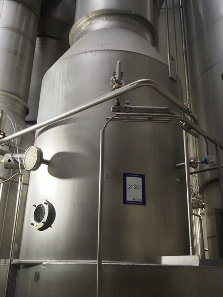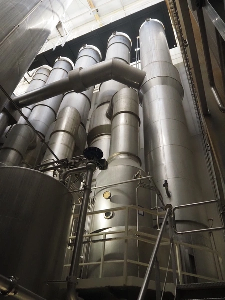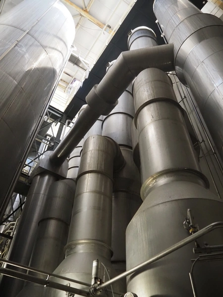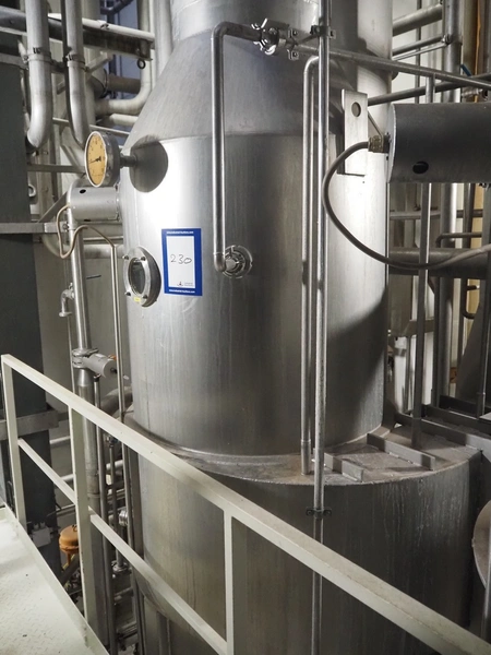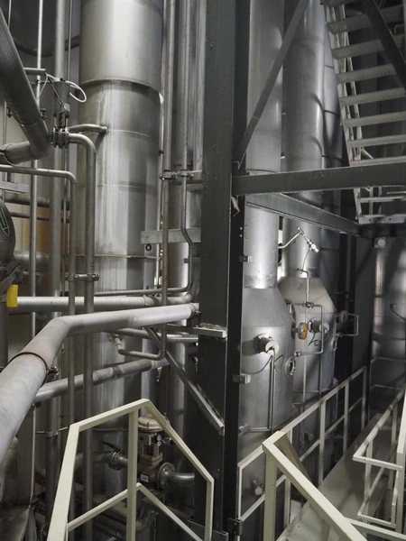 Norde Boers thermal vapor recompression evaporator, dimensions: (5x) ø 2000 mm x 19000 mm, (3x) 2000 mm x 13500 mm.