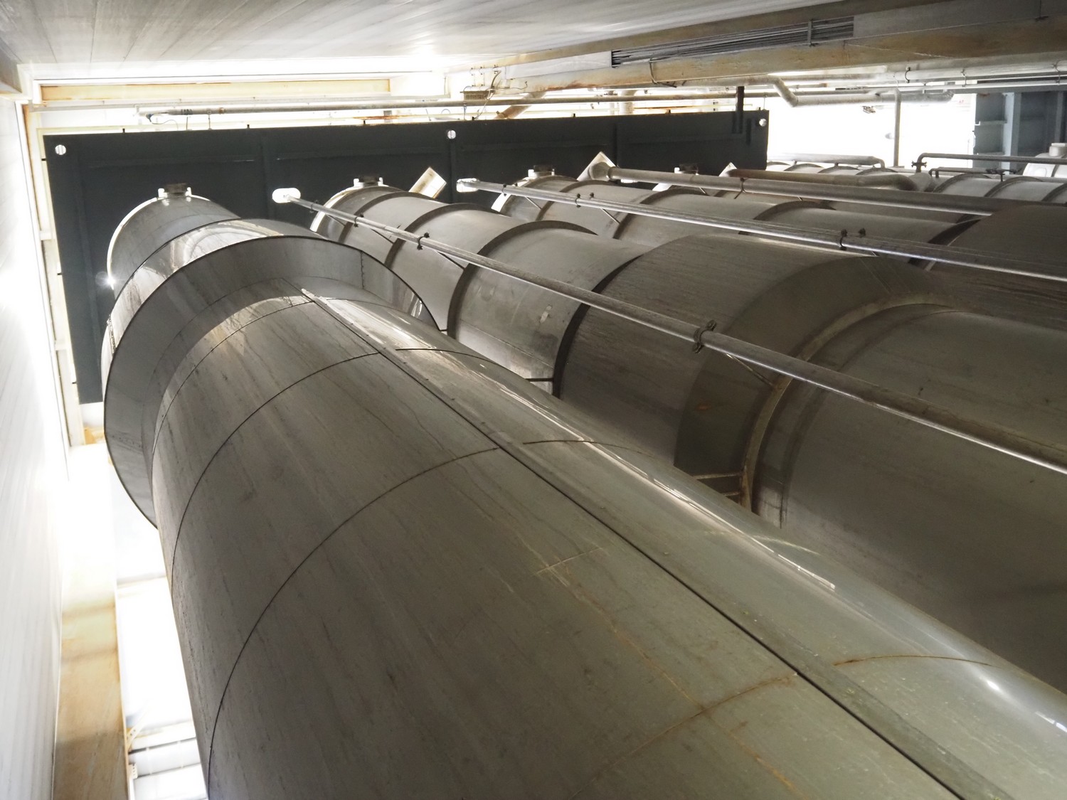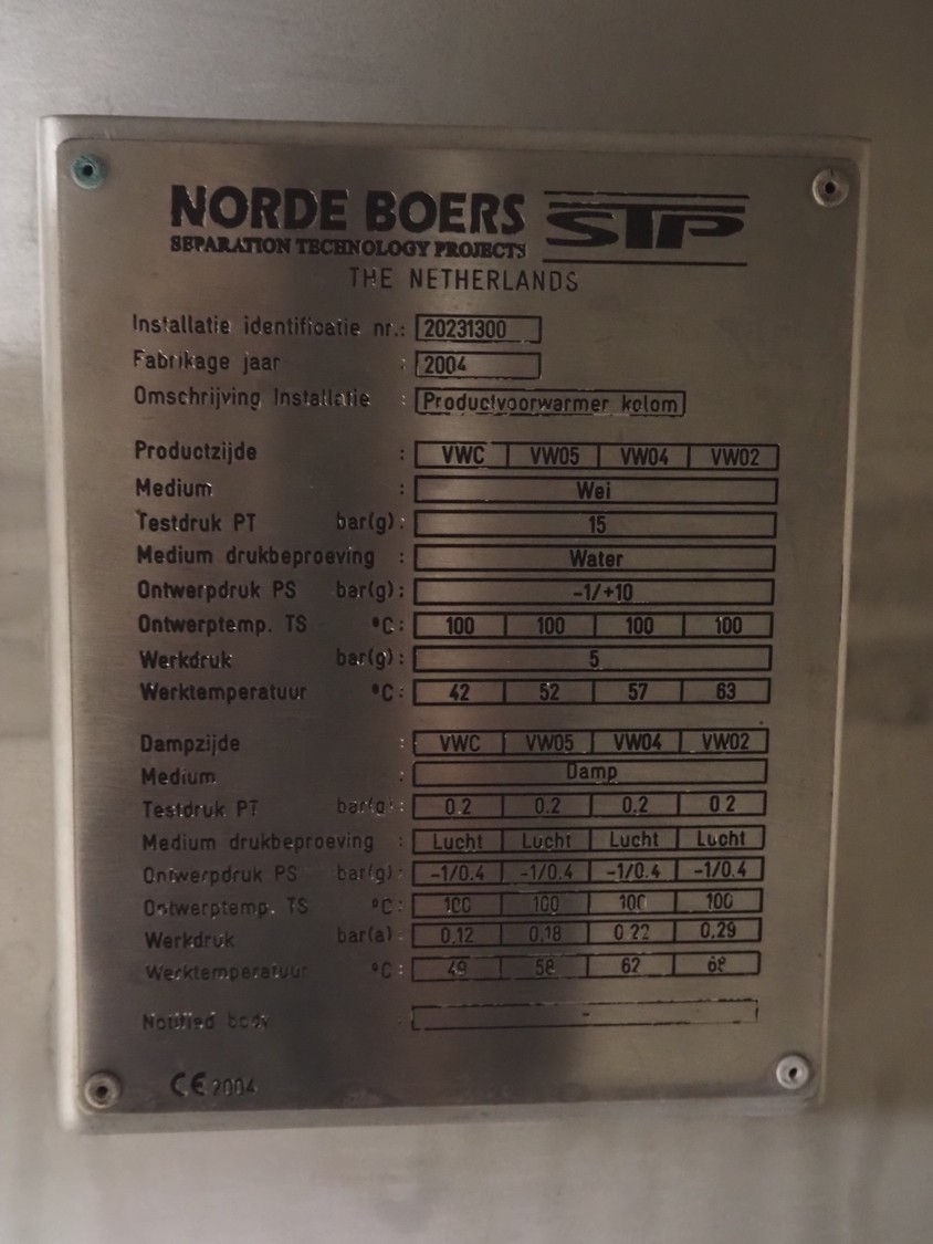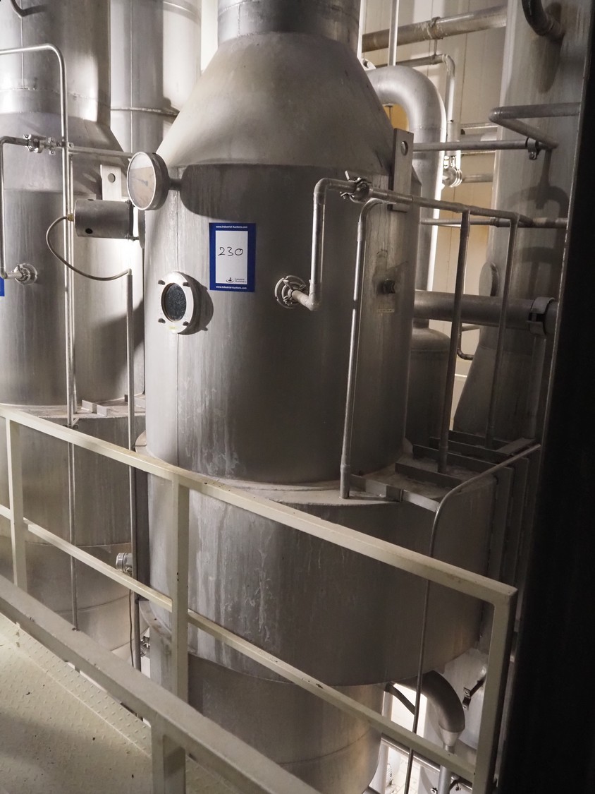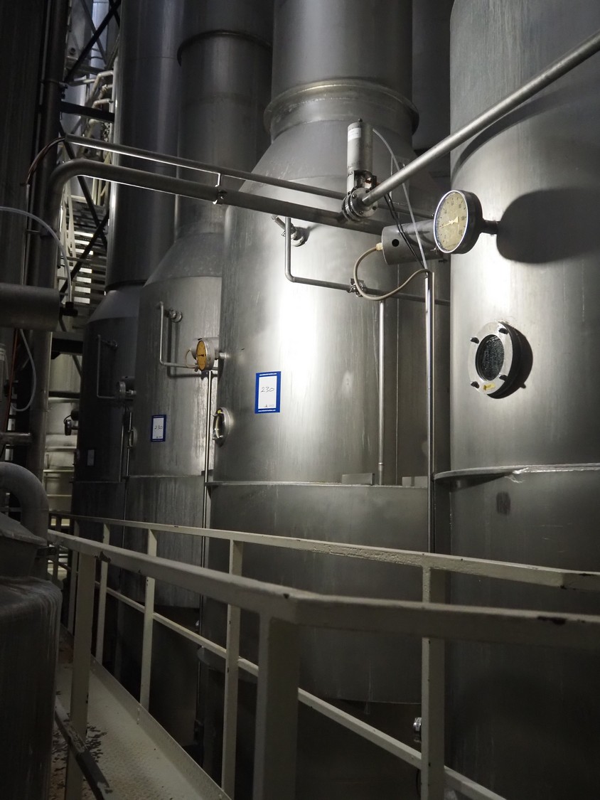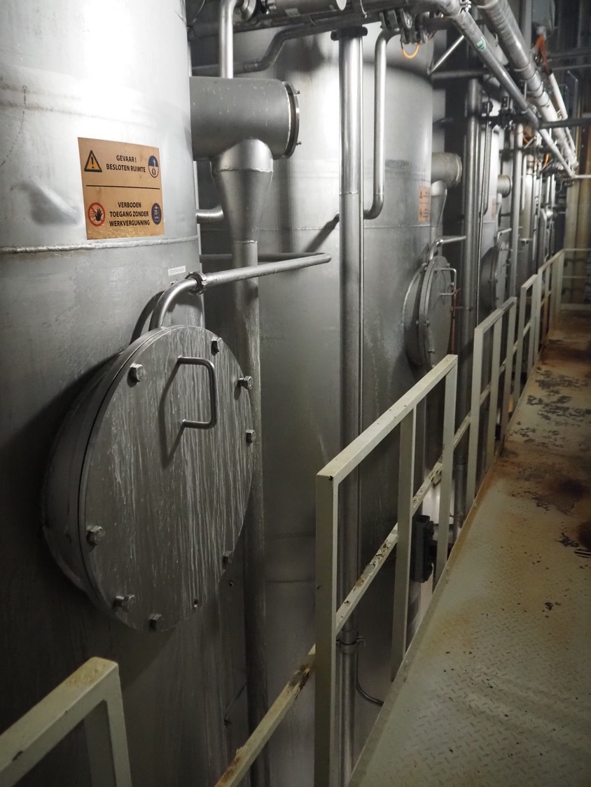 Norde Boers thermal vapor recompression evaporator, dimensions: (5x) ø 2000 mm x 19000 mm, (3x) 2000 mm x 13500 mm.