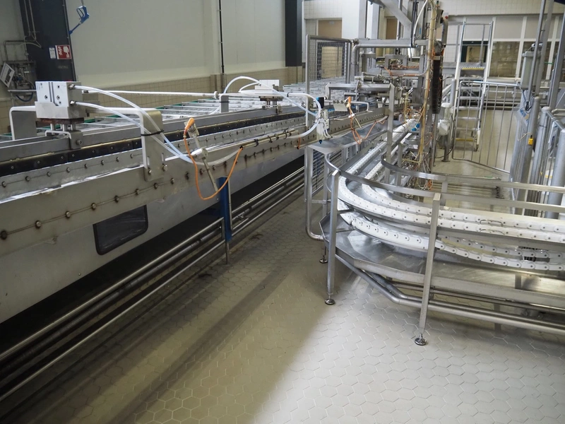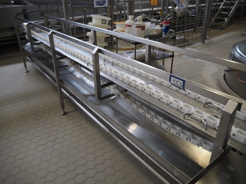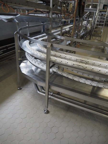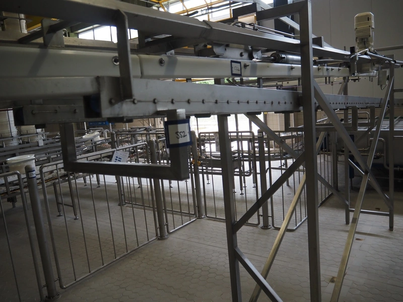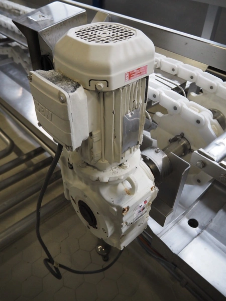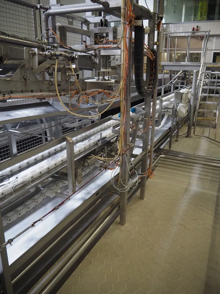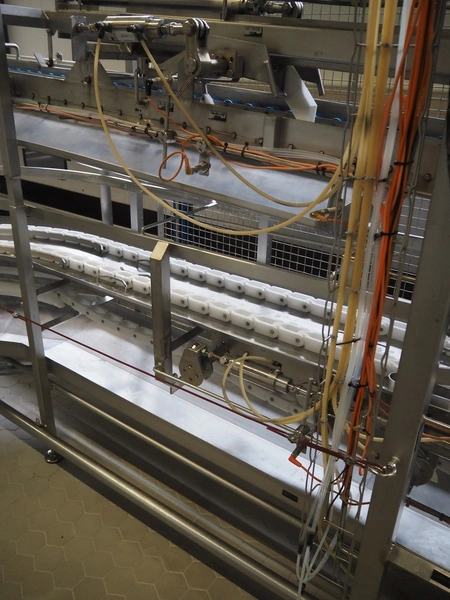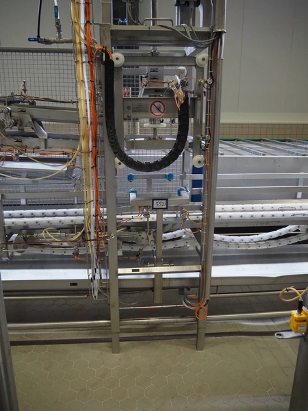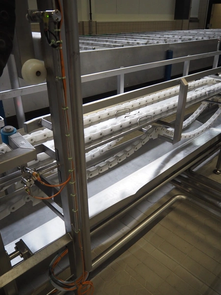 de Klokslag Engineering B.V. transport system with lid applicator, plastic chain belt, belt width: 450 mm, total dimensions: 900 mm x 5500 mm x 3850 mm.