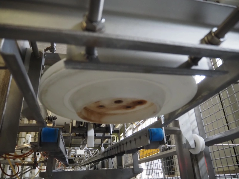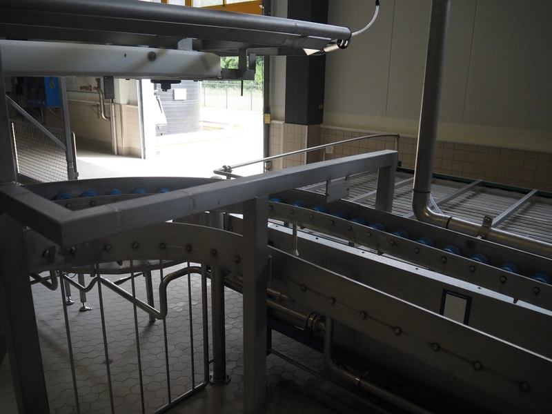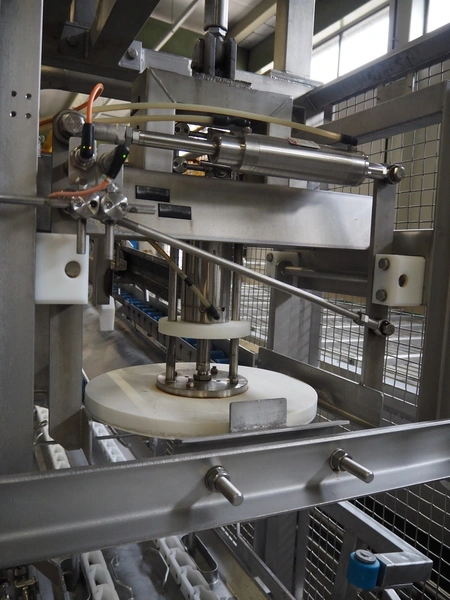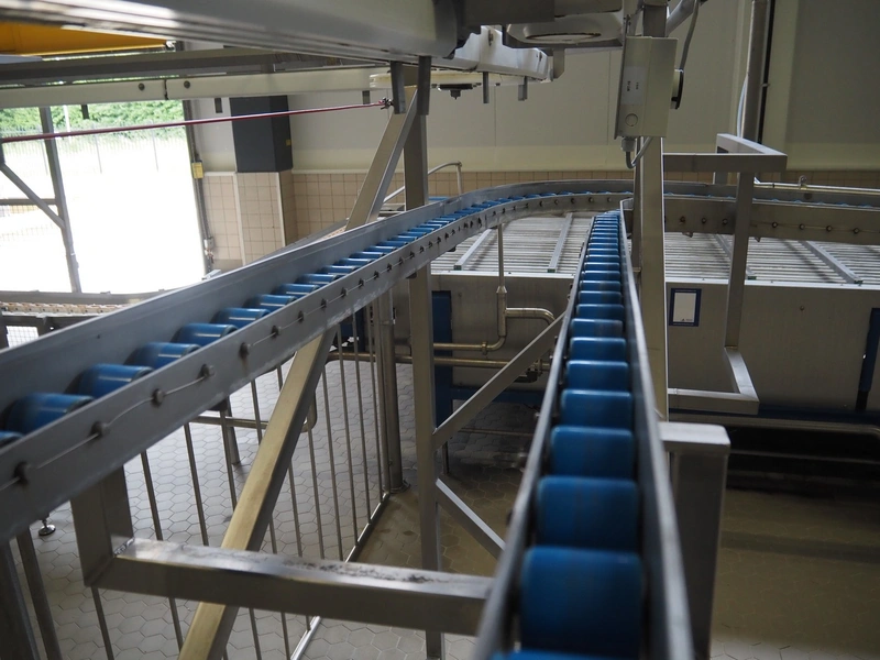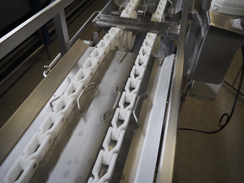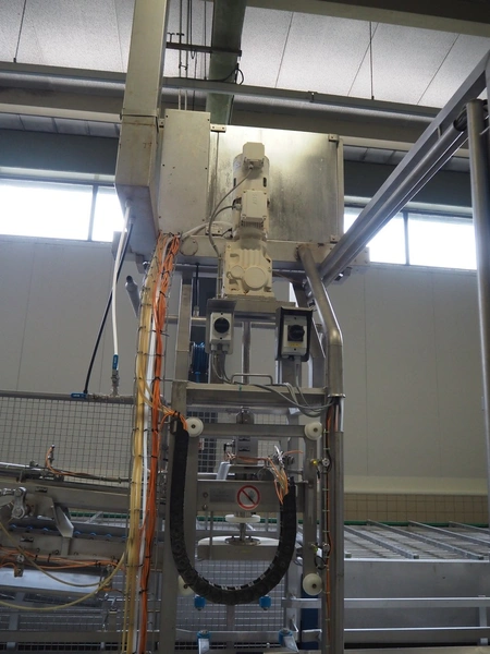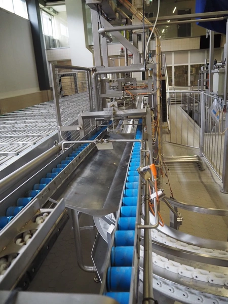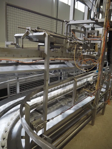 de Klokslag Engineering B.V. transport system with lid applicator, plastic chain belt, belt width: 450 mm, total dimensions: 900 mm x 5500 mm x 3850 mm.