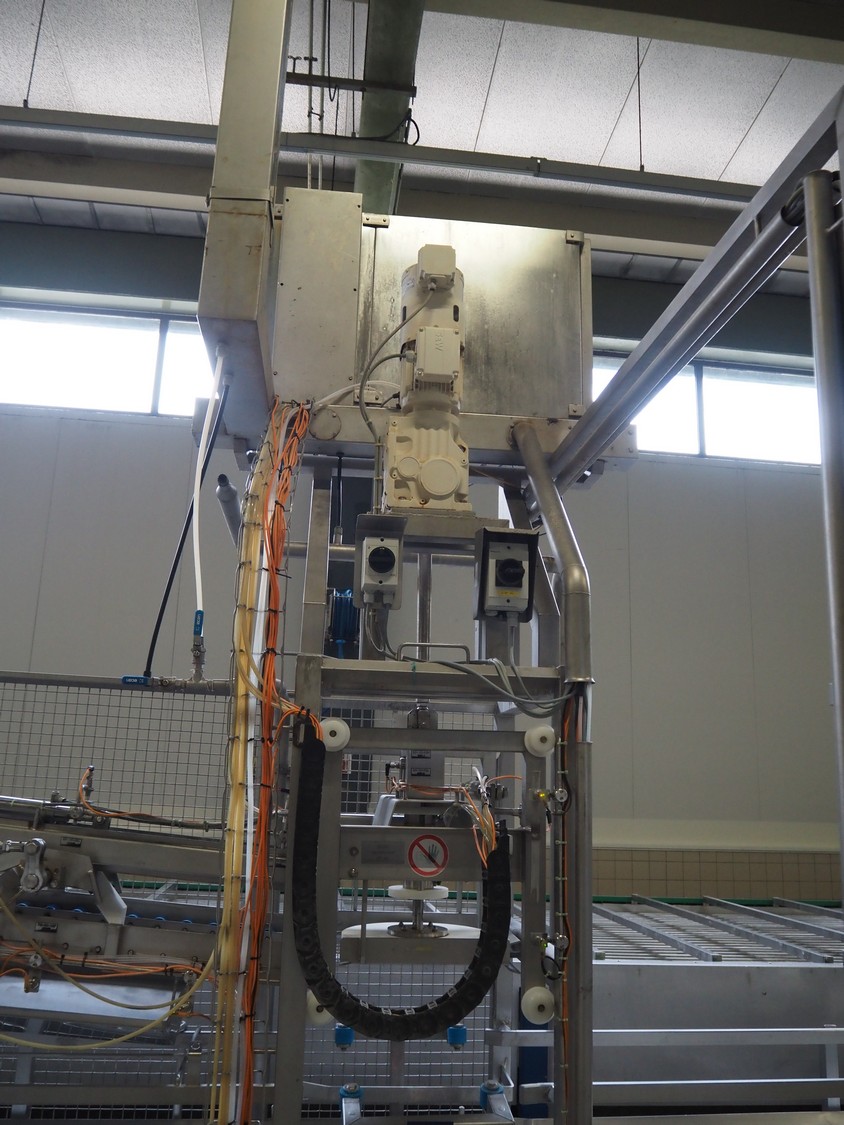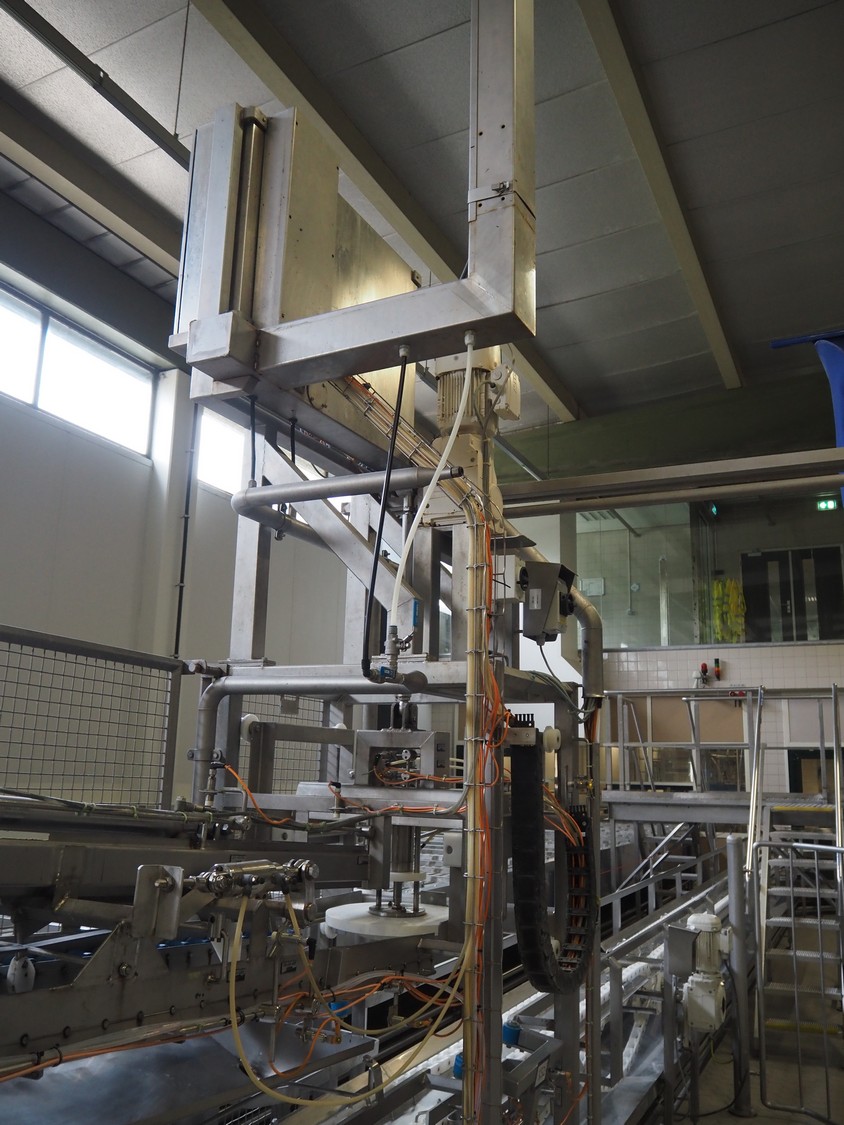 de Klokslag Engineering B.V. transport system with lid applicator, plastic chain belt, belt width: 450 mm, total dimensions: 900 mm x 5500 mm x 3850 mm.