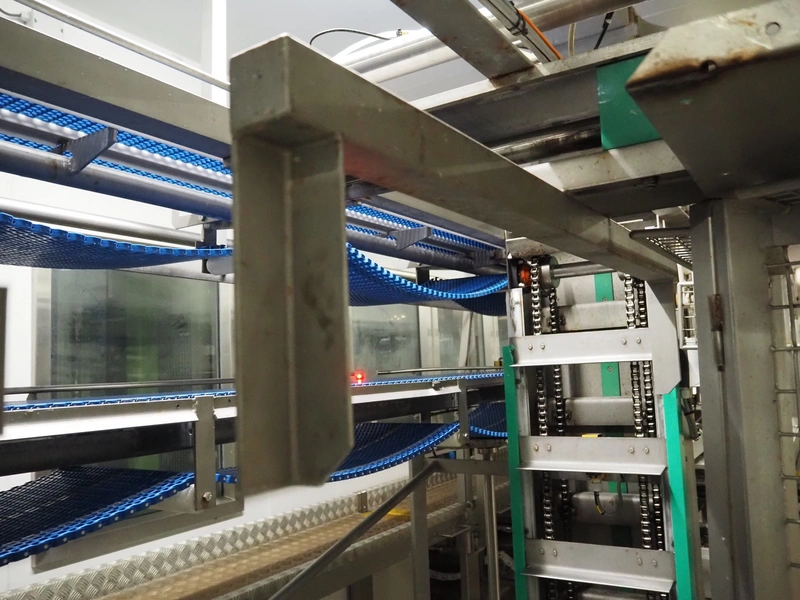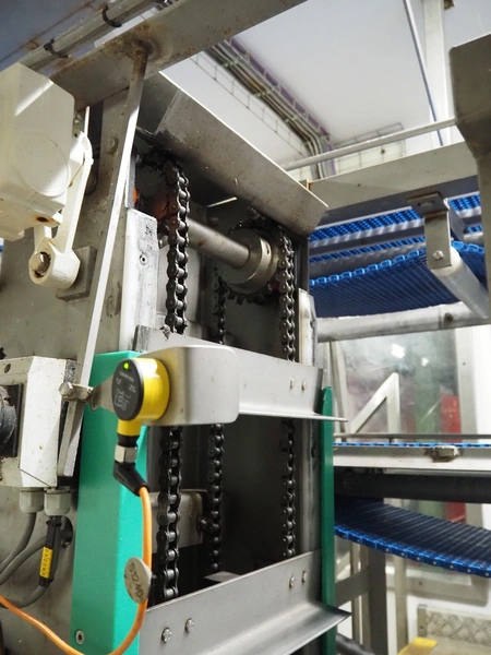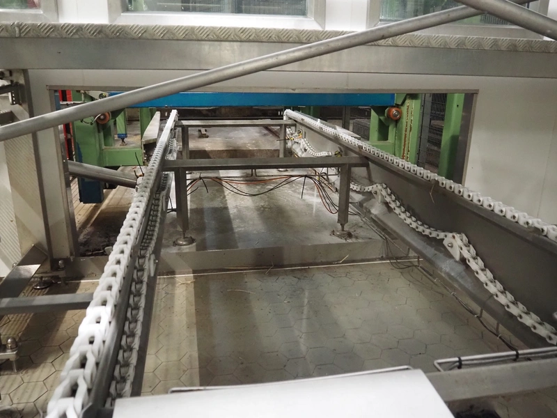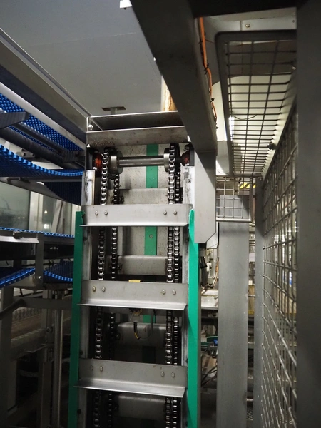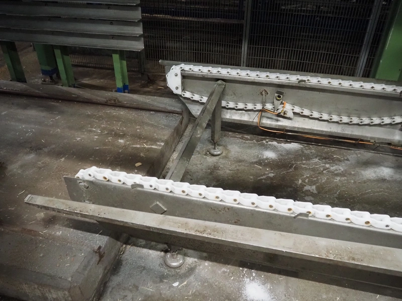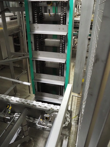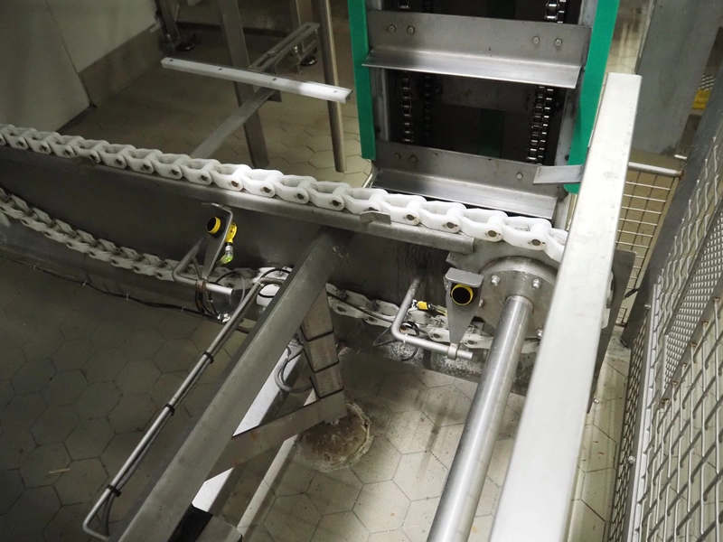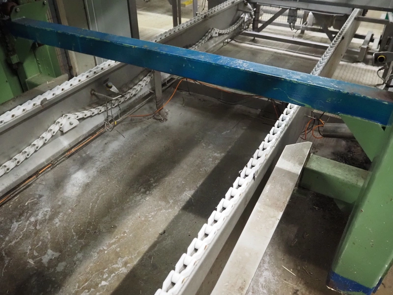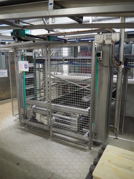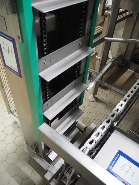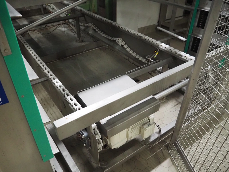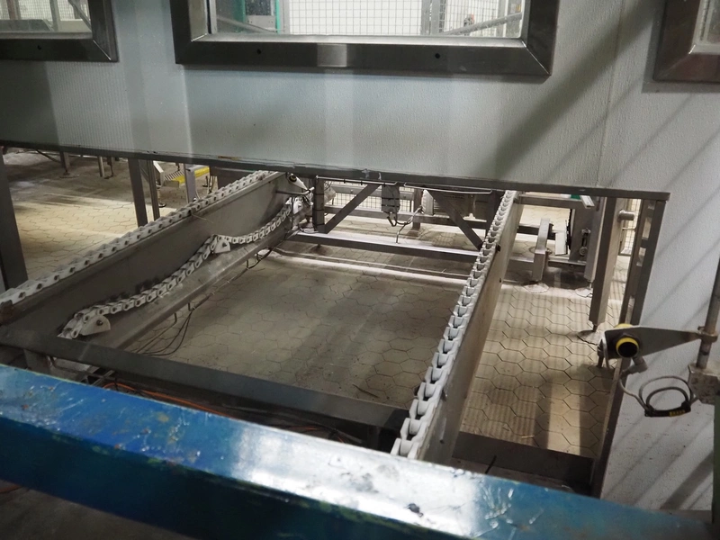 S/s cheese board unloader, dimensions each floor: 1760 mm x 360 mm, distance between floors: 260 mm, total dimensions: 2250 mm x 2100 mm x 2200 mm, including chain conveyor, distance between chains: 1200 mm, total dimensions 5000 mm x 1620 mm x 750 mm.