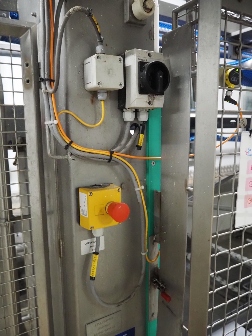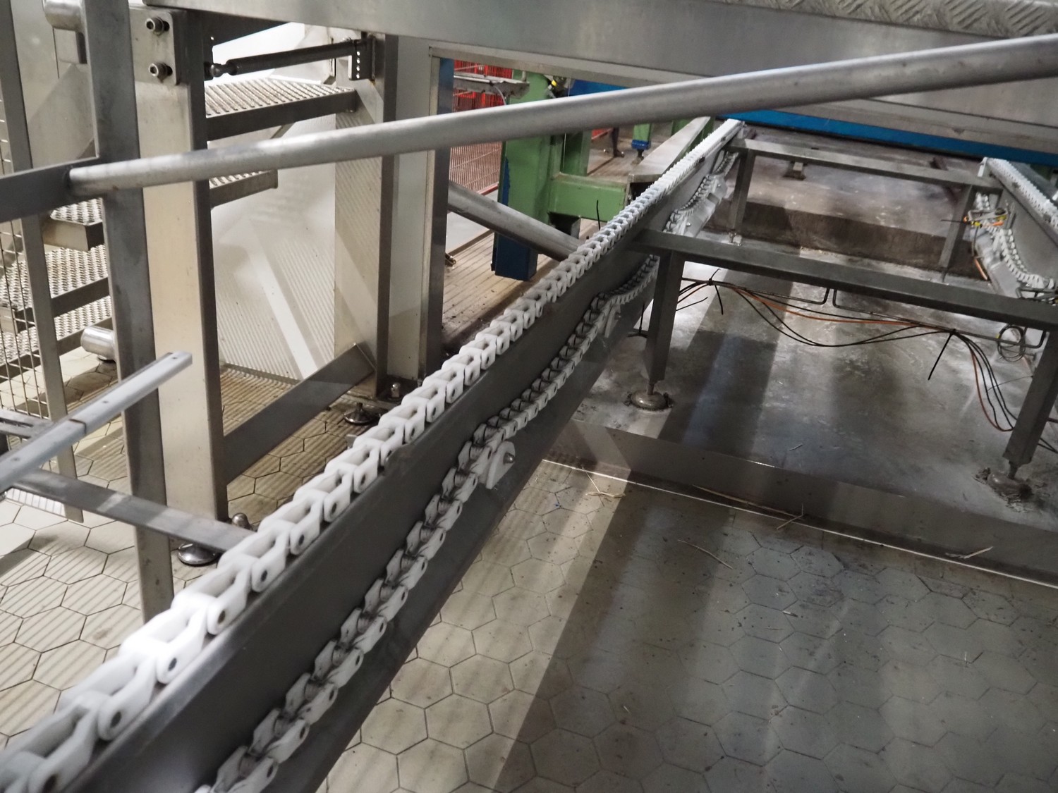 S/s cheese board unloader, dimensions each floor: 1760 mm x 360 mm, distance between floors: 260 mm, total dimensions: 2250 mm x 2100 mm x 2200 mm, including chain conveyor, distance between chains: 1200 mm, total dimensions 5000 mm x 1620 mm x 750 mm.