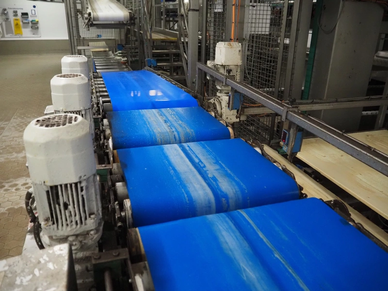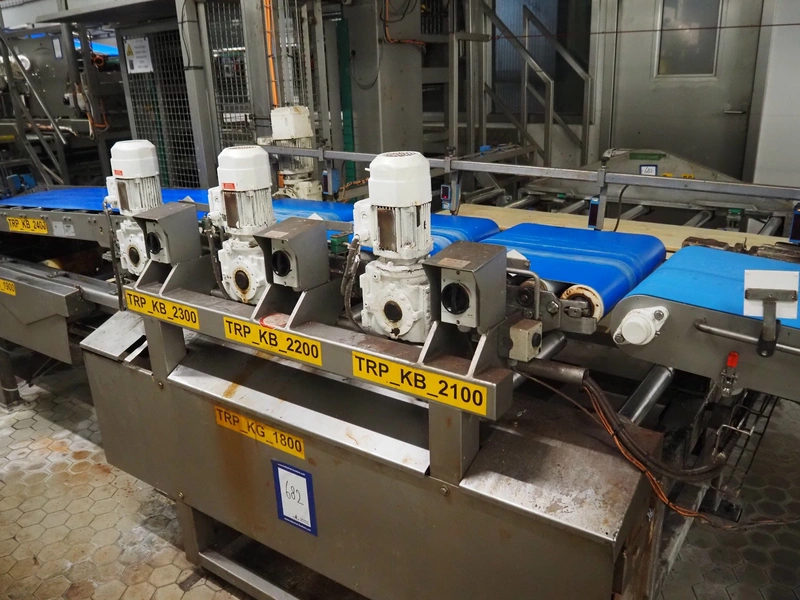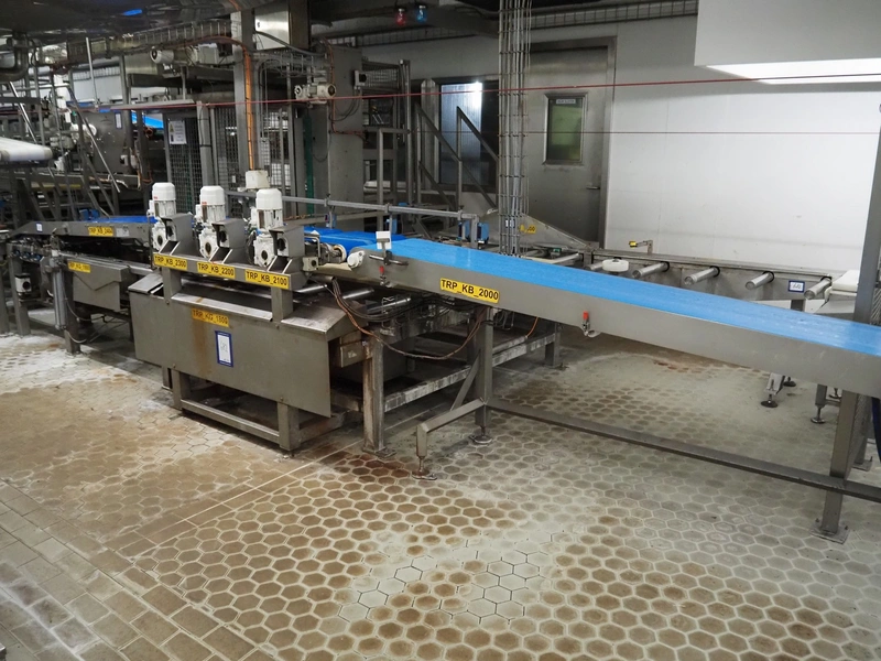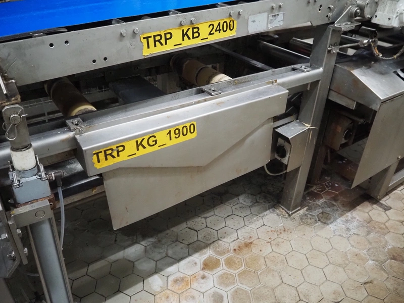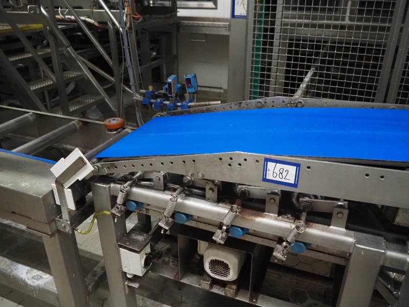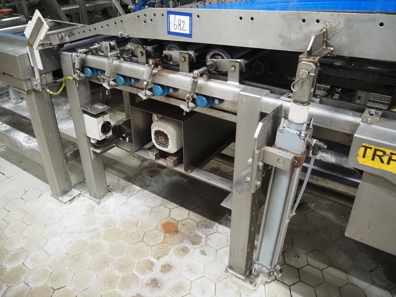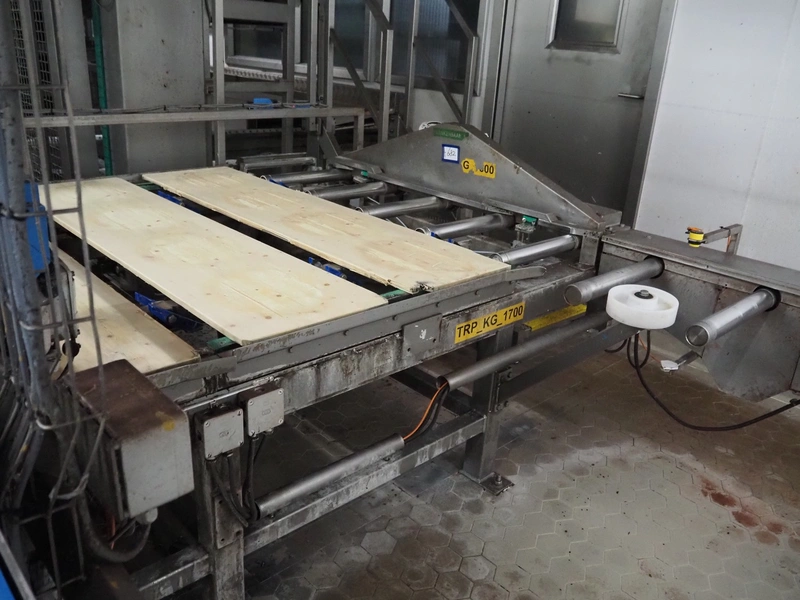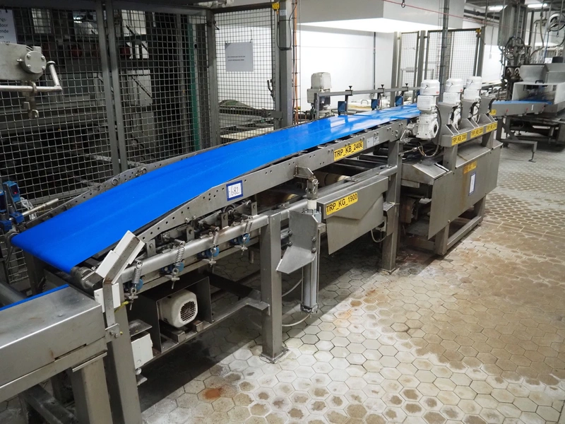 Cheese loading conveyor with cheese board return roller conveyor, belt width: 480 mm, total dimensions: 6000 mm x 3300 mm x 1500 mm.