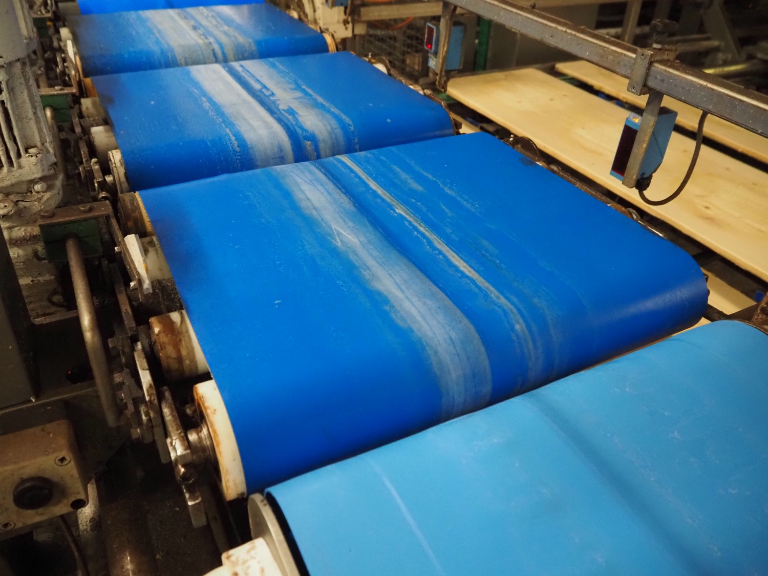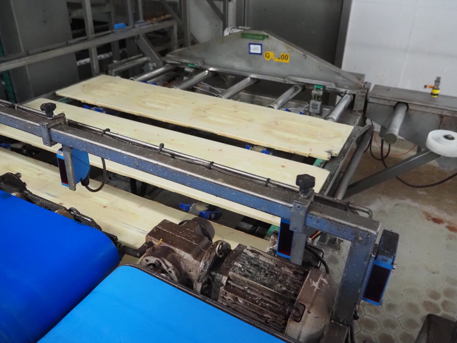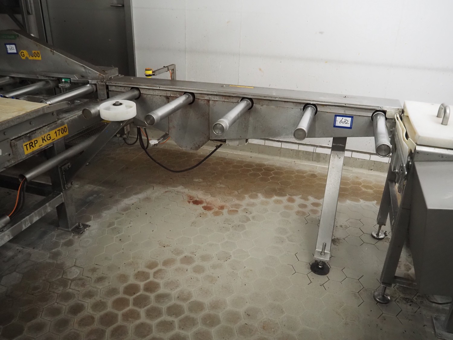 Cheese loading conveyor with cheese board return roller conveyor, belt width: 480 mm, total dimensions: 6000 mm x 3300 mm x 1500 mm.