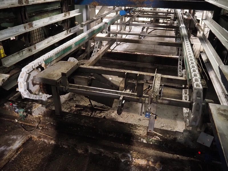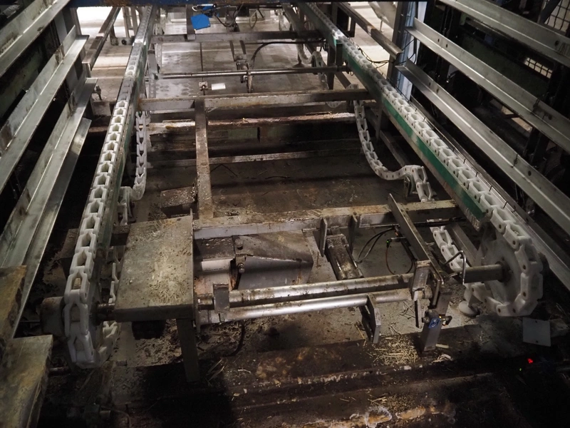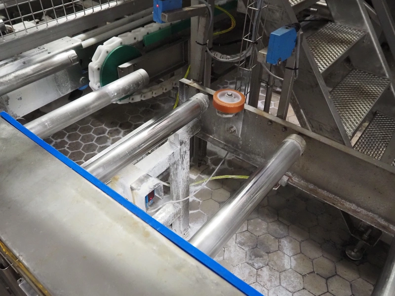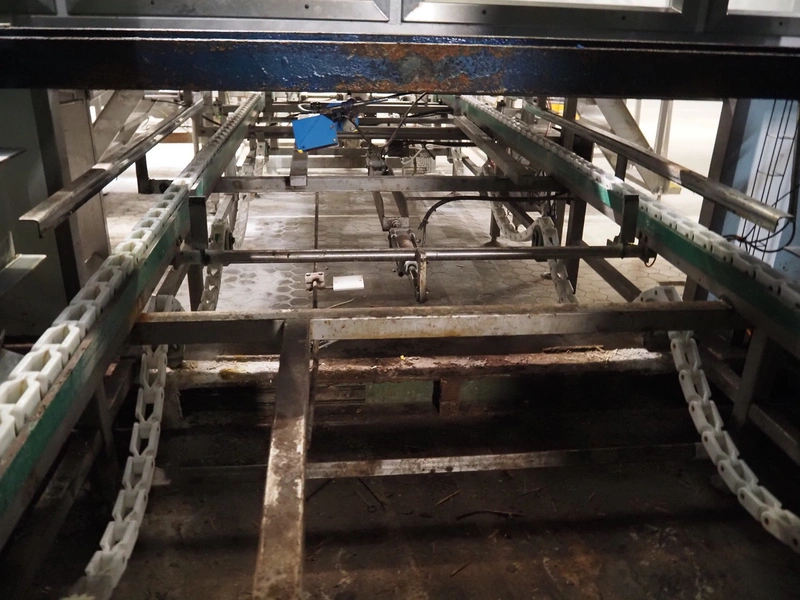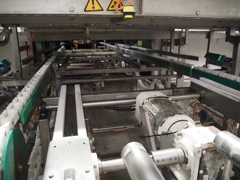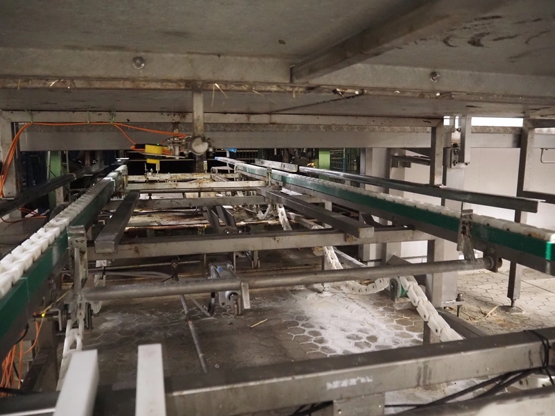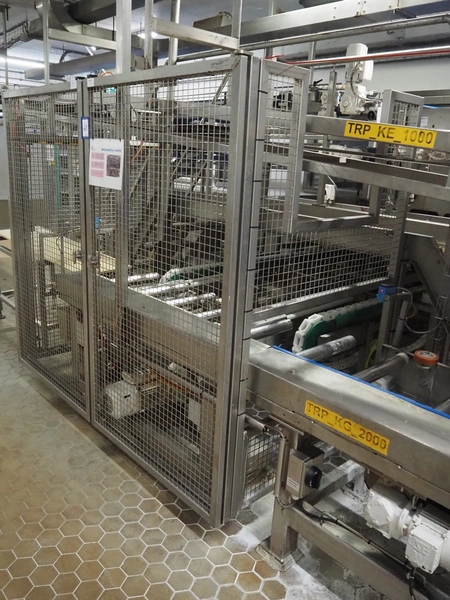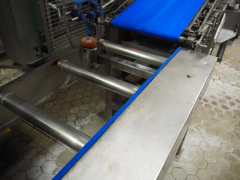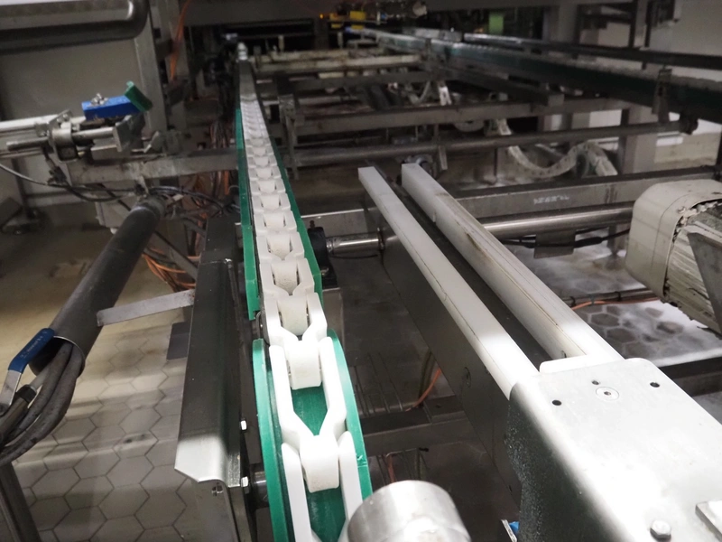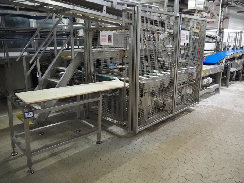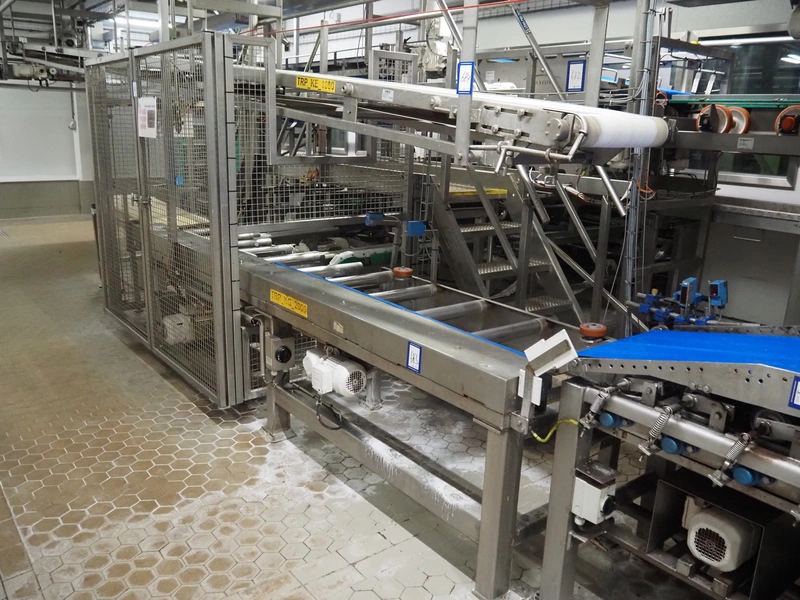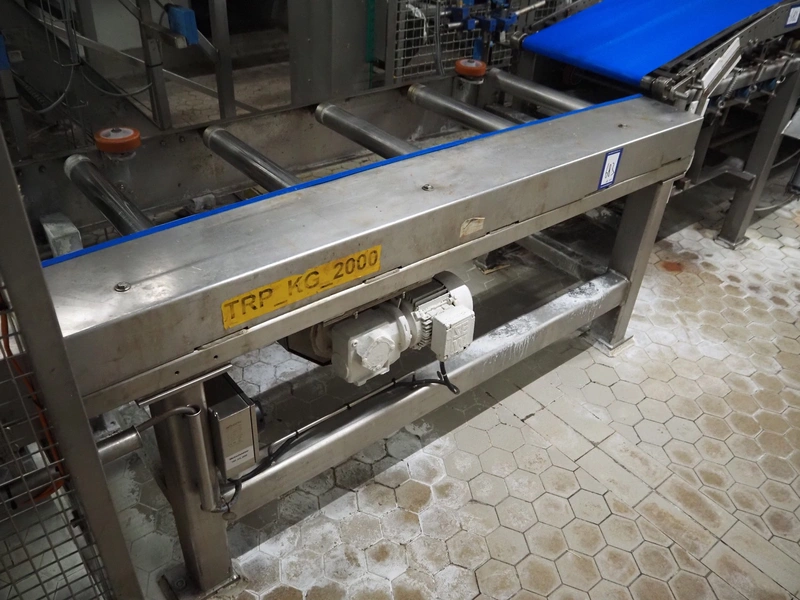 Electrical roller conveyor for cheese boards, roller width: 500 mm, total dimensions: 3600 mm x 900 mm x 1000 mm, including chain conveyor for cheese boards, distance between chains: 1300 mm, total dimensions: 5500 mm x 1800 mm x 900 mm.