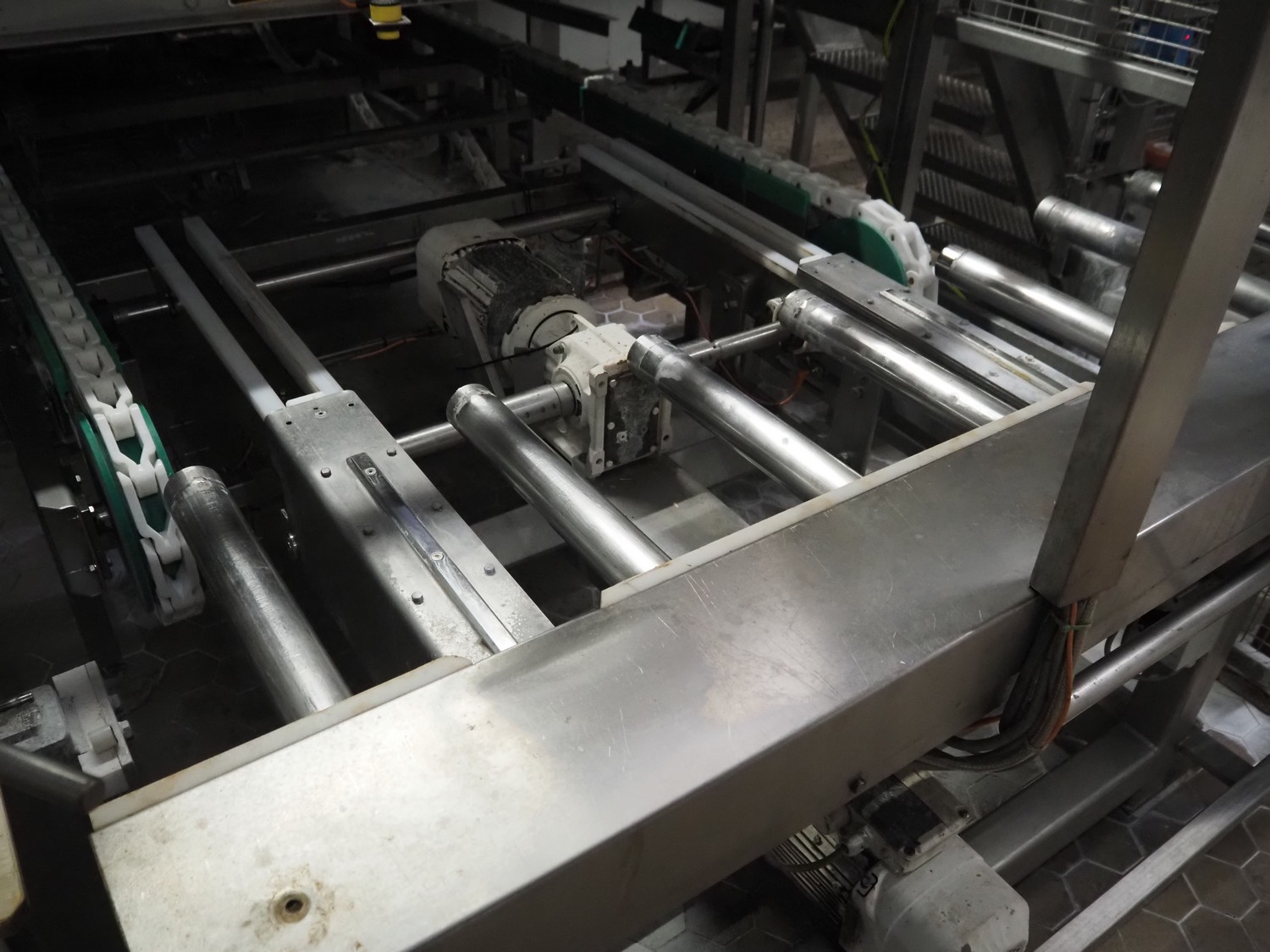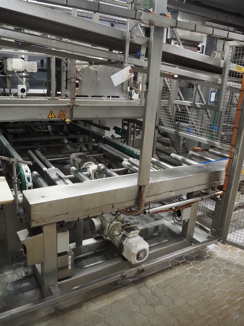 Electrical roller conveyor for cheese boards, roller width: 500 mm, total dimensions: 3600 mm x 900 mm x 1000 mm, including chain conveyor for cheese boards, distance between chains: 1300 mm, total dimensions: 5500 mm x 1800 mm x 900 mm.