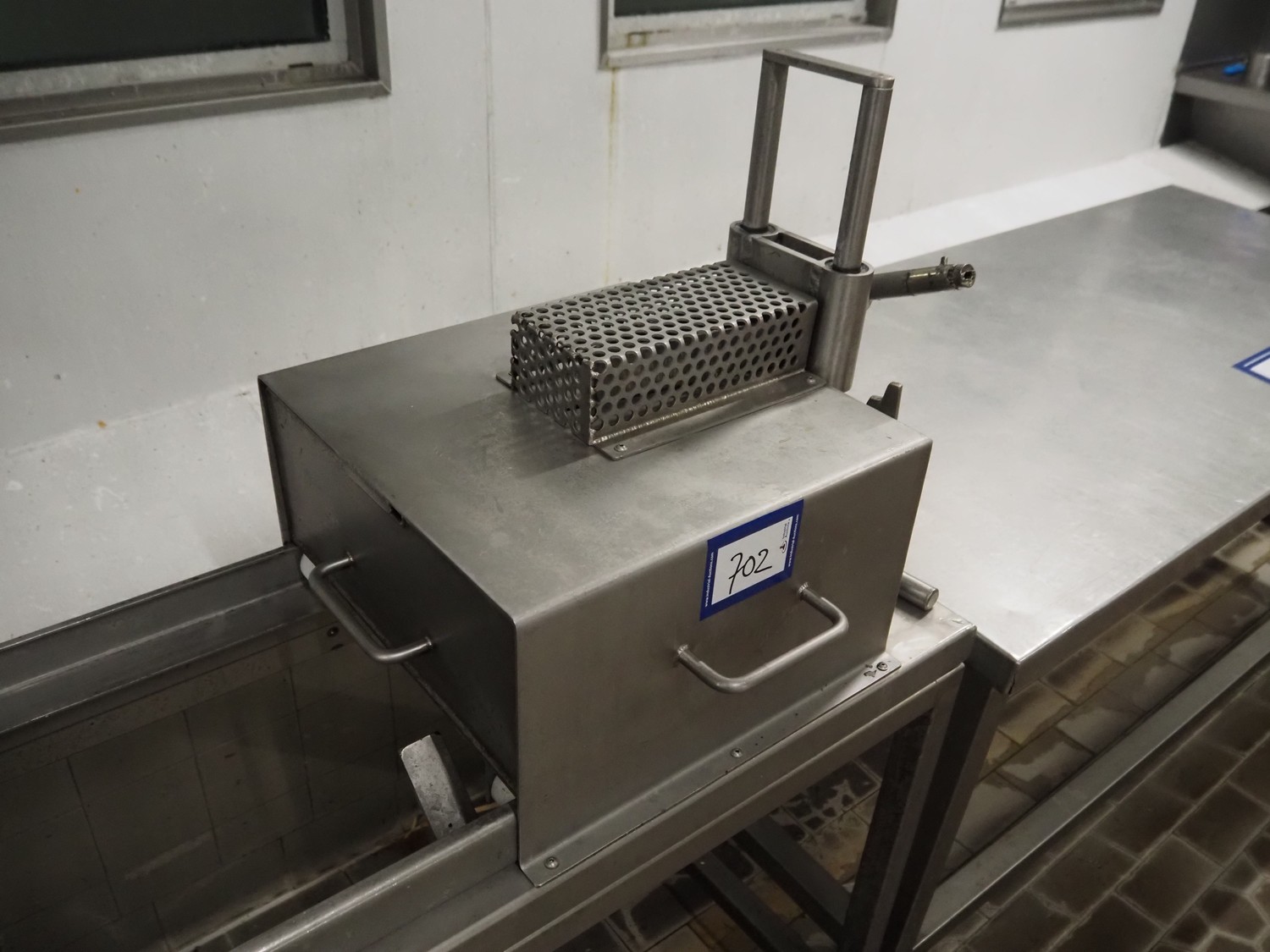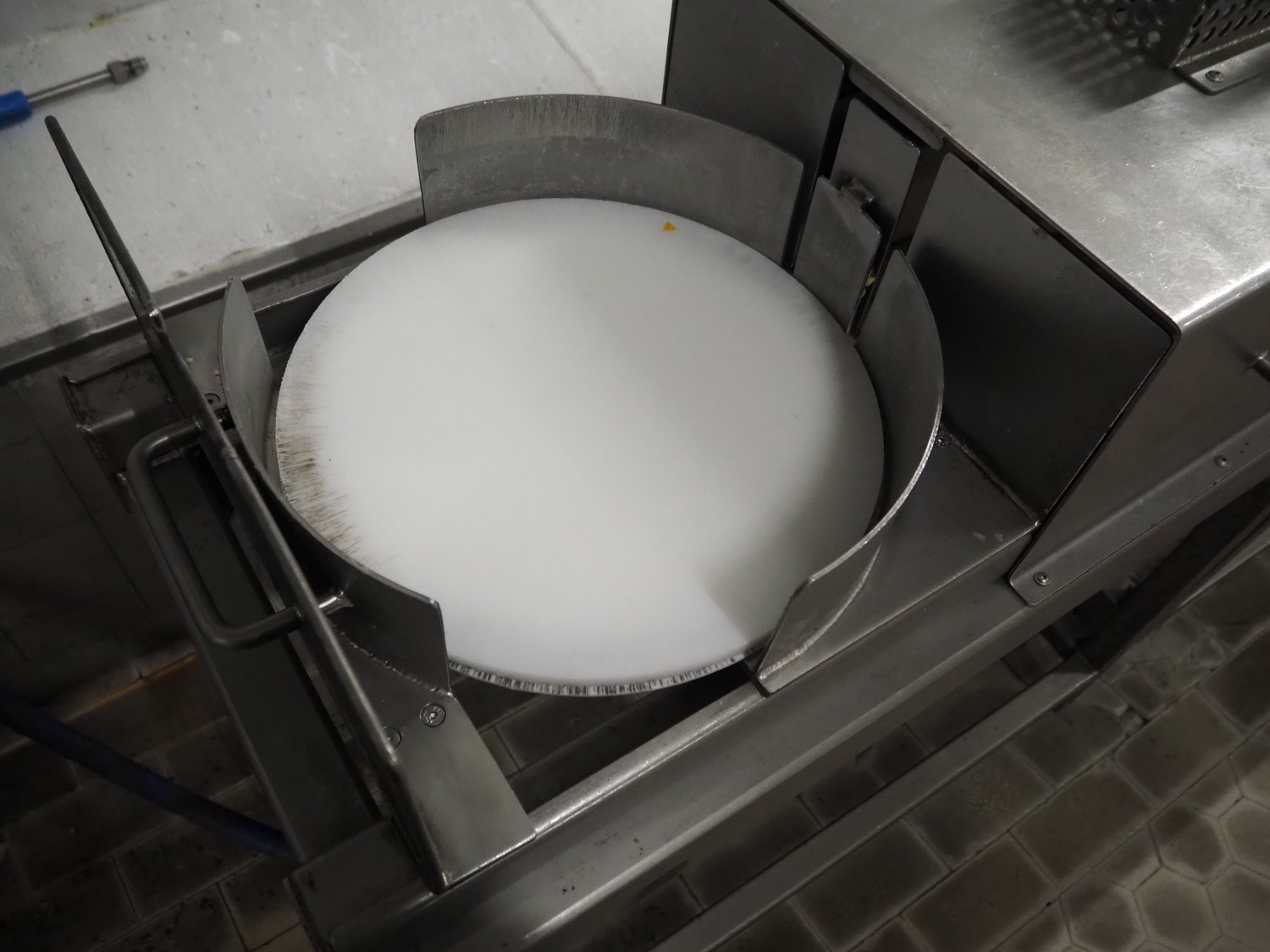 Mobile s/s cheese cutter, max diameter cheese: 370 mm, total dimensions: 1000 mm x 1000 mm x 1400 mm.