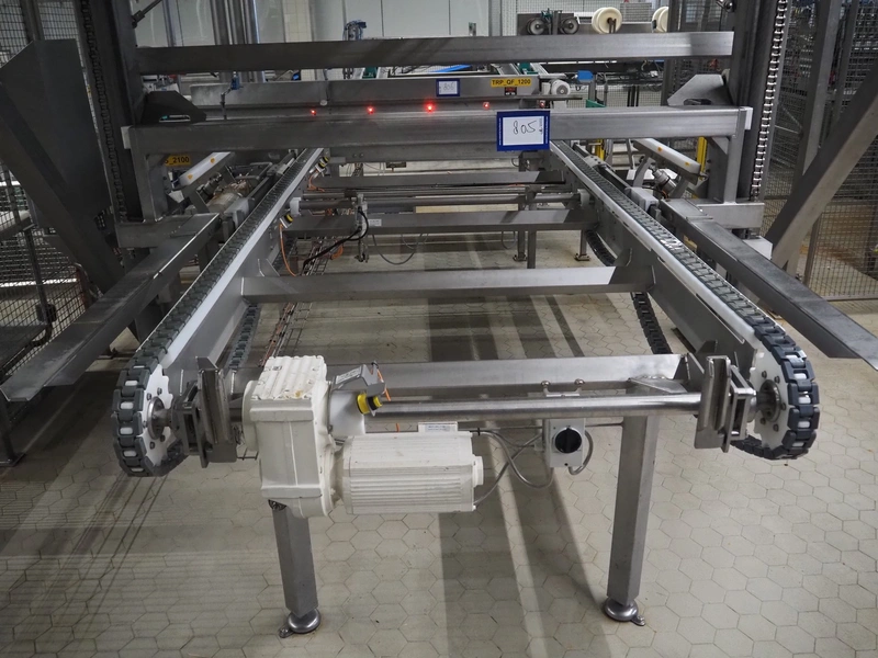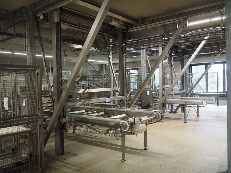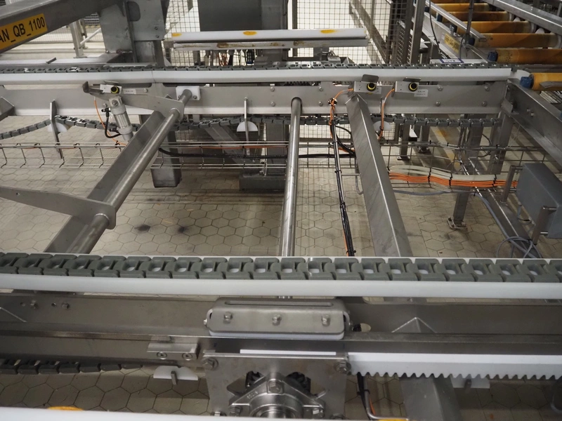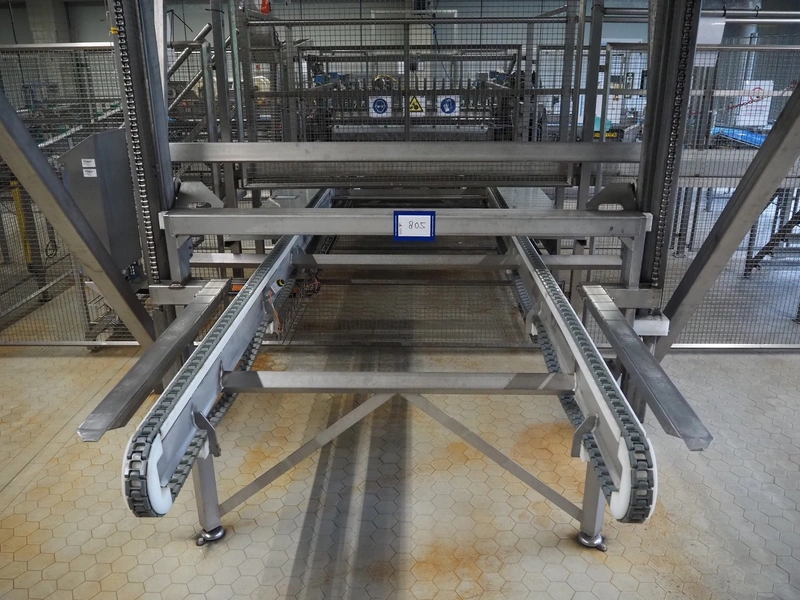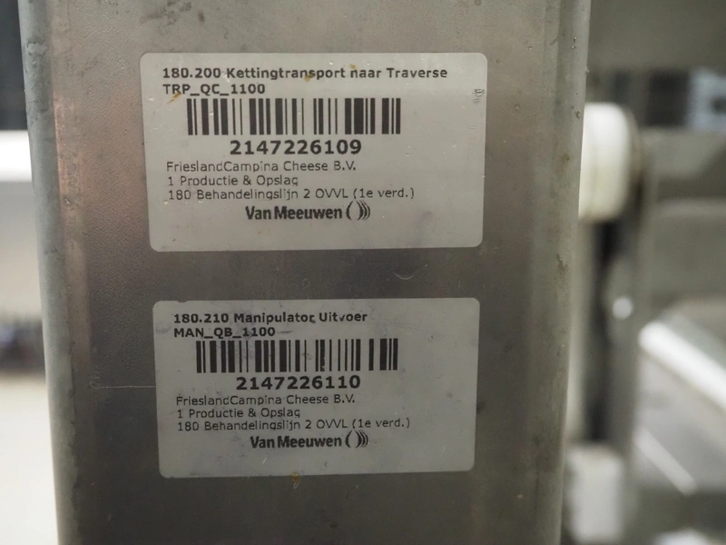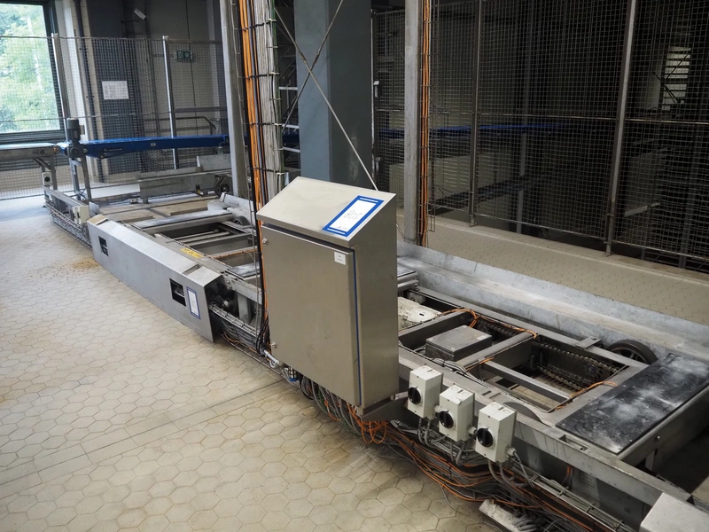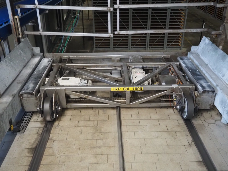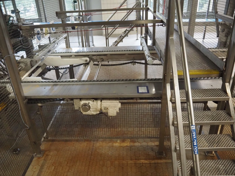 Unloading and loading line for racks with cheese boards, consisting of: Transport system for racks with 3 carts, dimensions carts: (2x) 2000 mm x 1300 mm x 300 mm and (1x) 4800 mm x 1000 mm x 300 mm, total dimensions: 4800 mm x 1000 mm x 300 mm, cheese board rack unloading machine, plastic chain conveyor, belt width: 1460 mm, total dimensions: 6400 mm x 3300 mm x 3450 mm and cheese board rack loading machine, plastic chain conveyor, belt width: 1460 mm, total dimensions: 3600 mm x 3300 mm x 3450 mm.