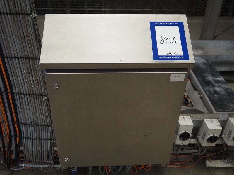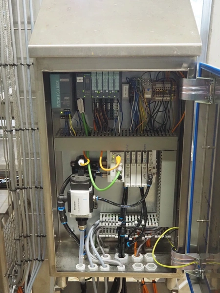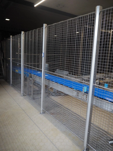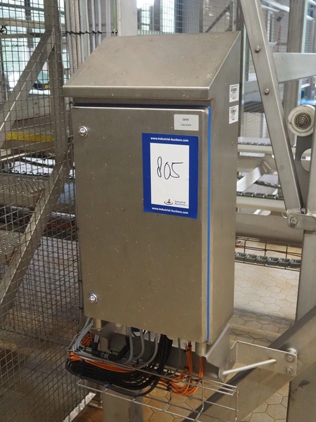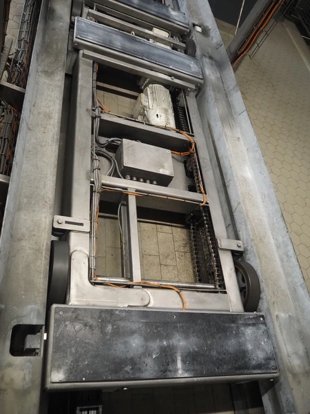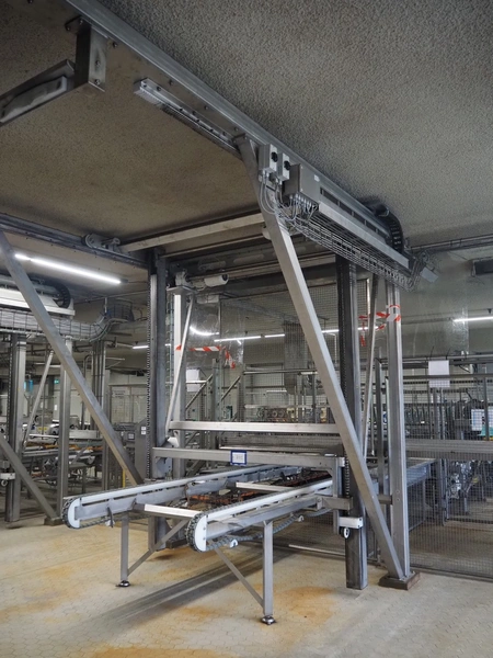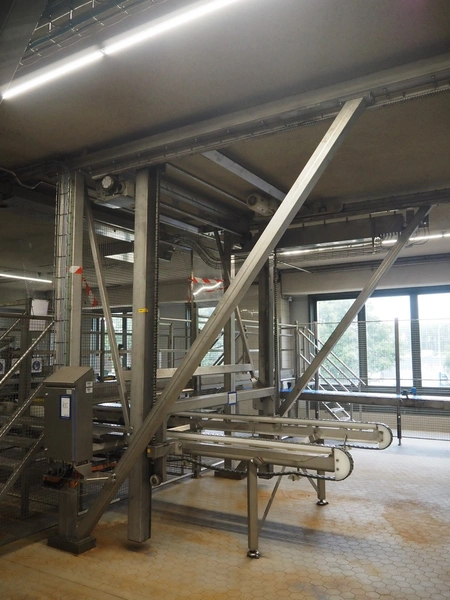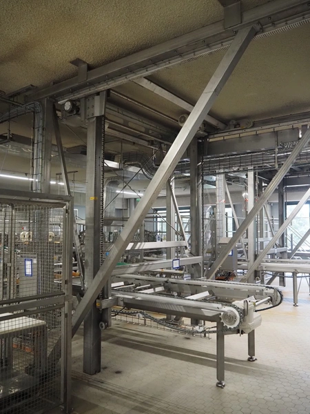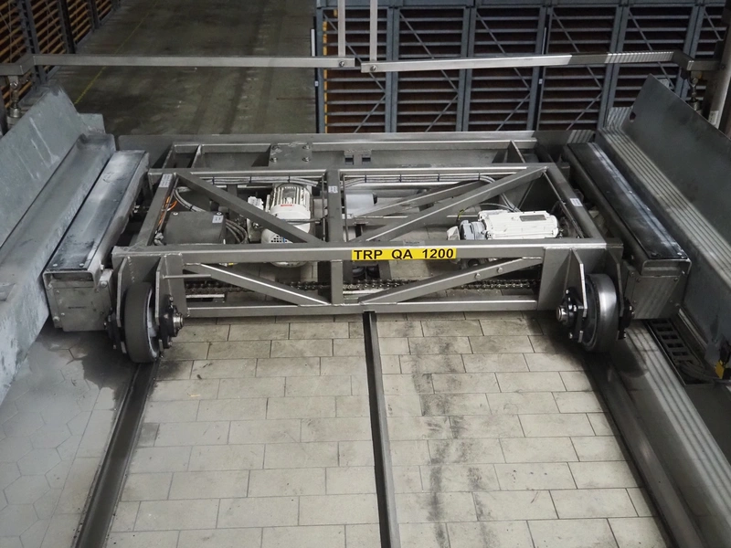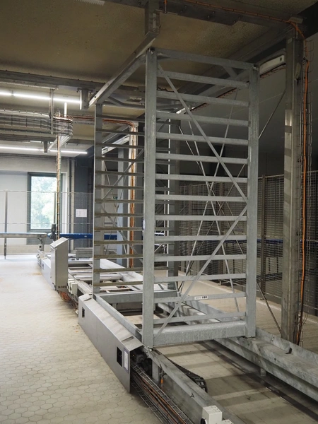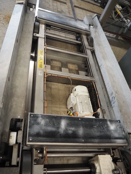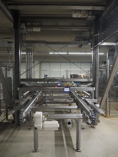 Unloading and loading line for racks with cheese boards, consisting of: Transport system for racks with 3 carts, dimensions carts: (2x) 2000 mm x 1300 mm x 300 mm and (1x) 4800 mm x 1000 mm x 300 mm, total dimensions: 4800 mm x 1000 mm x 300 mm, cheese board rack unloading machine, plastic chain conveyor, belt width: 1460 mm, total dimensions: 6400 mm x 3300 mm x 3450 mm and cheese board rack loading machine, plastic chain conveyor, belt width: 1460 mm, total dimensions: 3600 mm x 3300 mm x 3450 mm.