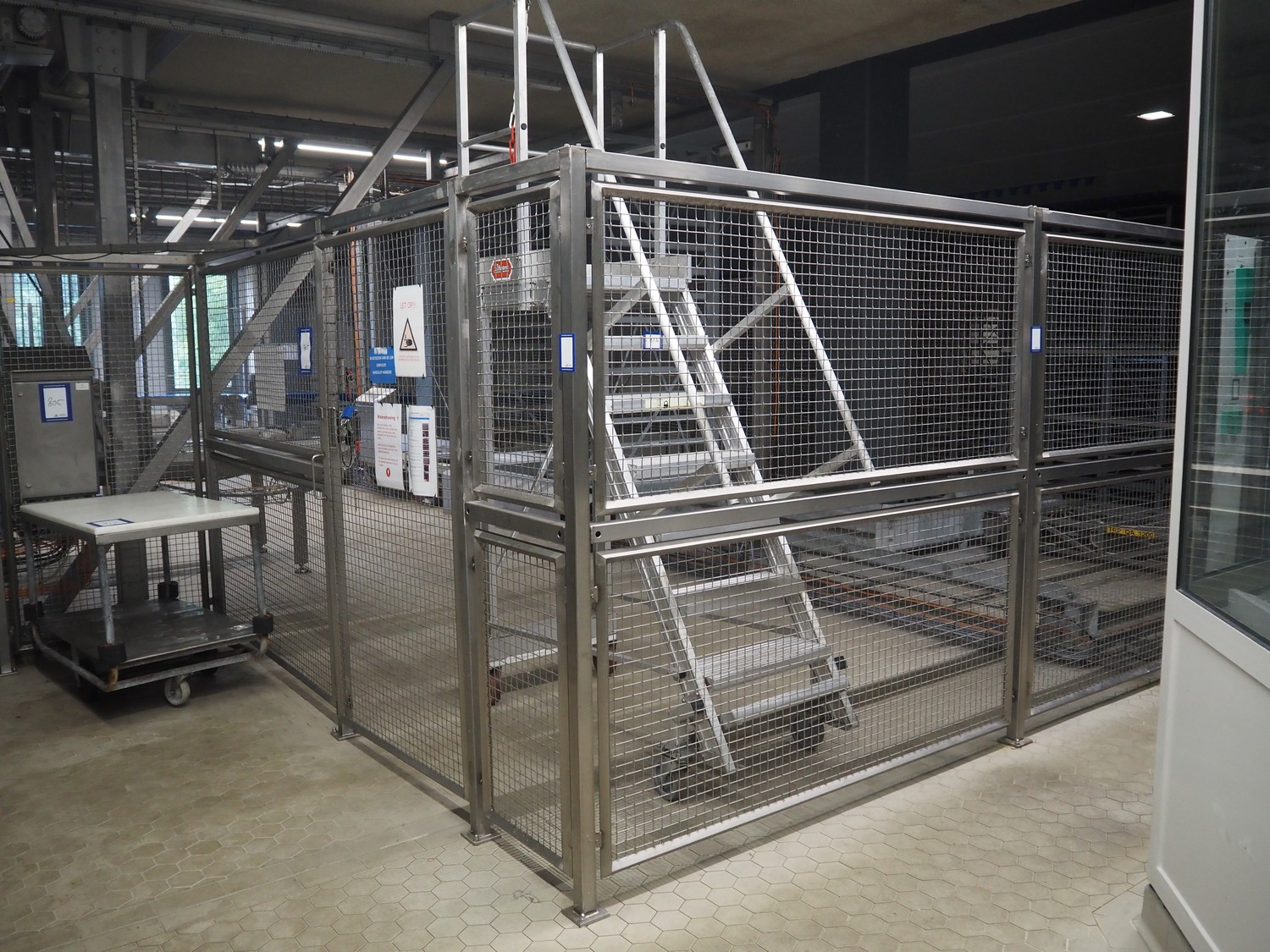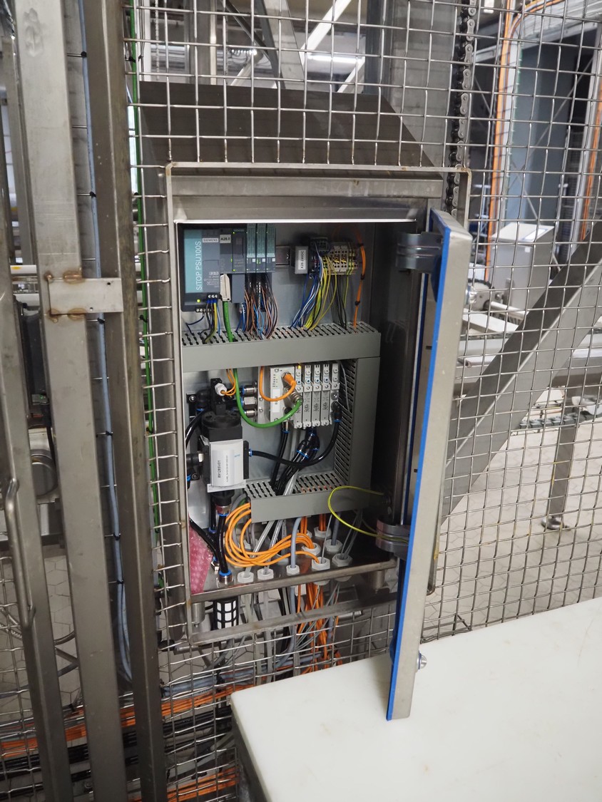 Unloading and loading line for racks with cheese boards, consisting of: Transport system for racks with 3 carts, dimensions carts: (2x) 2000 mm x 1300 mm x 300 mm and (1x) 4800 mm x 1000 mm x 300 mm, total dimensions: 4800 mm x 1000 mm x 300 mm, cheese board rack unloading machine, plastic chain conveyor, belt width: 1460 mm, total dimensions: 6400 mm x 3300 mm x 3450 mm and cheese board rack loading machine, plastic chain conveyor, belt width: 1460 mm, total dimensions: 3600 mm x 3300 mm x 3450 mm.