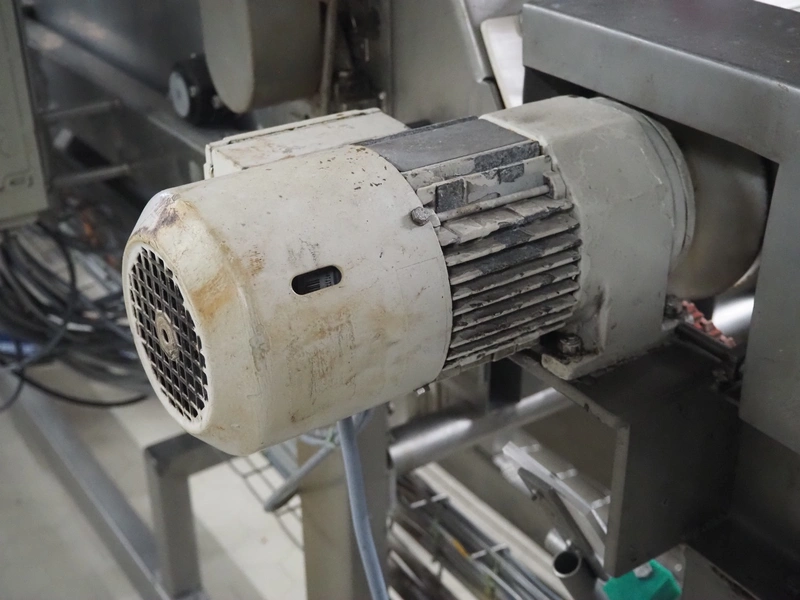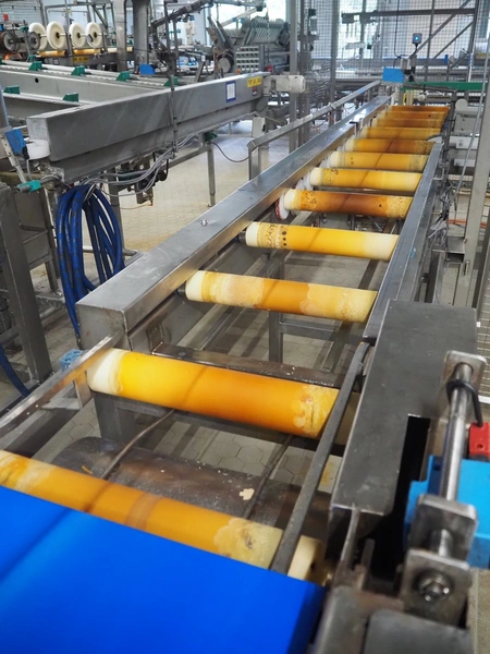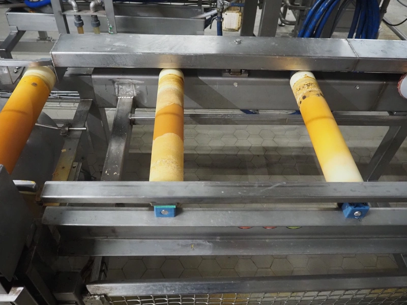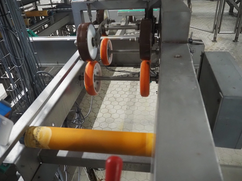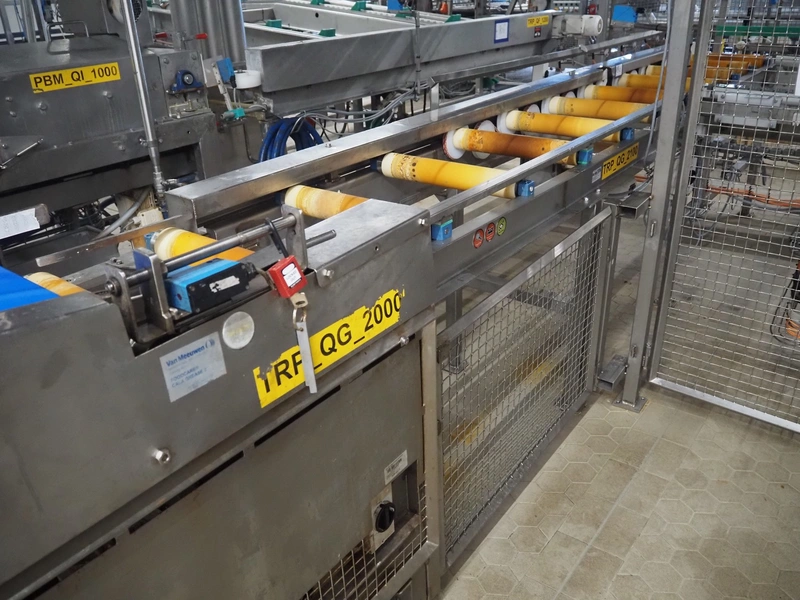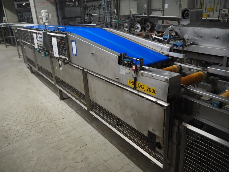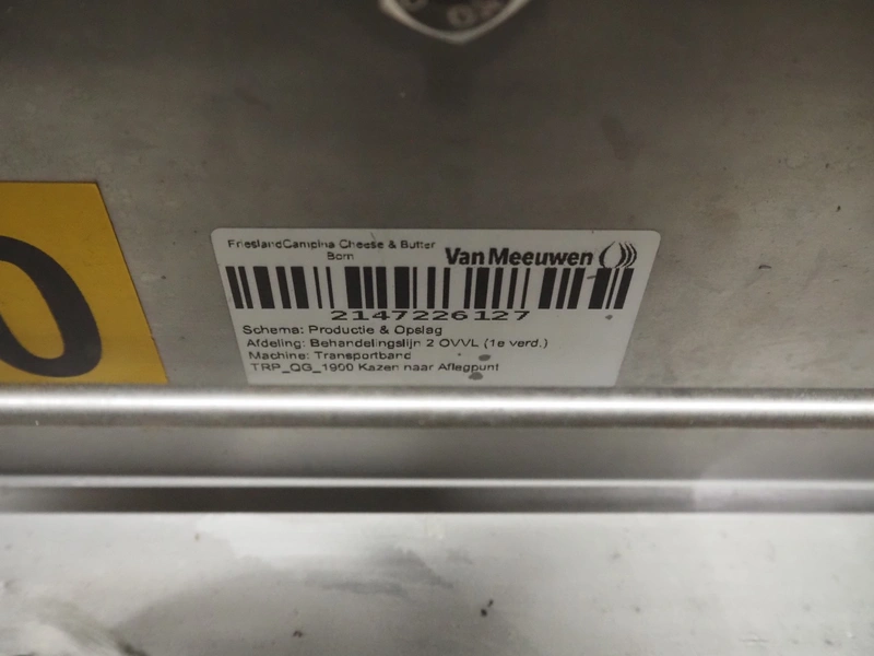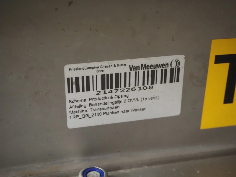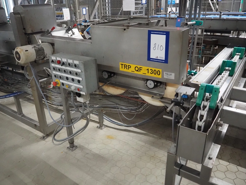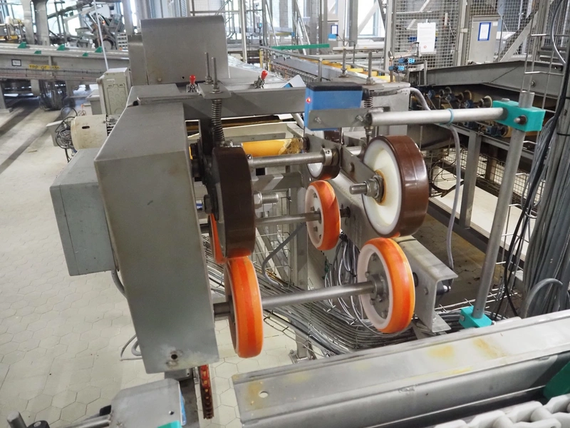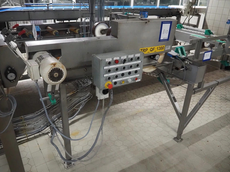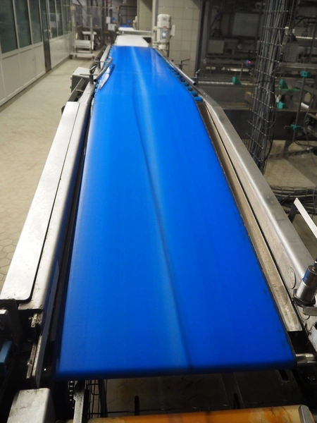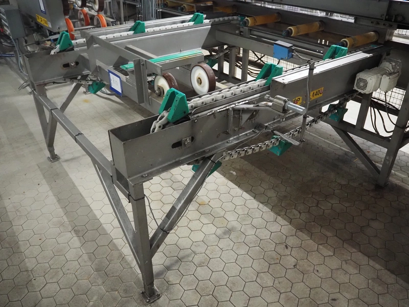 Loading line for wooden cheese boards, consisting of: shuttle conveyor, plastic belt, belt width: 500 mm, total dimensions: 5350 mm x 1000 mm x 1700 mm, plastic chain conveyor with dividers, belt width: 1690 mm, distance between dividers: 540 mm, divider height: 100 mm, total dimensions: 2300 mm x 2200 mm x 1300 mm, electric driven roller conveyor, plastic rollers, roller width: 450 mm, total dimensions: 9500 mm x 900 mm x 1100 mm.