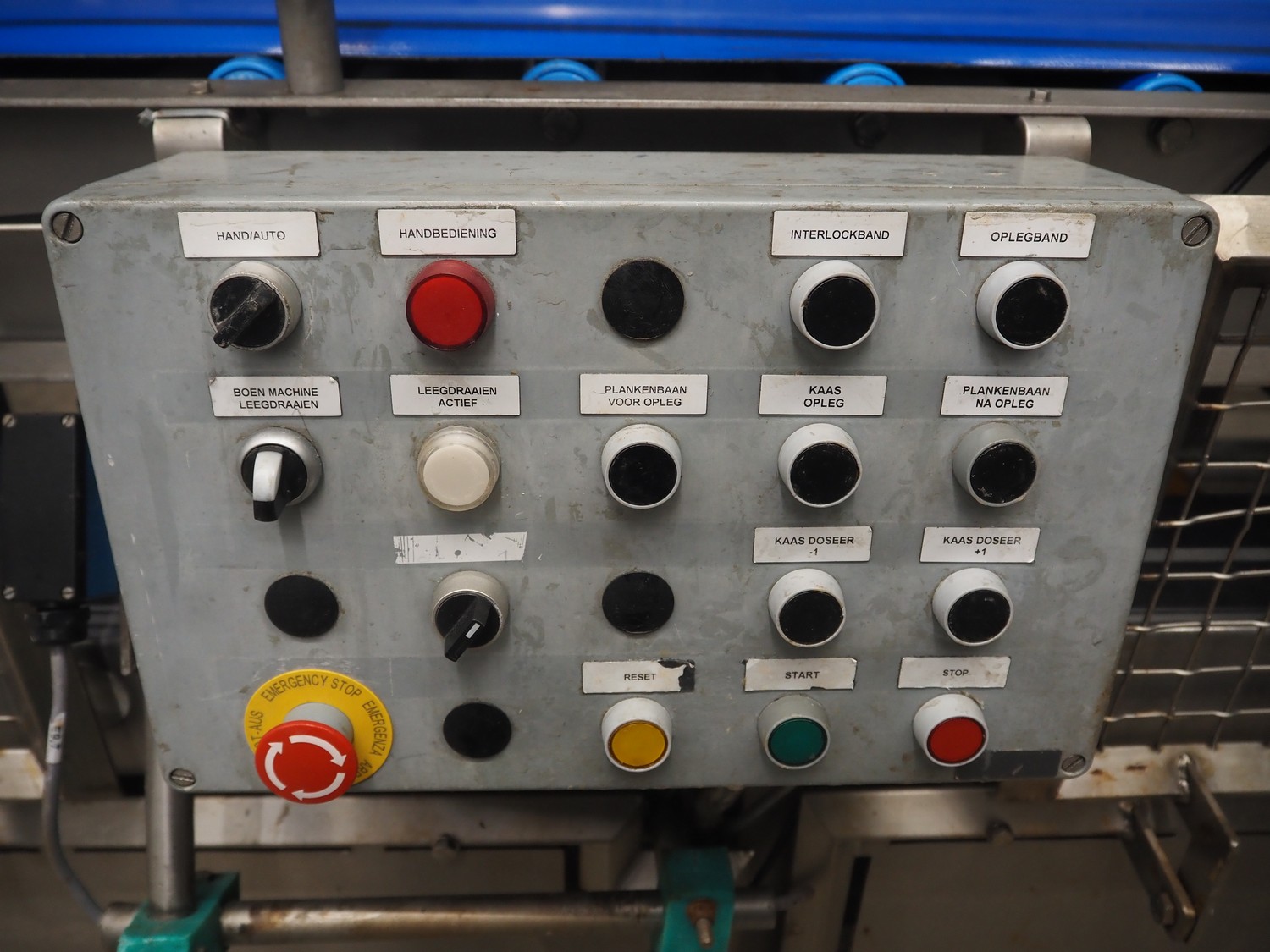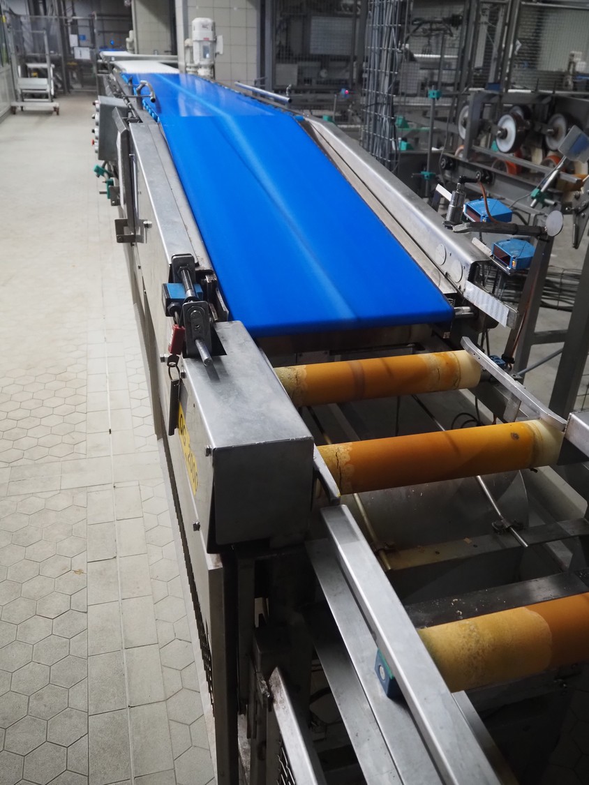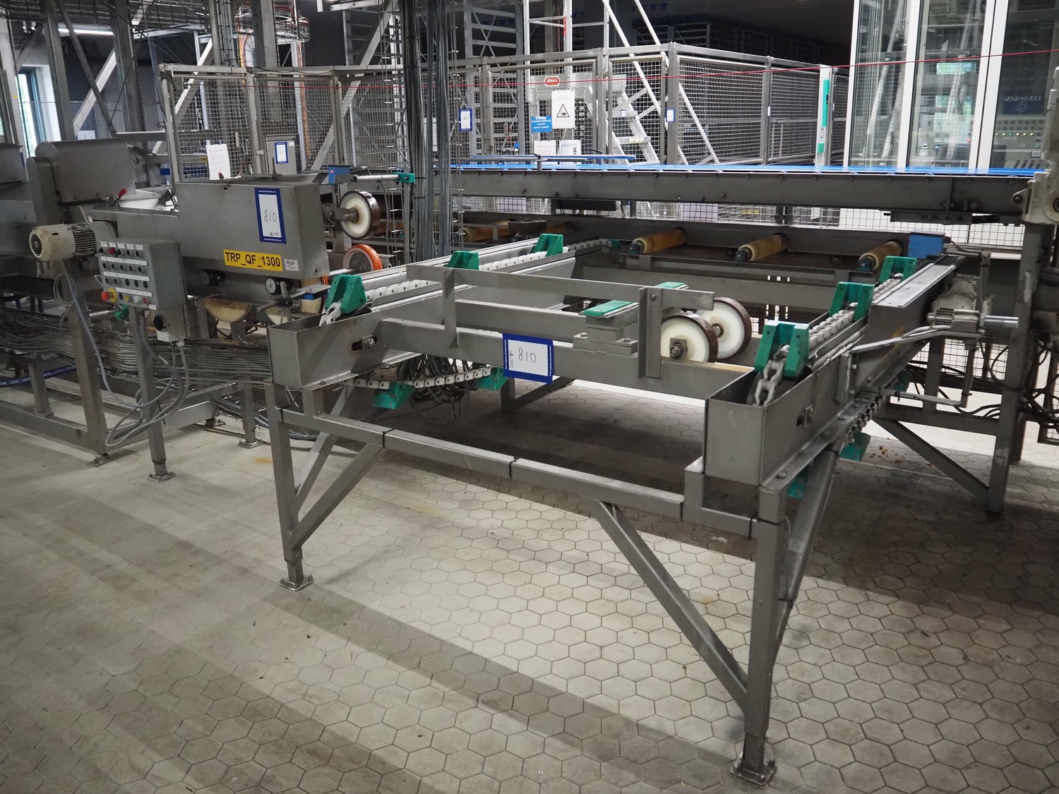Loading line for wooden cheese boards, consisting of: shuttle conveyor, plastic belt, belt width: 500 mm, total dimensions: 5350 mm x 1000 mm x 1700 mm, plastic chain conveyor with dividers, belt width: 1690 mm, distance between dividers: 540 mm, divider height: 100 mm, total dimensions: 2300 mm x 2200 mm x 1300 mm, electric driven roller conveyor, plastic rollers, roller width: 450 mm, total dimensions: 9500 mm x 900 mm x 1100 mm.