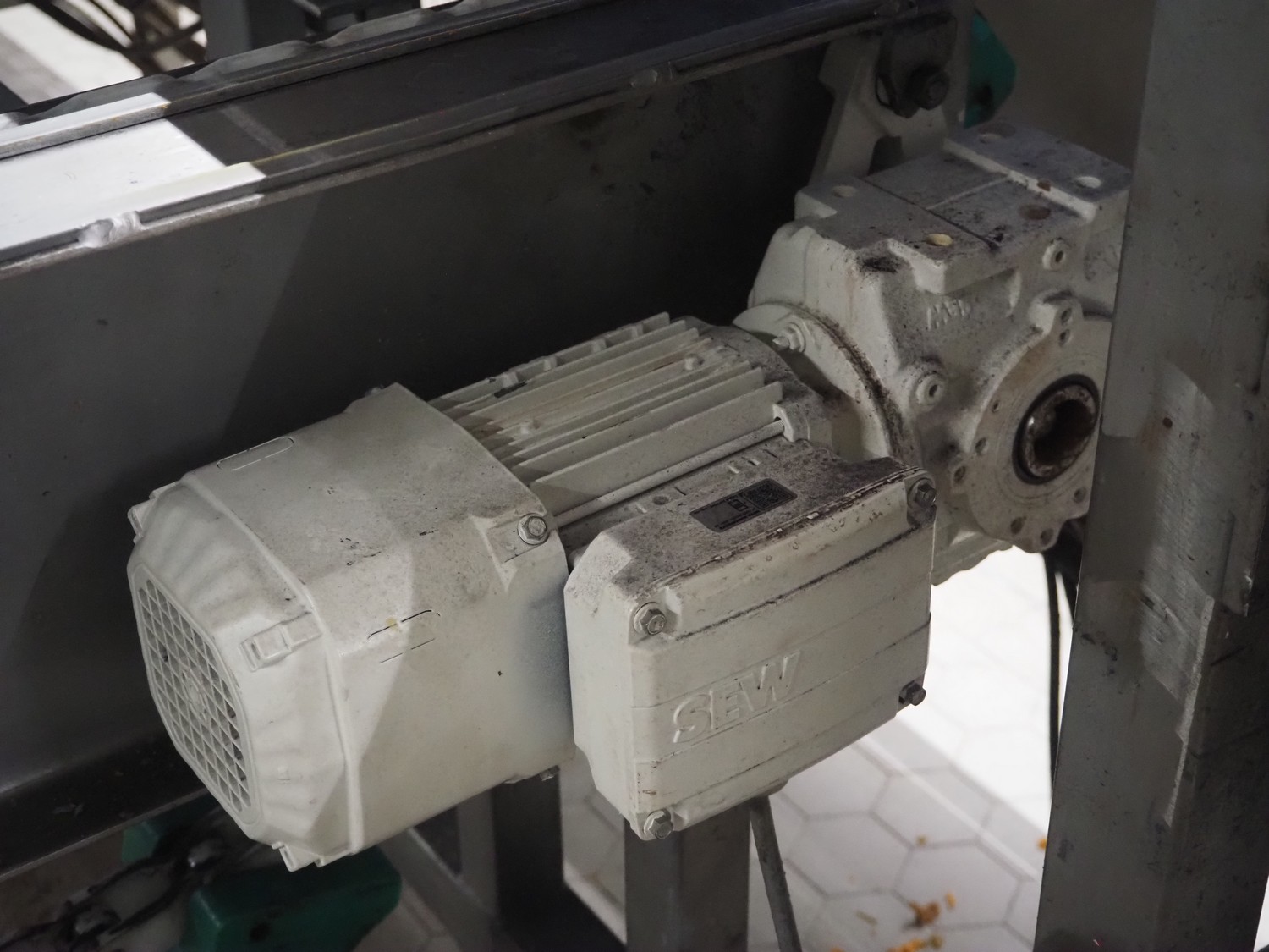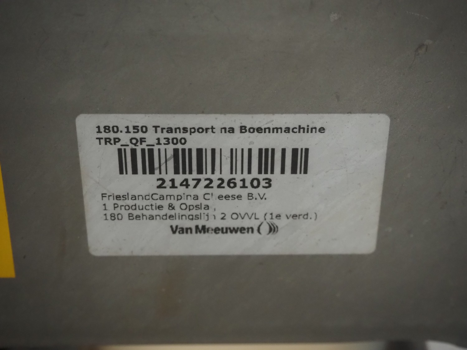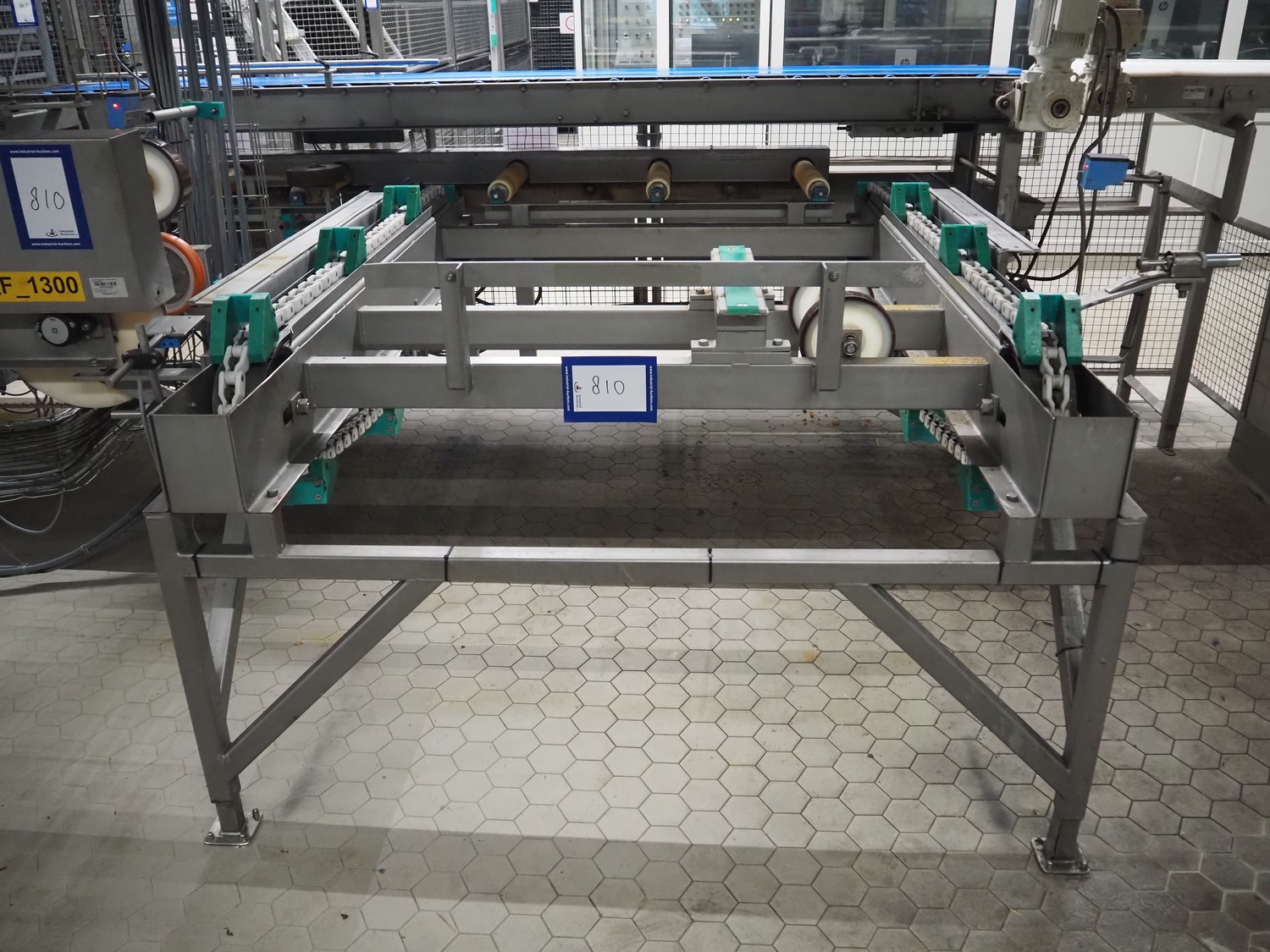 Loading line for wooden cheese boards, consisting of: shuttle conveyor, plastic belt, belt width: 500 mm, total dimensions: 5350 mm x 1000 mm x 1700 mm, plastic chain conveyor with dividers, belt width: 1690 mm, distance between dividers: 540 mm, divider height: 100 mm, total dimensions: 2300 mm x 2200 mm x 1300 mm, electric driven roller conveyor, plastic rollers, roller width: 450 mm, total dimensions: 9500 mm x 900 mm x 1100 mm.