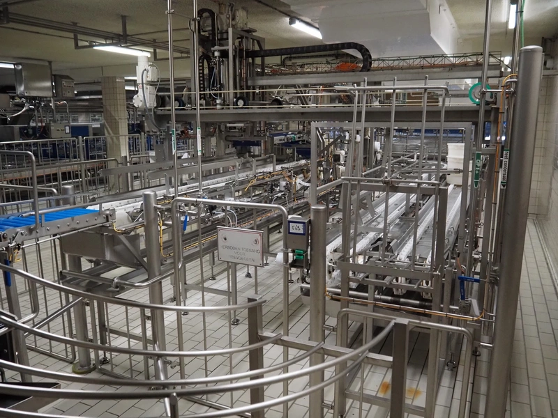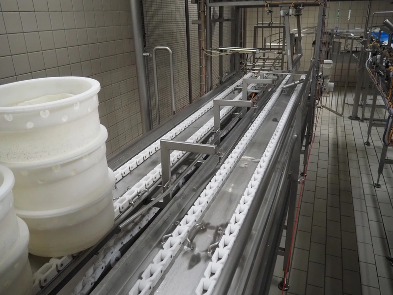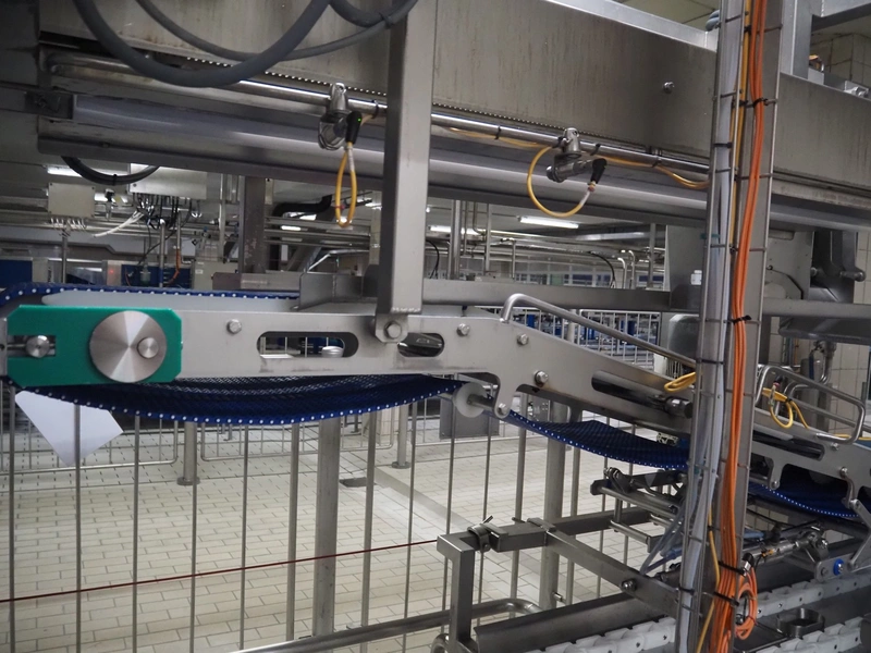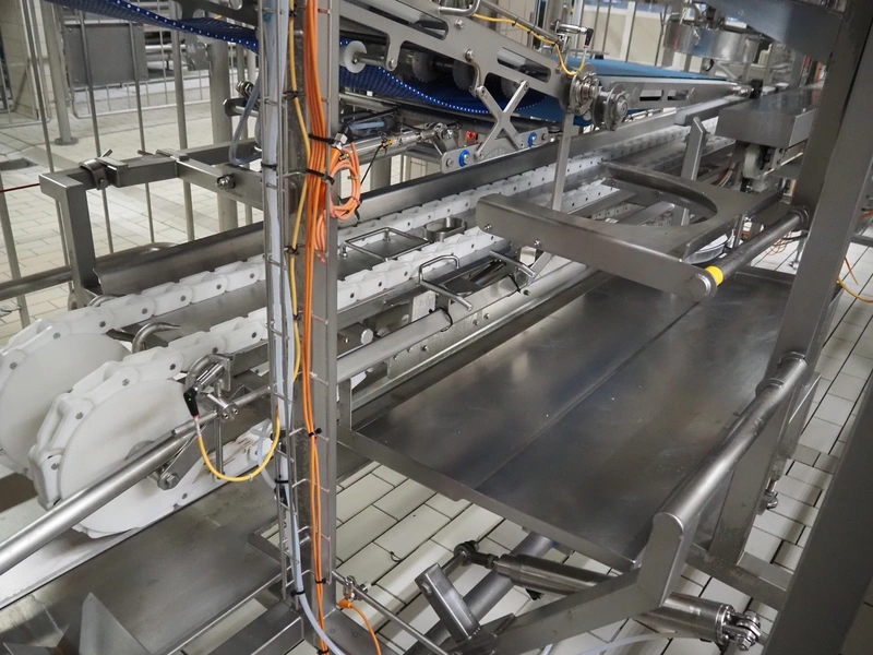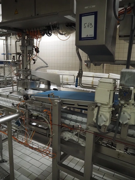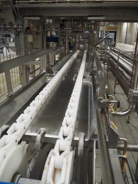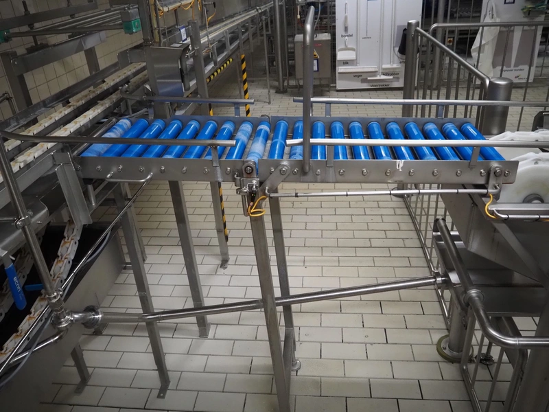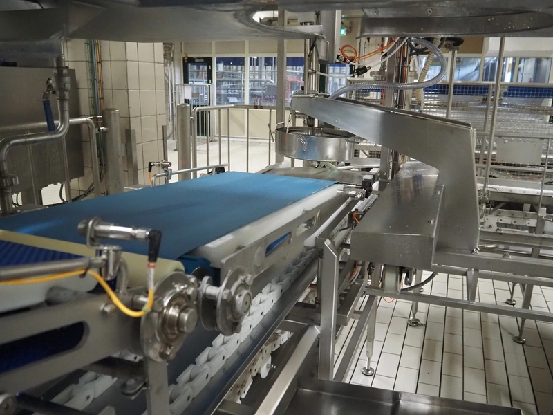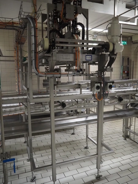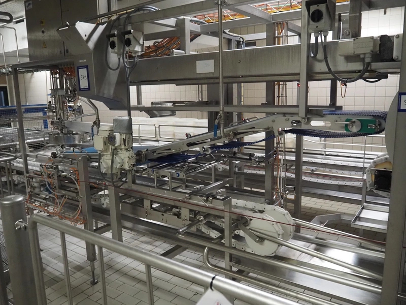 de Klokslag Engineering B.V. cheese turning and repacking installation, plastic belt, belt width: 450 mm, total dimensions: 13000 mm x 3850 mm x 3000 mm.