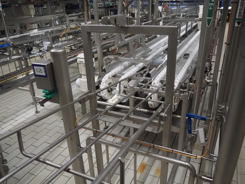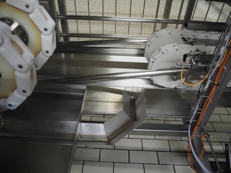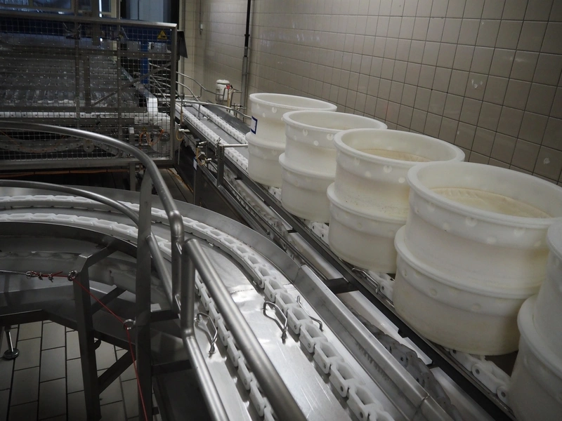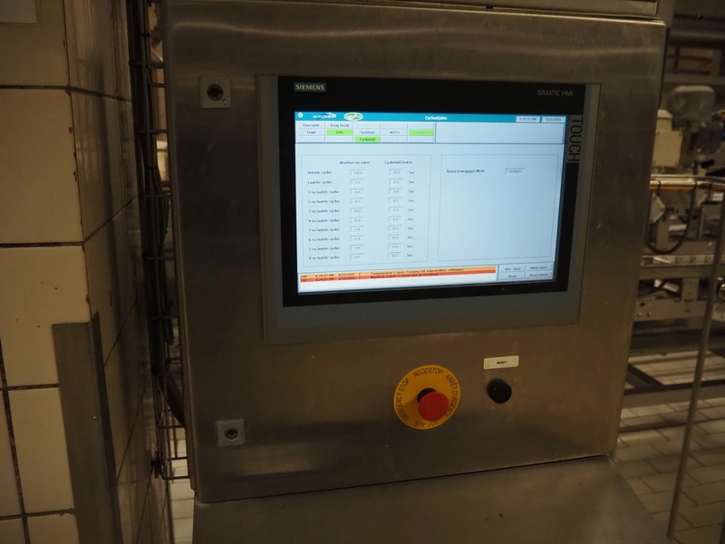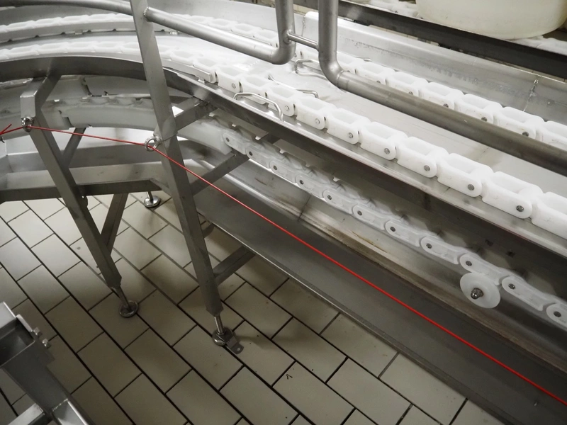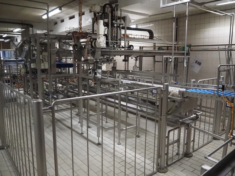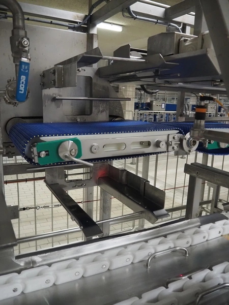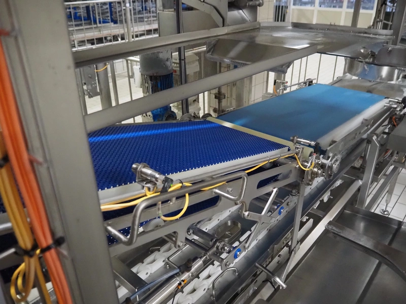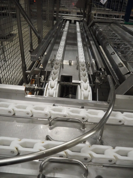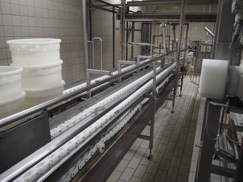 de Klokslag Engineering B.V. cheese turning and repacking installation, plastic belt, belt width: 450 mm, total dimensions: 13000 mm x 3850 mm x 3000 mm.