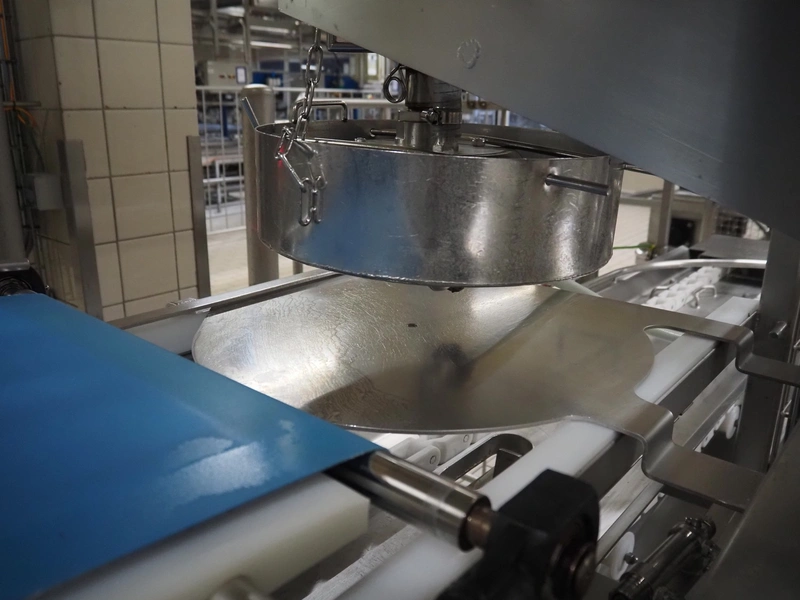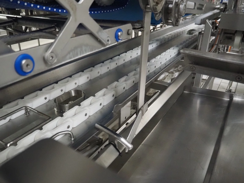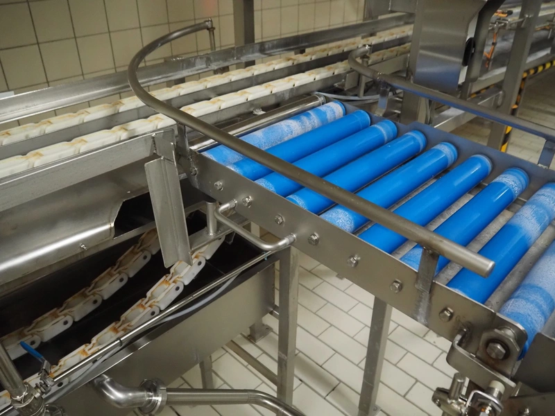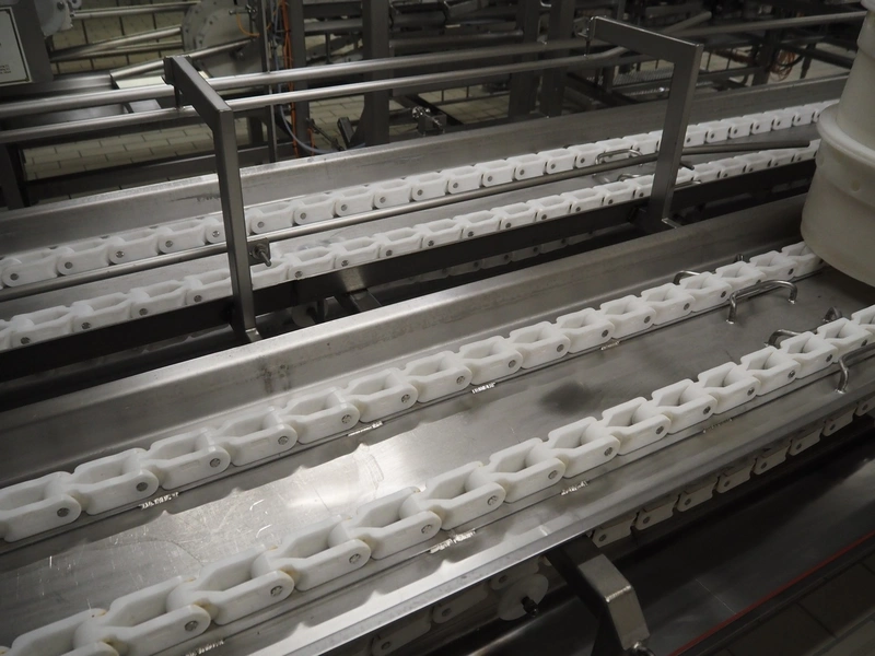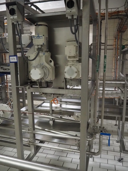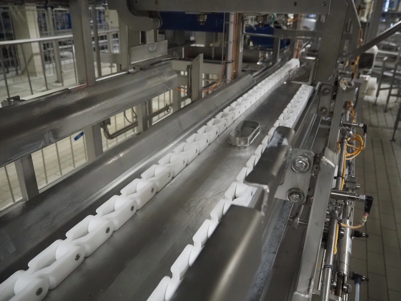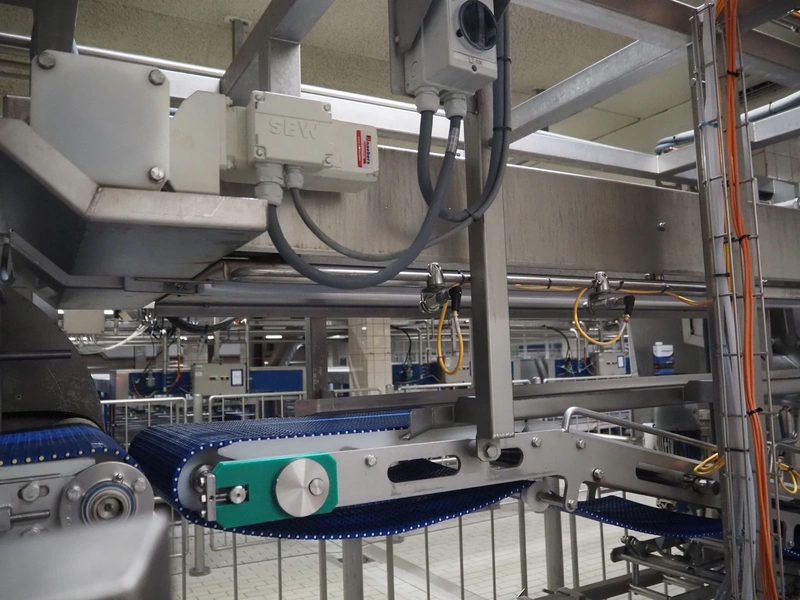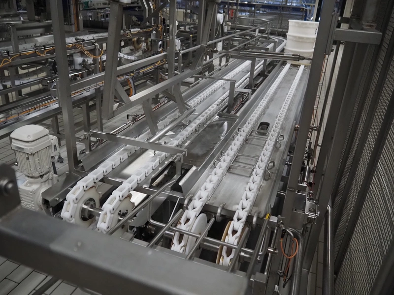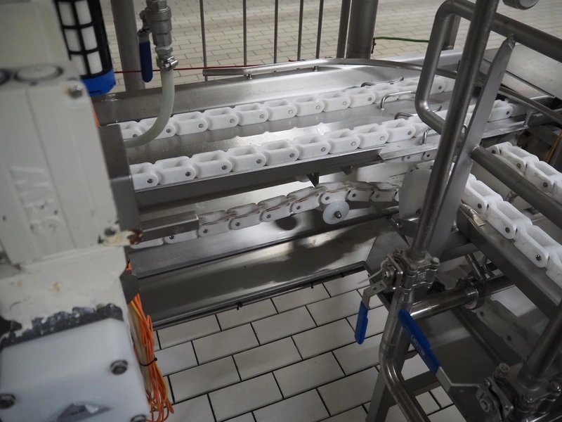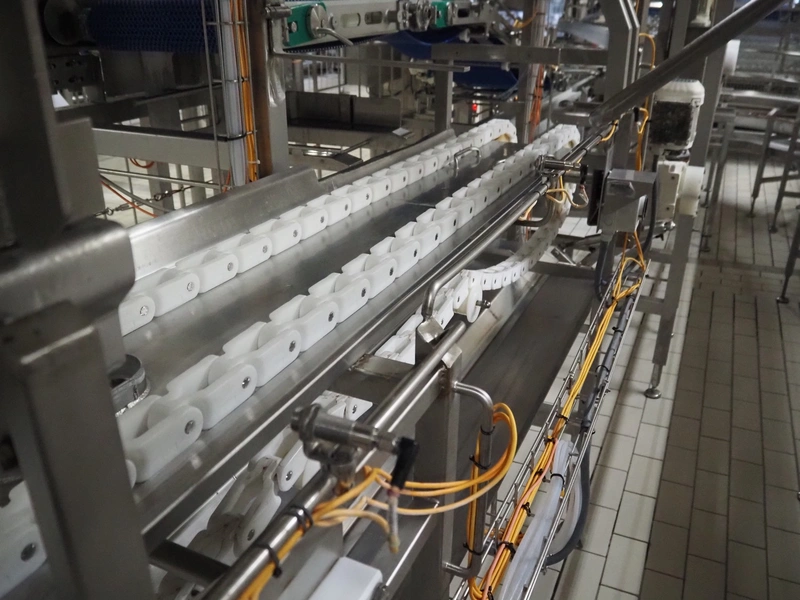 de Klokslag Engineering B.V. cheese turning and repacking installation, plastic belt, belt width: 450 mm, total dimensions: 13000 mm x 3850 mm x 3000 mm.
