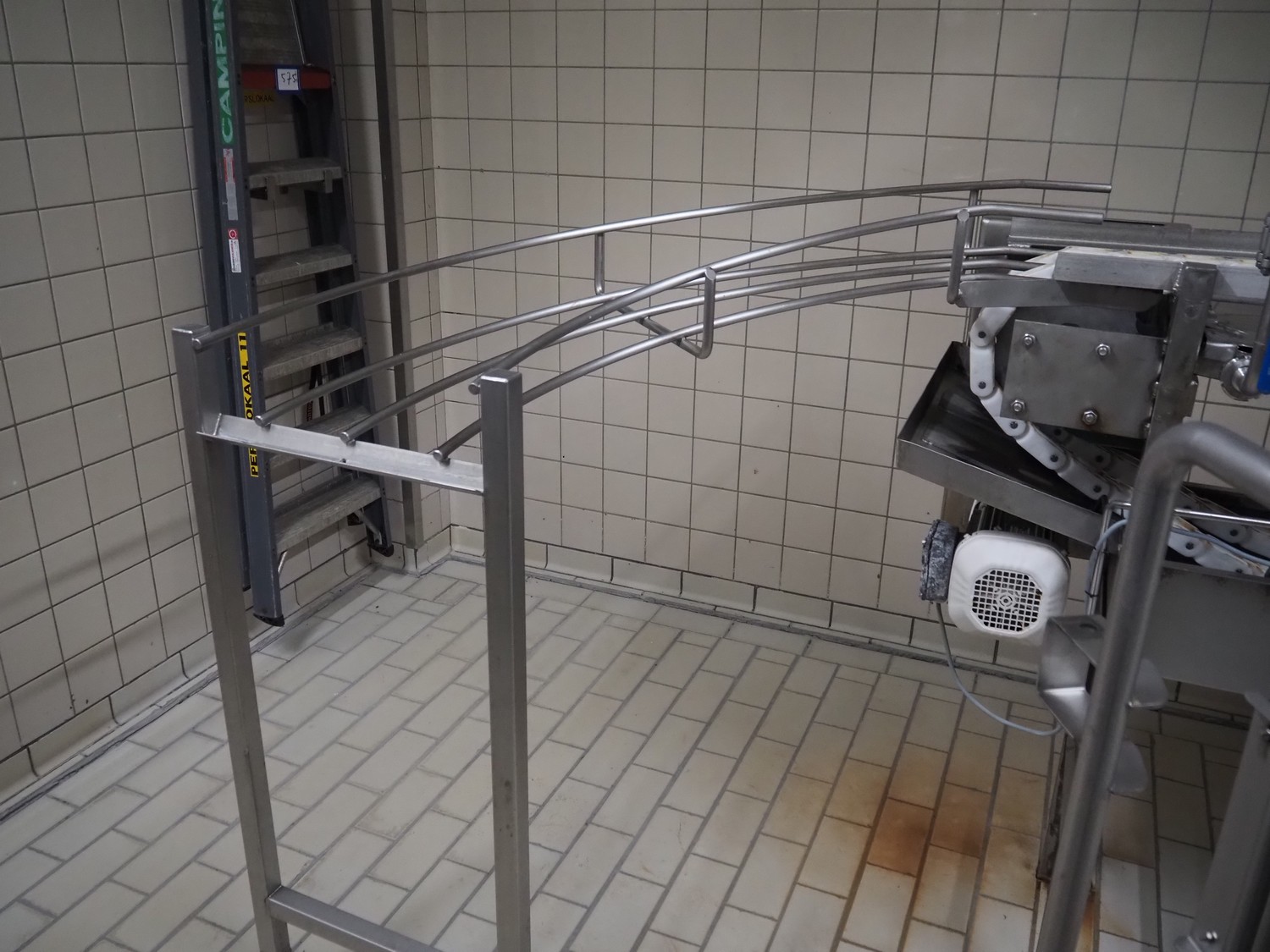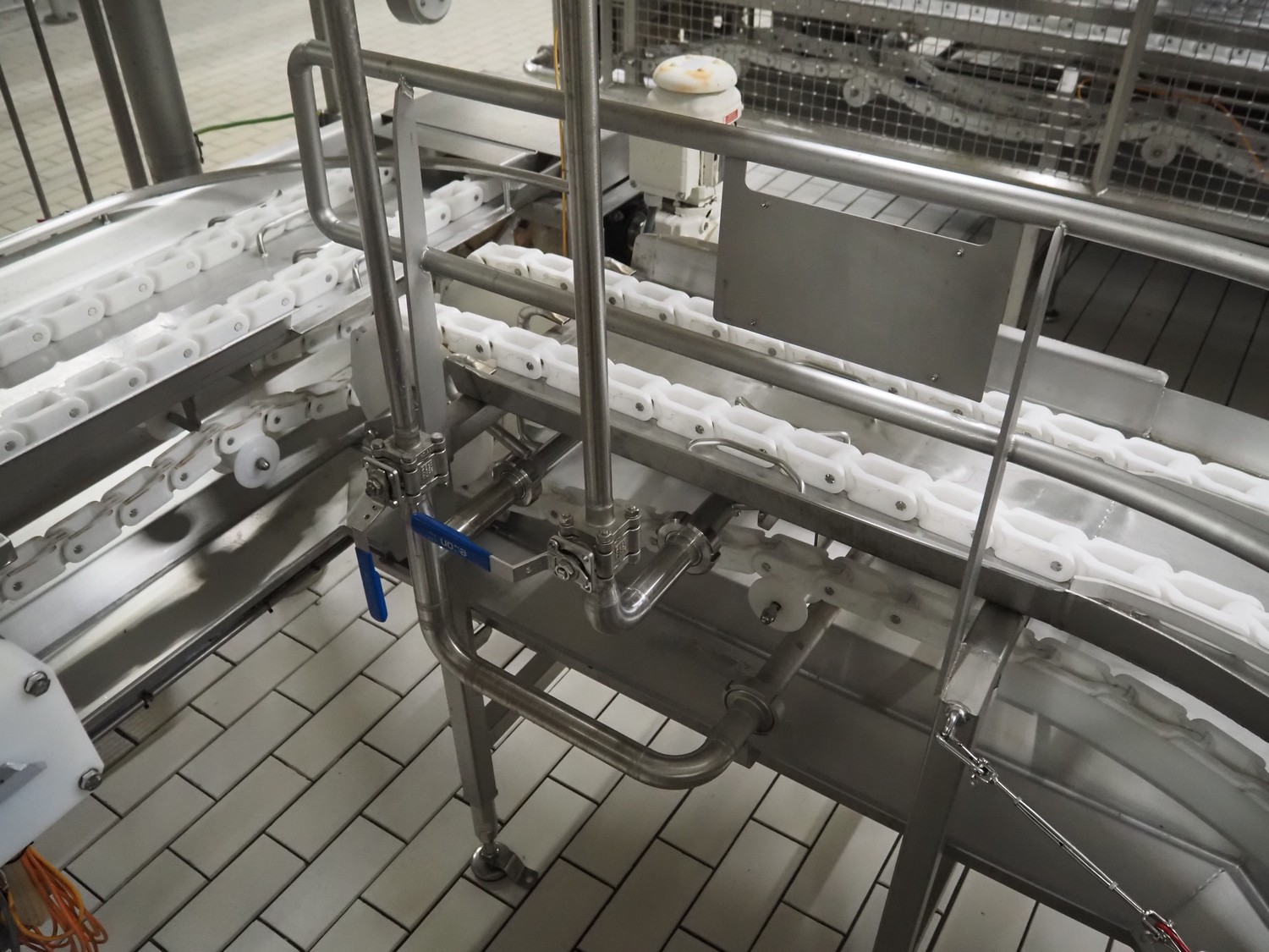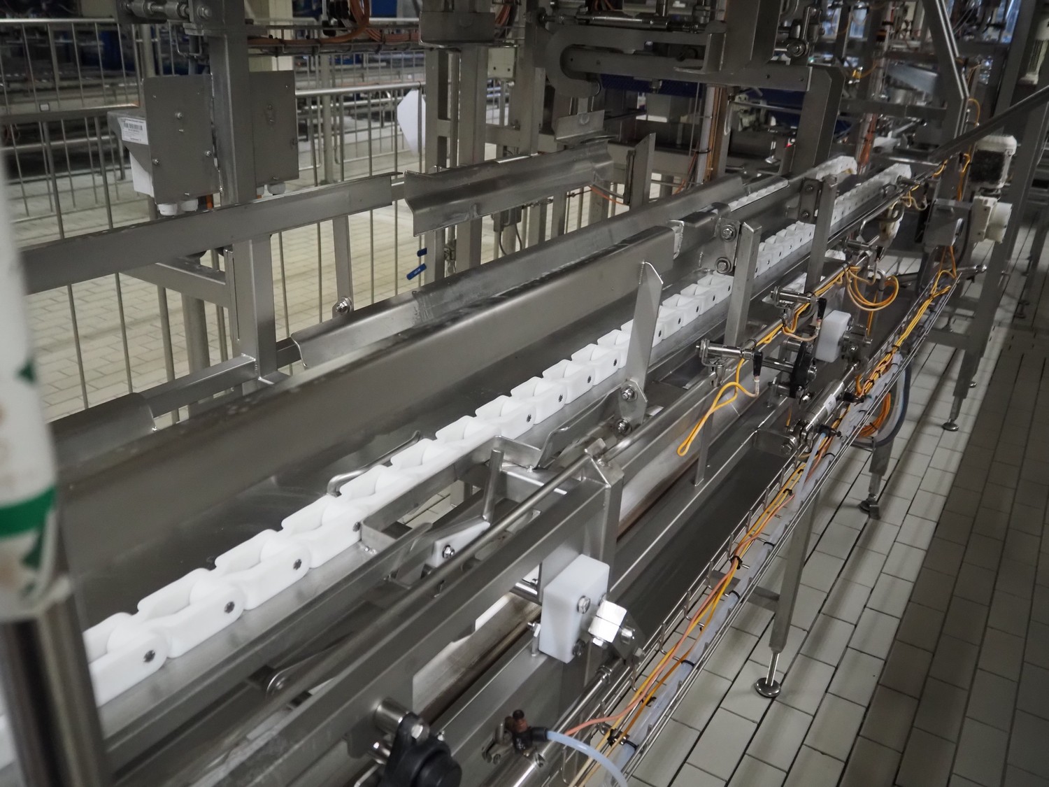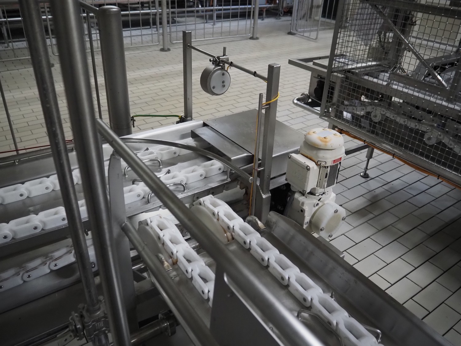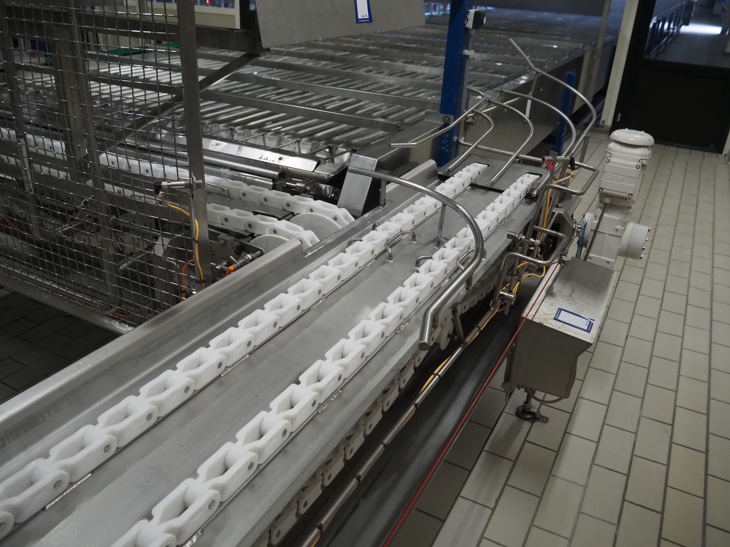 de Klokslag Engineering B.V. cheese turning and repacking installation, plastic belt, belt width: 450 mm, total dimensions: 13000 mm x 3850 mm x 3000 mm.