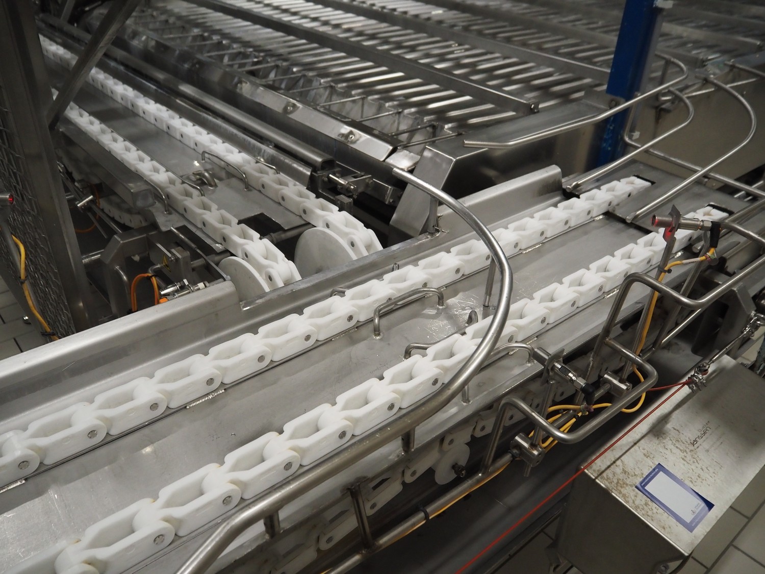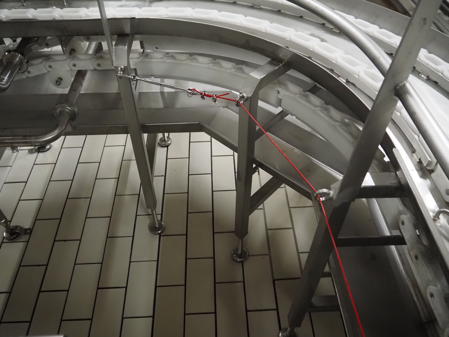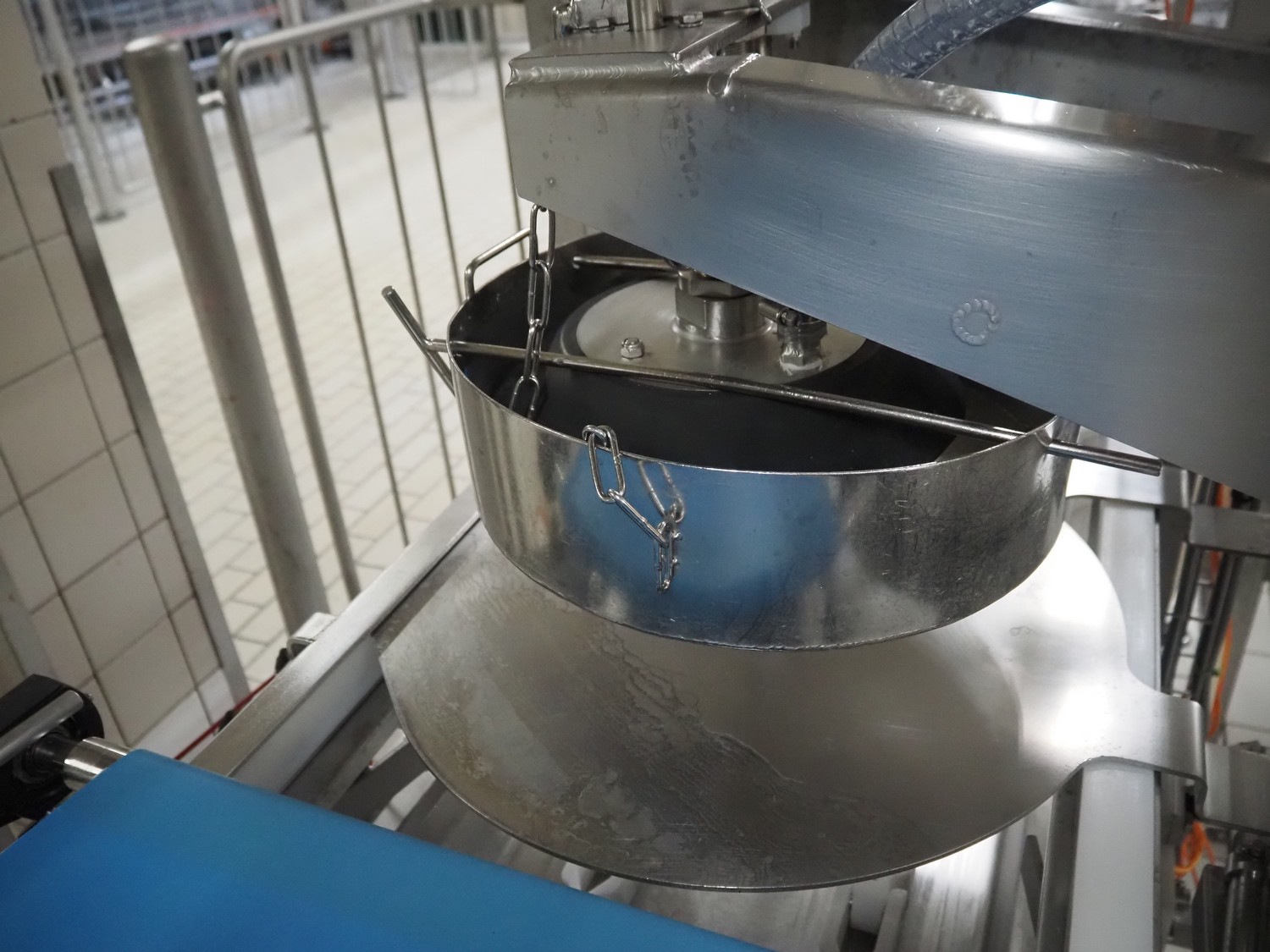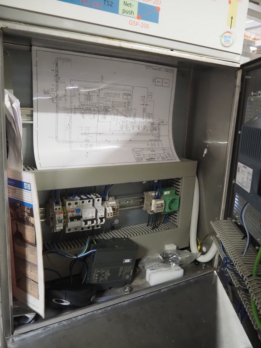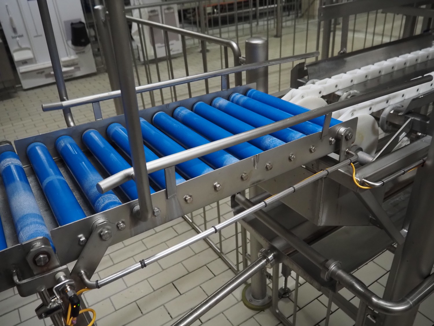 de Klokslag Engineering B.V. cheese turning and repacking installation, plastic belt, belt width: 450 mm, total dimensions: 13000 mm x 3850 mm x 3000 mm.
