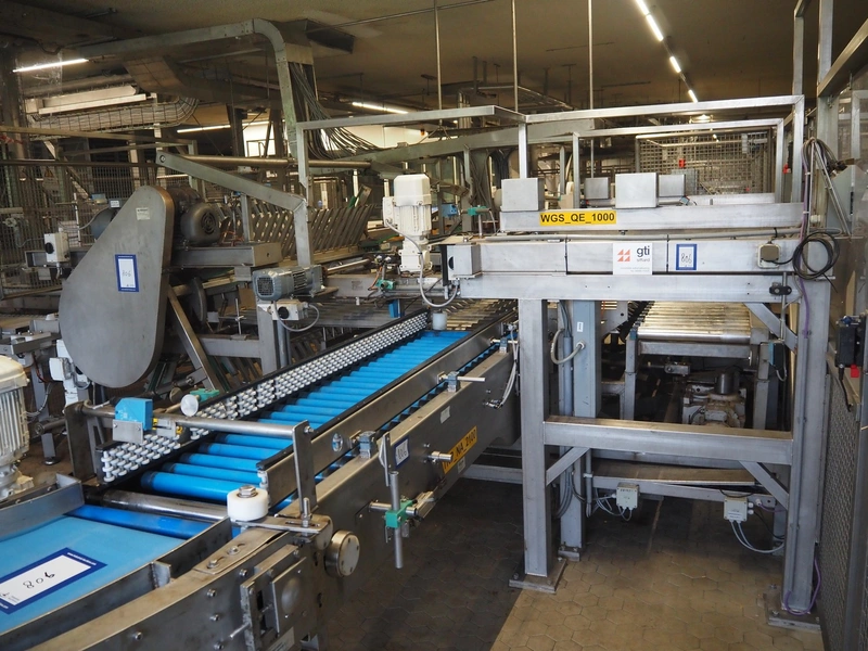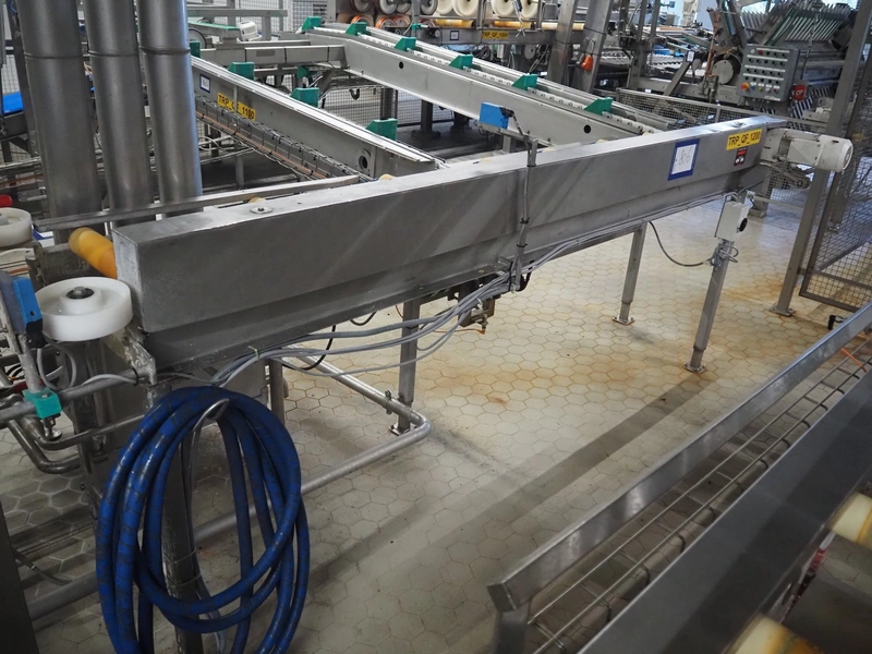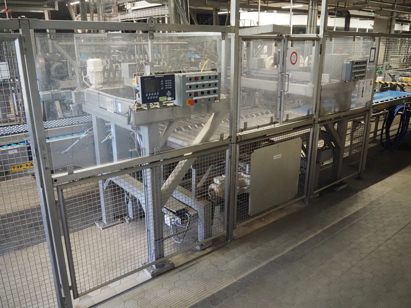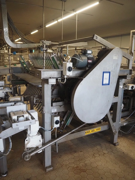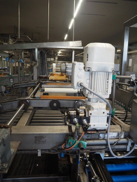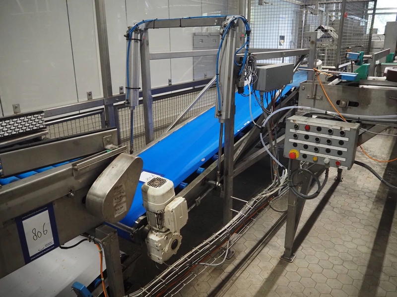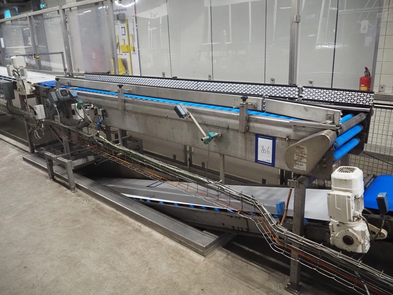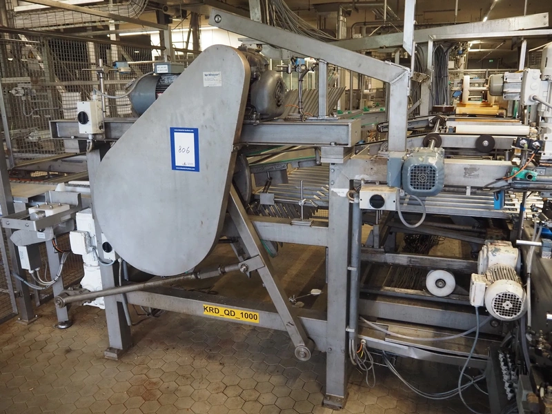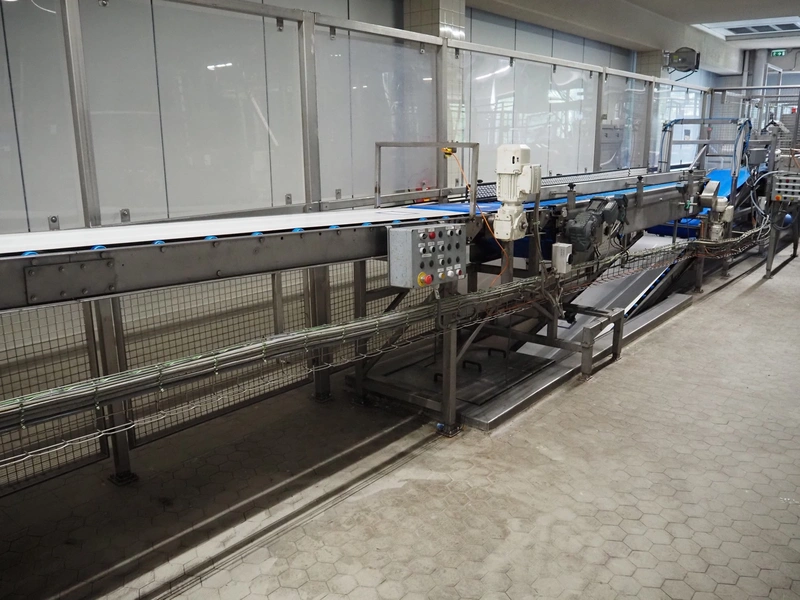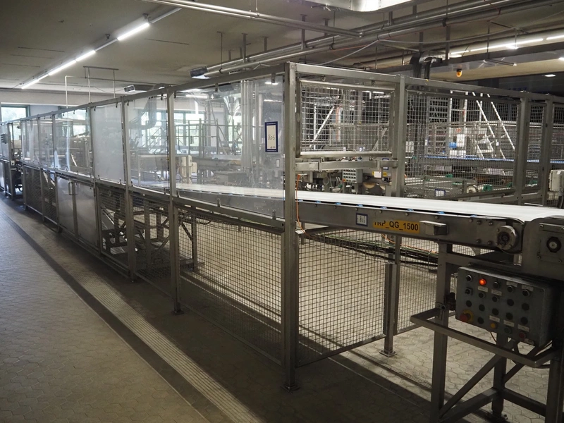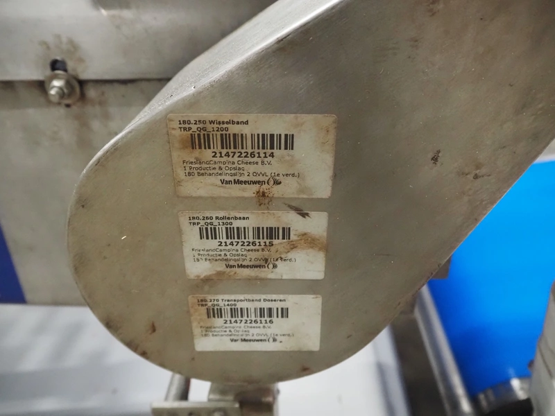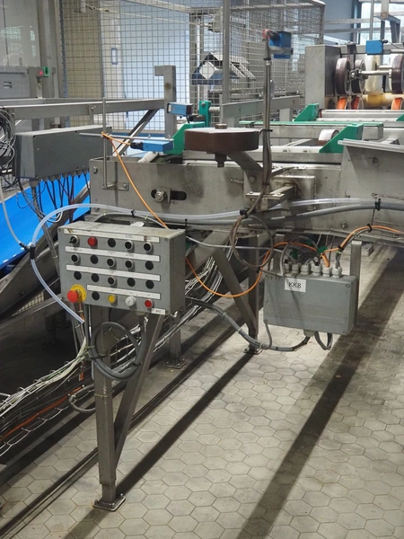 Cheese wheel tilting line, consisting of: Tilting device for cheese wheels with outfeed belt for wooden cheese boards, dimensions: 4200 mm x 3100 mm x 2050 mm, infeed belt for separate cheese wheels, 90° curve conveyor, plastic belt, belt width: 600 mm, electric driven roller conveyor, roller width: 500 mm, total dimensions: 3500 mm x 1300 mm x 1400 mm, scanning and weighing machine, plastic belt, belt width: 500 mm, total dimensions: 3300 mm x 1200 mm x 1900 mm, lane dividing belt, plastic belt, belt width: 500 mm, total dimensions: 2400 mm x 950 mm x 1700 mm, electric driven roller conveyor, plastic rollers, roller width: 500 mm, total dimensions: 2900 mm x 950 mm x 1150 mm, elevating belt, plastic belt, belt width: 500 mm, elevating height: 1300 mm, total dimensions: 5000 mm x 1000 mm x 1600 mm, roller conveyor for cheese boards, plastic rollers, roller width: 460 mm, total dimensions: 5800 mm x 800 mm x 800 mm, de-elevating belt for cheese boards, plastic chain conveyor with dividers, belt width: 1690 mm, distance between dividers: 420 mm, divider height: 100 mm, de-elevation: 1400 mm to 1100 mm, total dimensions: 3600 mm x 2200 mm x 1700 mm, roller conveyor for cheese boards, plastic rollers, roller width: 450 mm, total dimensions: 3400 mm x 900 mm x 1250 mm, outfeed belt, plastic belt, belt width: 500 mm, total dimensions: 4500 mm x 700 mm x 850 mm, and with various safety fences.