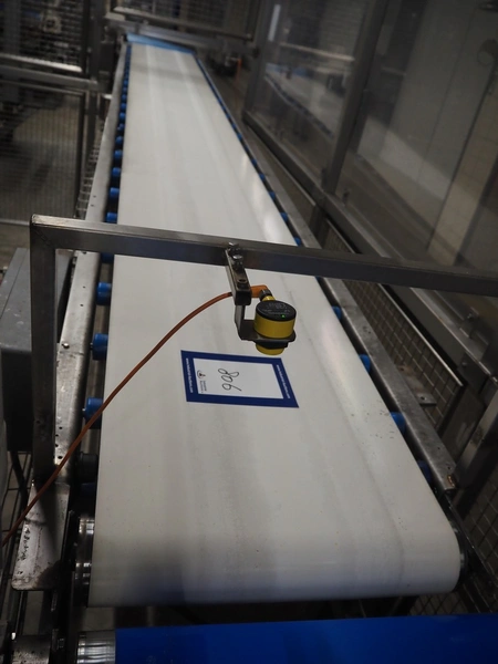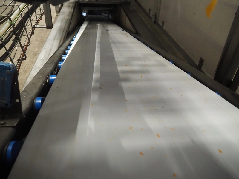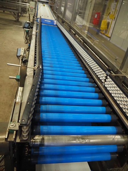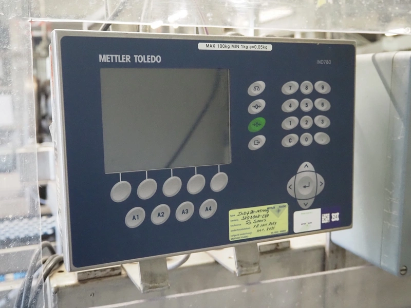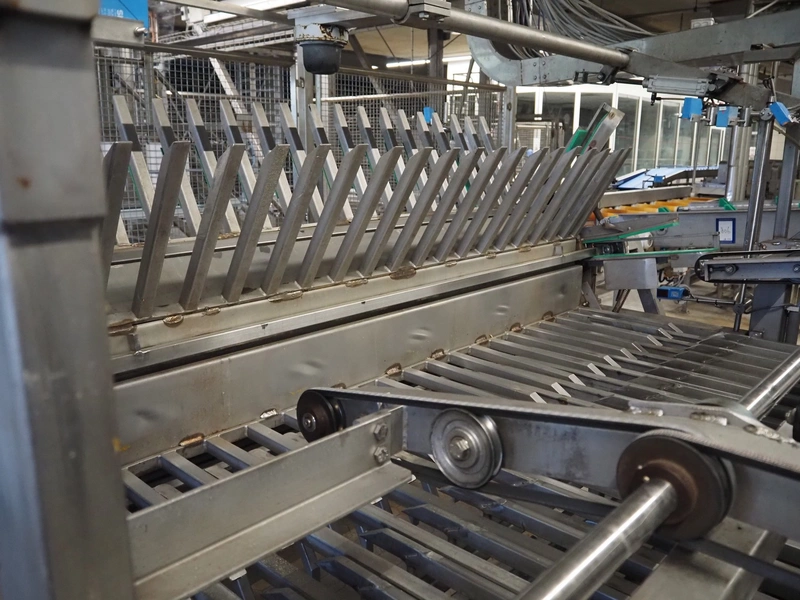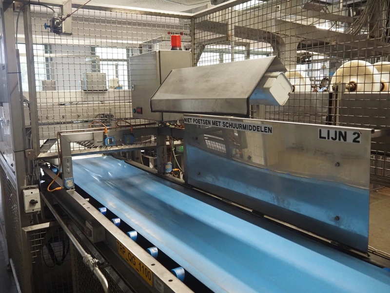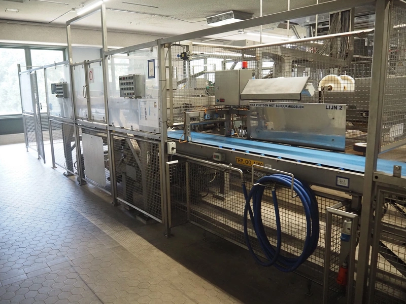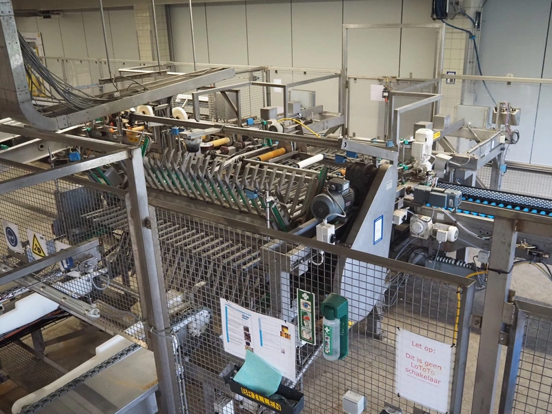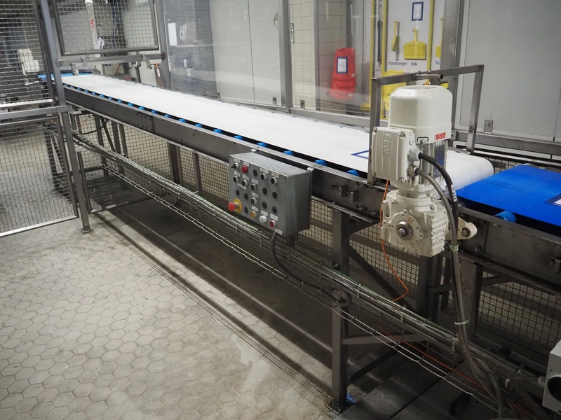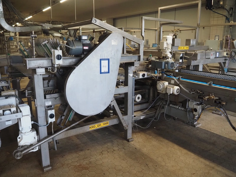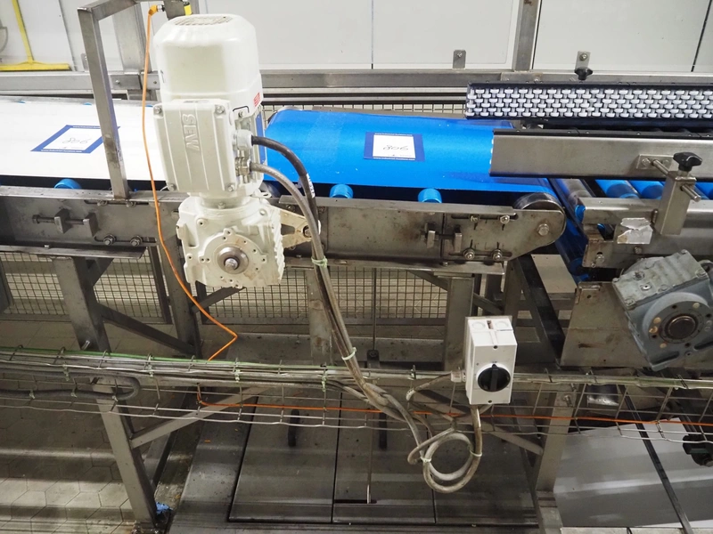 Cheese wheel tilting line, consisting of: Tilting device for cheese wheels with outfeed belt for wooden cheese boards, dimensions: 4200 mm x 3100 mm x 2050 mm, infeed belt for separate cheese wheels, 90° curve conveyor, plastic belt, belt width: 600 mm, electric driven roller conveyor, roller width: 500 mm, total dimensions: 3500 mm x 1300 mm x 1400 mm, scanning and weighing machine, plastic belt, belt width: 500 mm, total dimensions: 3300 mm x 1200 mm x 1900 mm, lane dividing belt, plastic belt, belt width: 500 mm, total dimensions: 2400 mm x 950 mm x 1700 mm, electric driven roller conveyor, plastic rollers, roller width: 500 mm, total dimensions: 2900 mm x 950 mm x 1150 mm, elevating belt, plastic belt, belt width: 500 mm, elevating height: 1300 mm, total dimensions: 5000 mm x 1000 mm x 1600 mm, roller conveyor for cheese boards, plastic rollers, roller width: 460 mm, total dimensions: 5800 mm x 800 mm x 800 mm, de-elevating belt for cheese boards, plastic chain conveyor with dividers, belt width: 1690 mm, distance between dividers: 420 mm, divider height: 100 mm, de-elevation: 1400 mm to 1100 mm, total dimensions: 3600 mm x 2200 mm x 1700 mm, roller conveyor for cheese boards, plastic rollers, roller width: 450 mm, total dimensions: 3400 mm x 900 mm x 1250 mm, outfeed belt, plastic belt, belt width: 500 mm, total dimensions: 4500 mm x 700 mm x 850 mm, and with various safety fences.