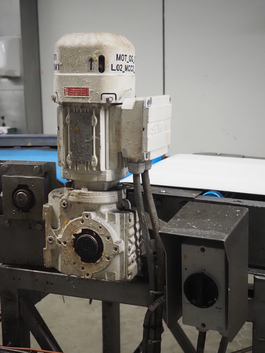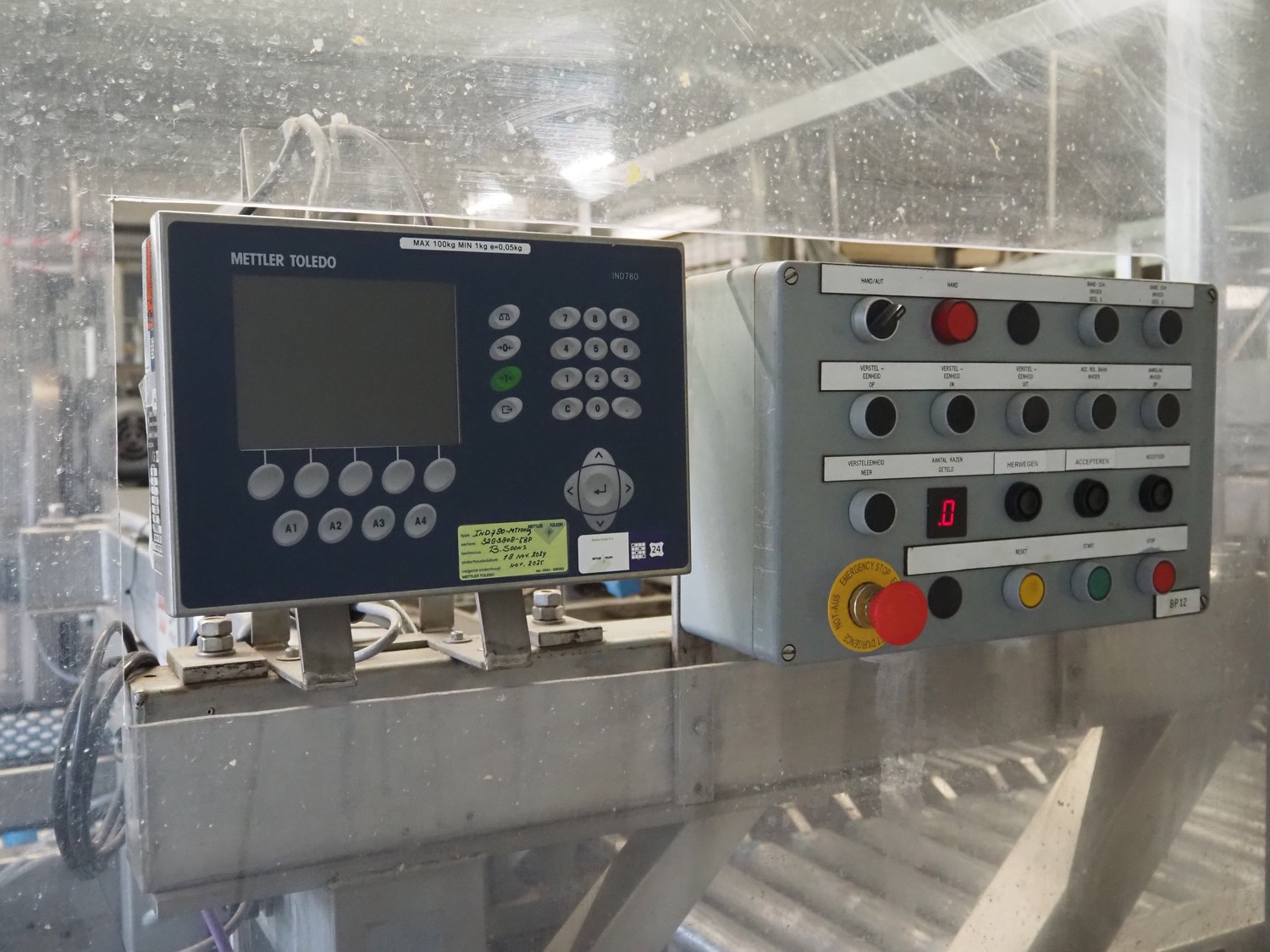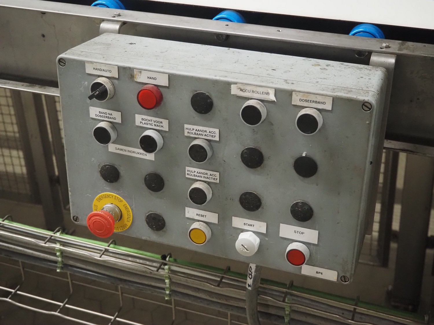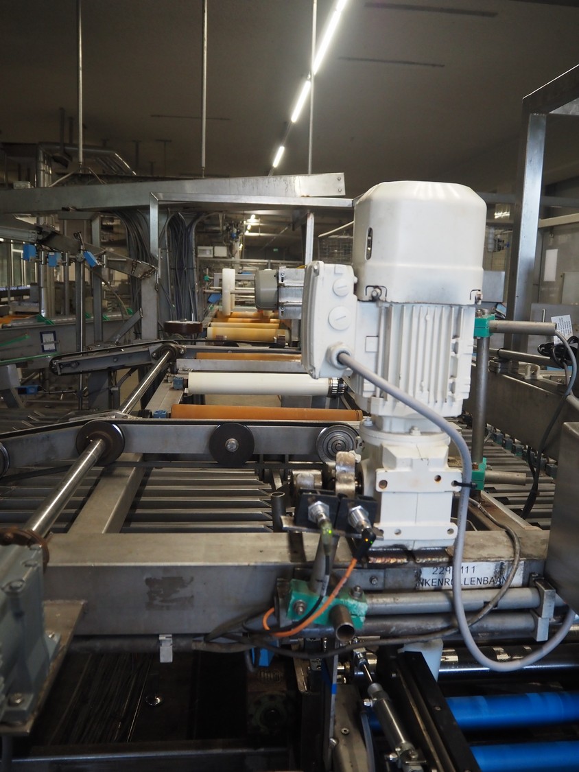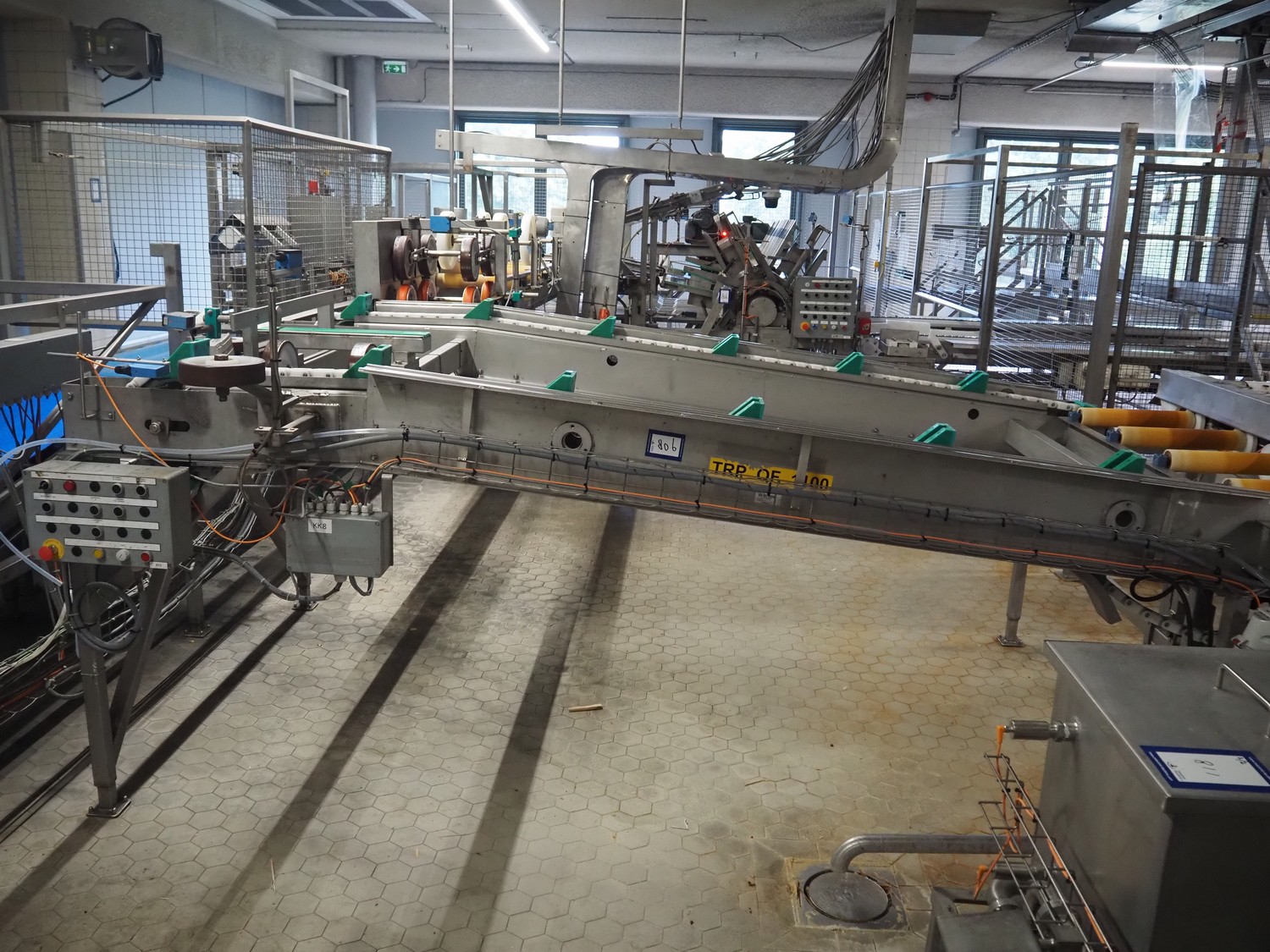 Cheese wheel tilting line, consisting of: Tilting device for cheese wheels with outfeed belt for wooden cheese boards, dimensions: 4200 mm x 3100 mm x 2050 mm, infeed belt for separate cheese wheels, 90° curve conveyor, plastic belt, belt width: 600 mm, electric driven roller conveyor, roller width: 500 mm, total dimensions: 3500 mm x 1300 mm x 1400 mm, scanning and weighing machine, plastic belt, belt width: 500 mm, total dimensions: 3300 mm x 1200 mm x 1900 mm, lane dividing belt, plastic belt, belt width: 500 mm, total dimensions: 2400 mm x 950 mm x 1700 mm, electric driven roller conveyor, plastic rollers, roller width: 500 mm, total dimensions: 2900 mm x 950 mm x 1150 mm, elevating belt, plastic belt, belt width: 500 mm, elevating height: 1300 mm, total dimensions: 5000 mm x 1000 mm x 1600 mm, roller conveyor for cheese boards, plastic rollers, roller width: 460 mm, total dimensions: 5800 mm x 800 mm x 800 mm, de-elevating belt for cheese boards, plastic chain conveyor with dividers, belt width: 1690 mm, distance between dividers: 420 mm, divider height: 100 mm, de-elevation: 1400 mm to 1100 mm, total dimensions: 3600 mm x 2200 mm x 1700 mm, roller conveyor for cheese boards, plastic rollers, roller width: 450 mm, total dimensions: 3400 mm x 900 mm x 1250 mm, outfeed belt, plastic belt, belt width: 500 mm, total dimensions: 4500 mm x 700 mm x 850 mm, and with various safety fences.