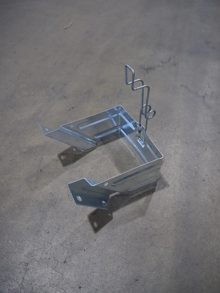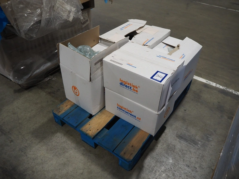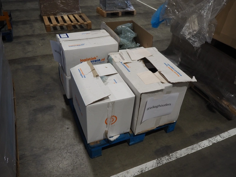 Pallet with 5 wheel chock brackets, dimensions: 1200 mm x 800 mm x 450 mm.