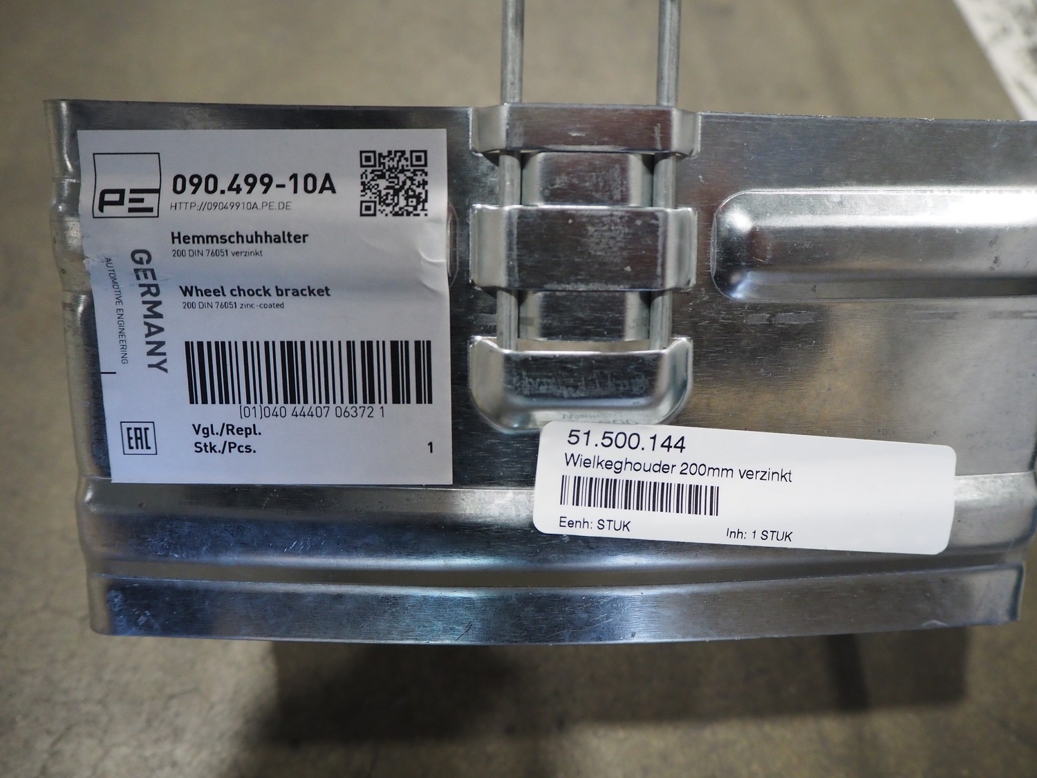 Pallet with 5 wheel chock brackets, dimensions: 1200 mm x 800 mm x 450 mm.