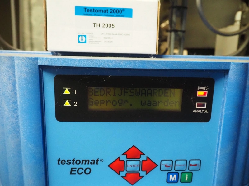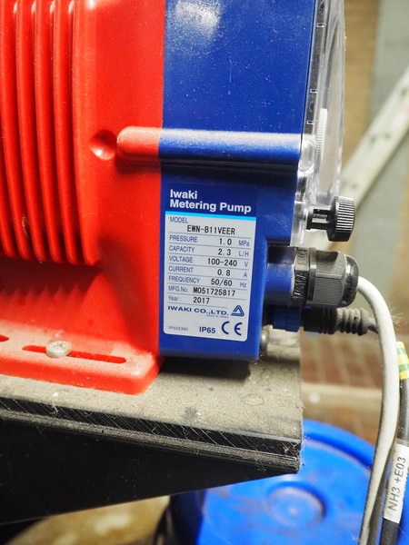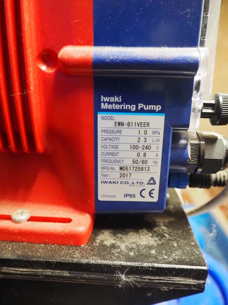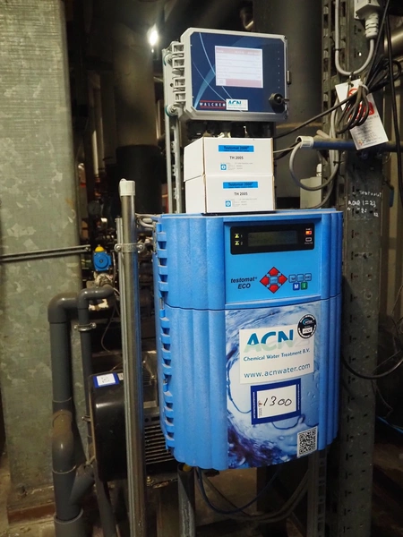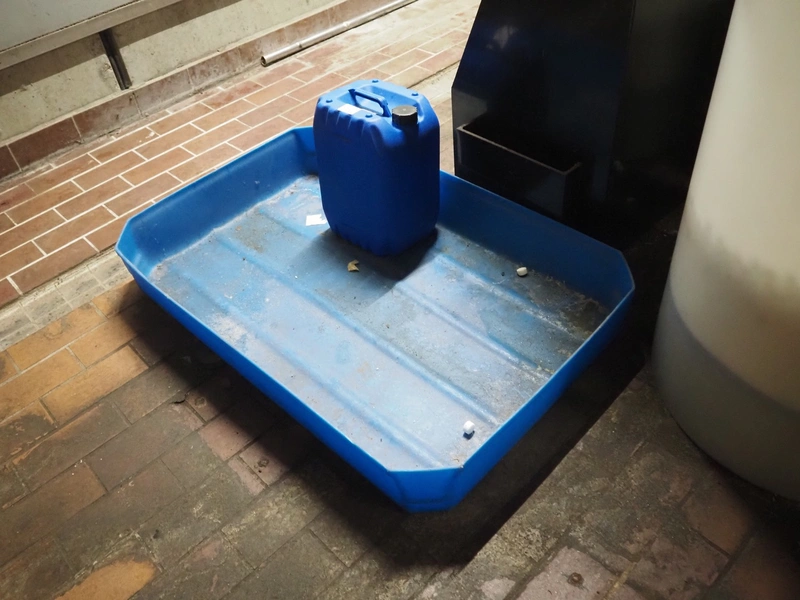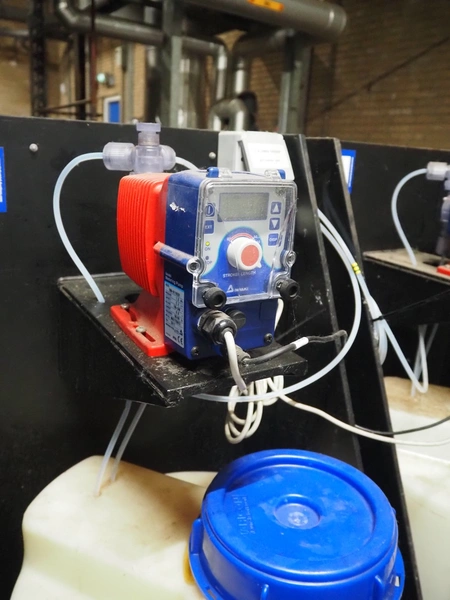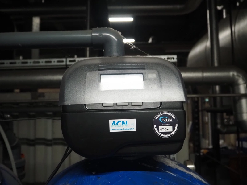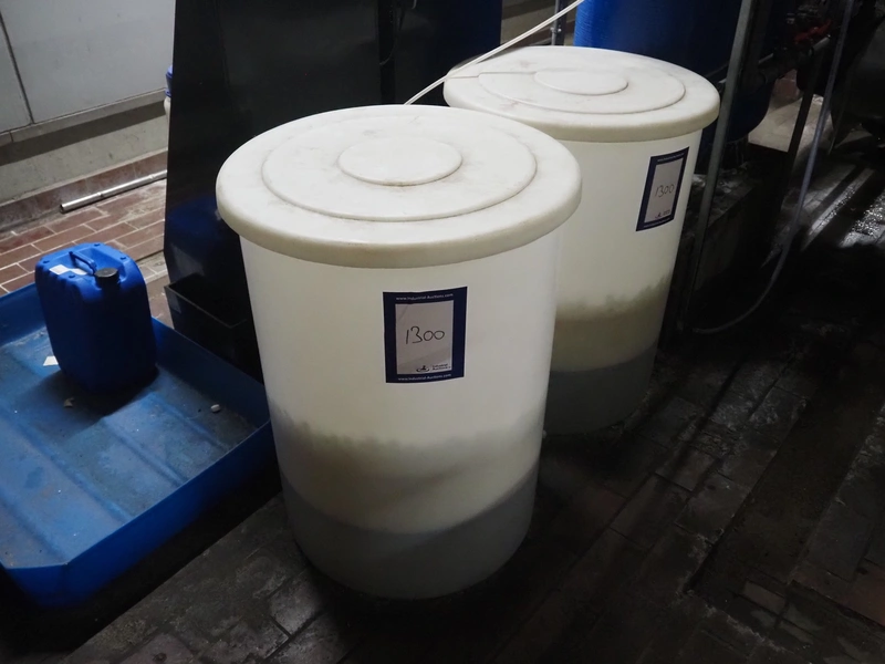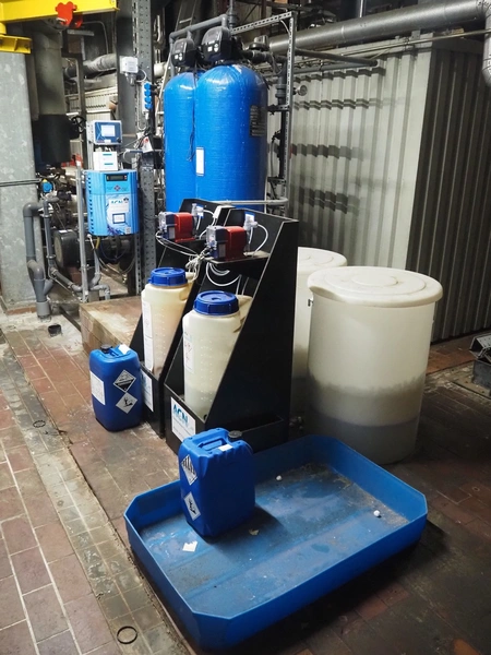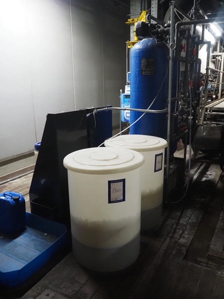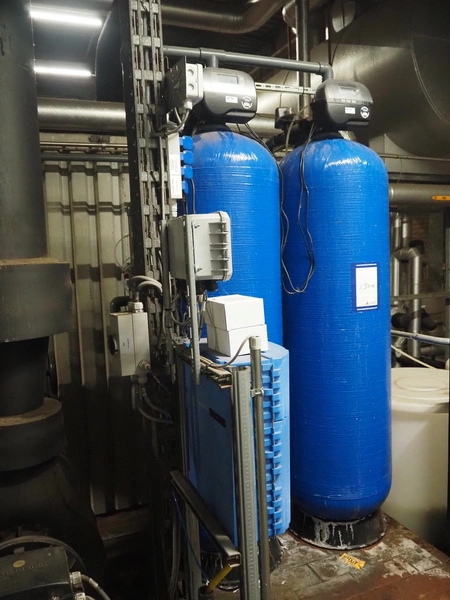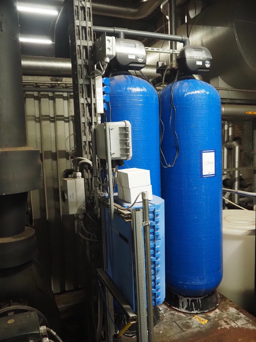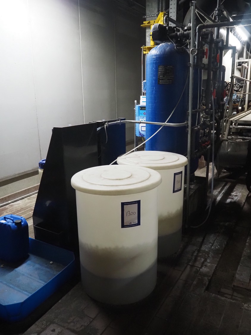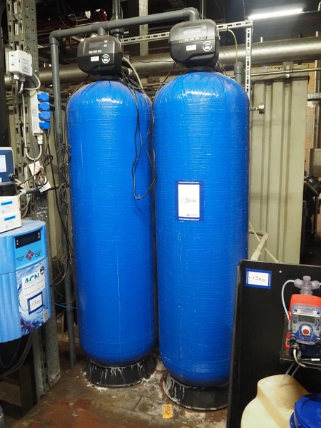 Walchem water softener installation consisting of 2 Polyethylene cylinders, dimensions: ø 450 mm x 1900 mm, 2 chemical dosing installation with Iwaki metering pumps, dimensions: (2x) 500 mm x 500 mm x 1350 mm and 2 plastic tubs for salt bricks, dimensions: (2x) ø 700 mm x 950 mm.