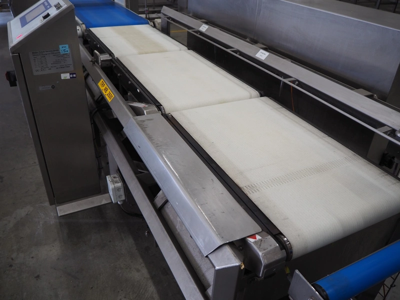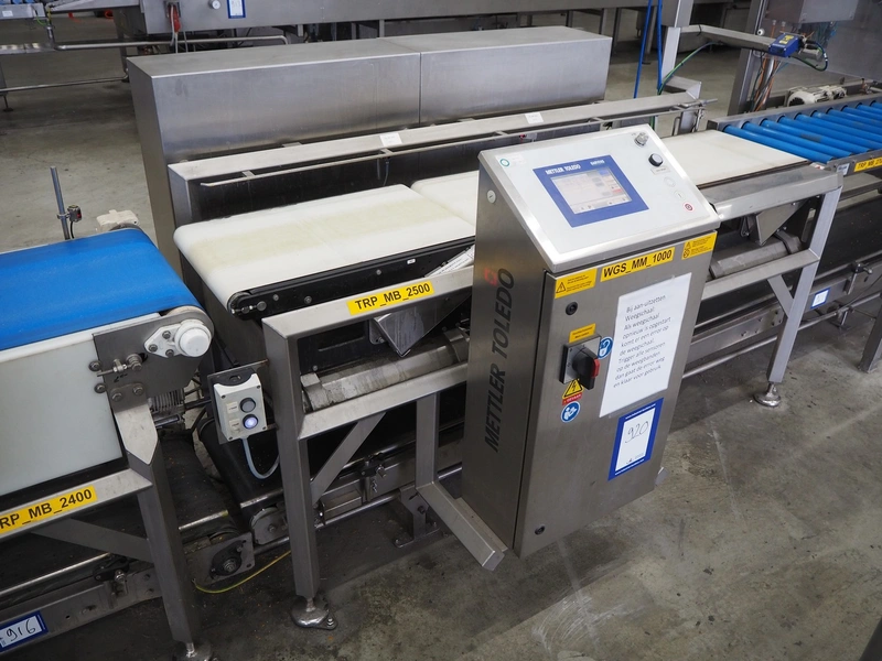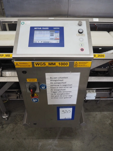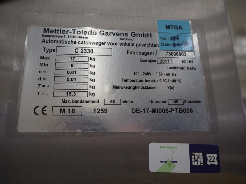 Mettler Toledo checkweigher, type: C2330, fabrication number: 73000003, year of construction: 2017, 100-240 V, 50-60 Hz, maximum weight: 17 kg, minimum weight: 8 kg, e=d=: 0.01 kg, T=- 15.3 kg, maximum belt speed: 40 meter per minute, capacity: 59 pieces per minute, plastic belt, belt width: 400 mm, total dimensions: 2000 mm x 1400 mm x 1700 mm.