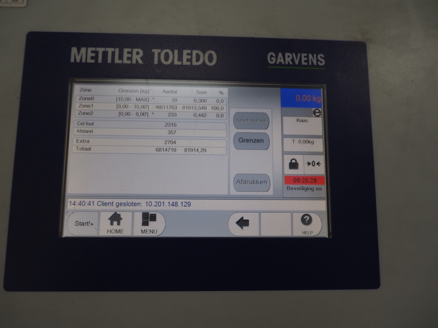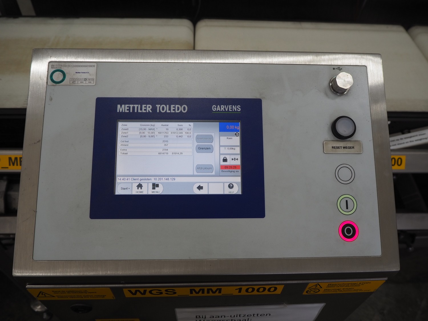 Mettler Toledo checkweigher, type: C2330, fabrication number: 73000003, year of construction: 2017, 100-240 V, 50-60 Hz, maximum weight: 17 kg, minimum weight: 8 kg, e=d=: 0.01 kg, T=- 15.3 kg, maximum belt speed: 40 meter per minute, capacity: 59 pieces per minute, plastic belt, belt width: 400 mm, total dimensions: 2000 mm x 1400 mm x 1700 mm.