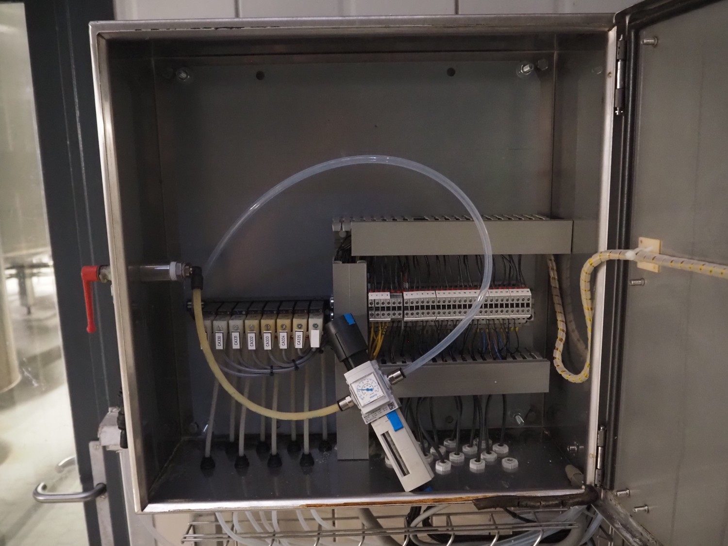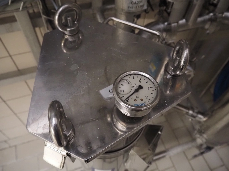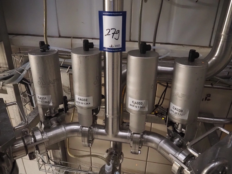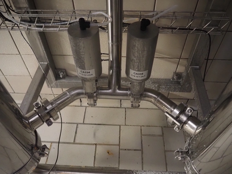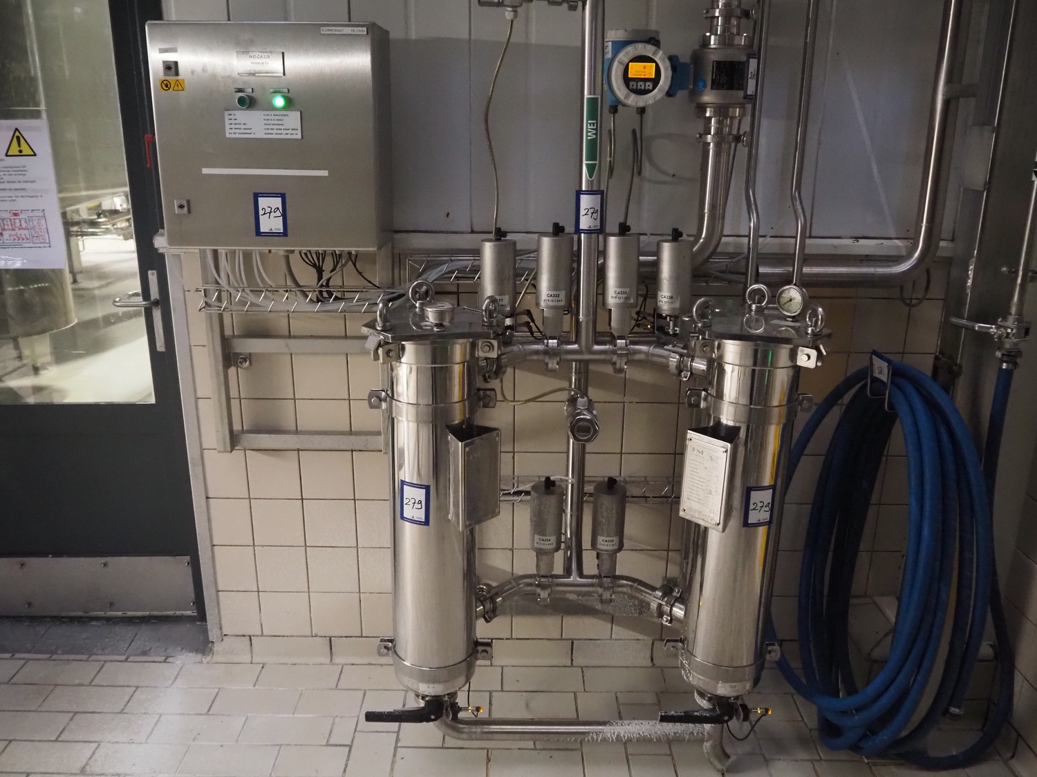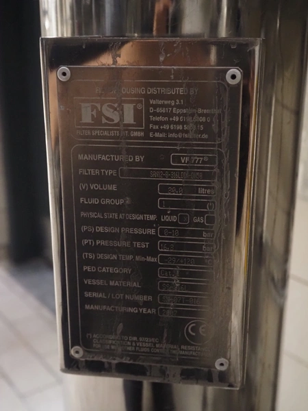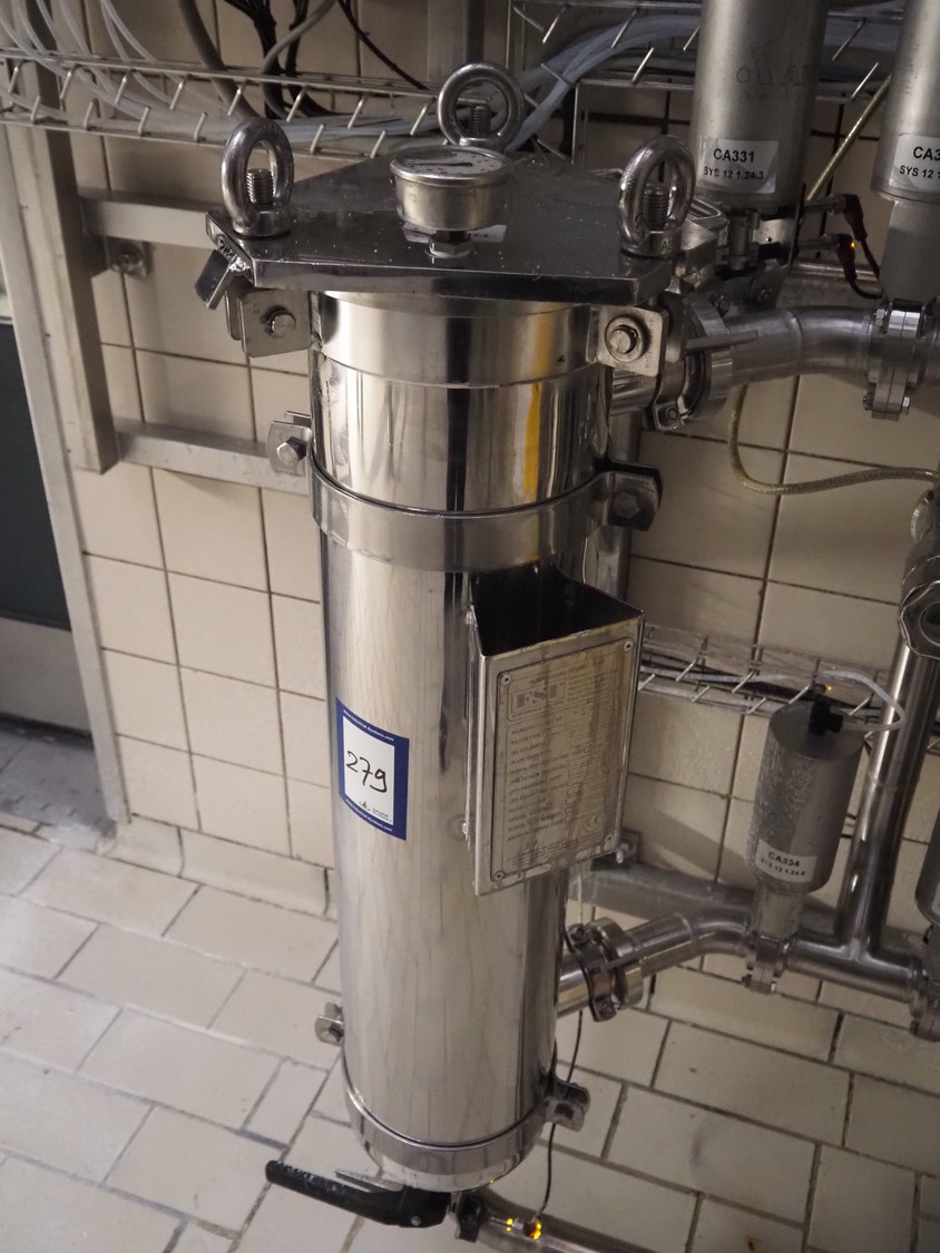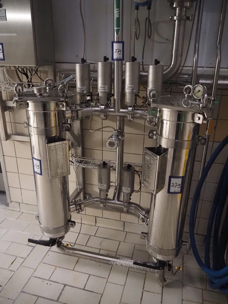 Whey concentrate filtration system consisting of 2 FSI filters, type: SAN12-8-316LDIN-DN50, 4 APV valves, dimensions: 600 mm x 1000 mm x 1800 mm.