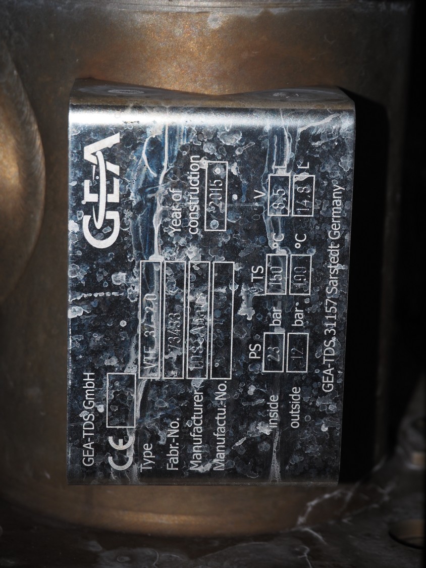 Steam valve with GEA TDS GmbH tube heat exchanger, type: VTE 39-2.0, dimensions: 600 mm x 500 mm x 2060 mm.