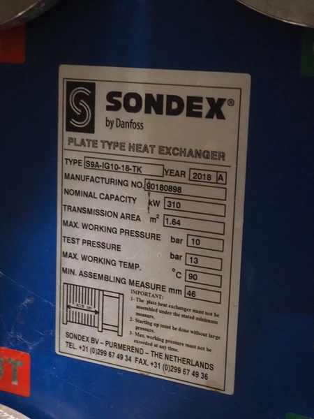 Sondex heat exchanger, type: S9A-IG10-18-TK, machine number: 90180898, year of construction: 2018, dimensions: 550 mm x 400 mm x 620 mm.