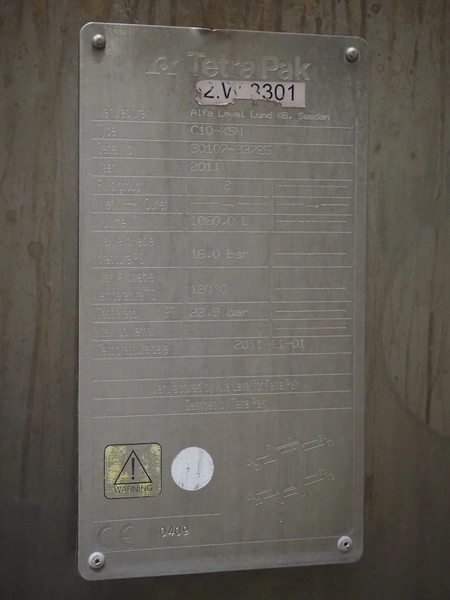 Alfa Laval plate heat exchanger, type: C10-KSM, serial number: 30107-33725, year of construction: 2011, volume: 1080 liter, dimensions: 2400 mm x 1100 mm x 2350 mm.