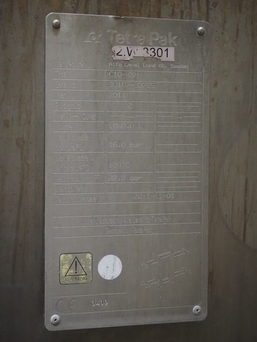 Alfa Laval plate heat exchanger, type: C10-KSM, serial number: 30107-33725, year of construction: 2011, volume: 1080 liter, dimensions: 2400 mm x 1100 mm x 2350 mm.