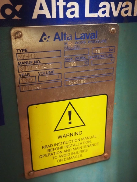 Alfa Laval plate heat exchanger, type: M6-MFM, manufacturing number: 30101-95438, year of construction: 1995, volume: 7 litre, dimensions: 500 mm x 330 mm x 920 mm.